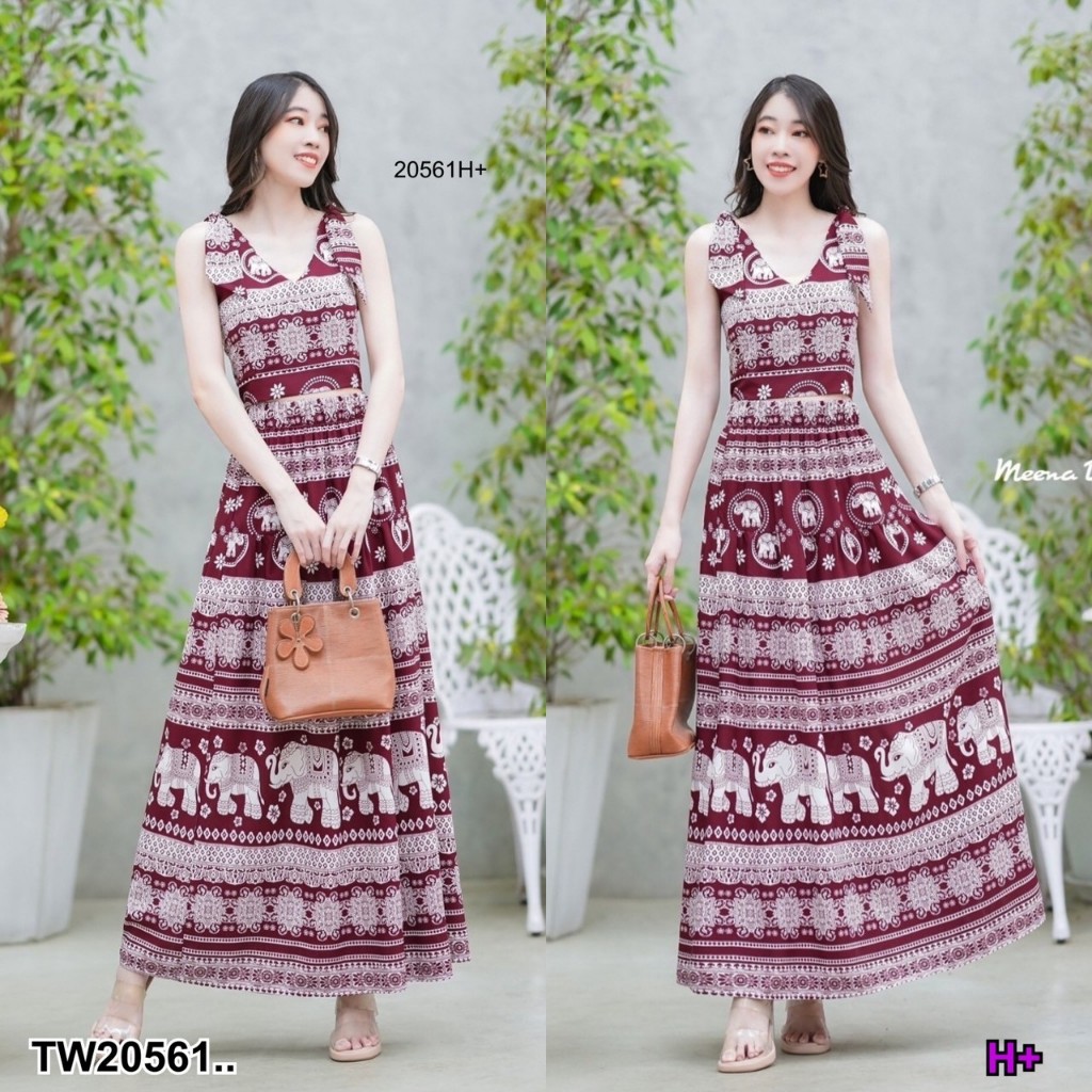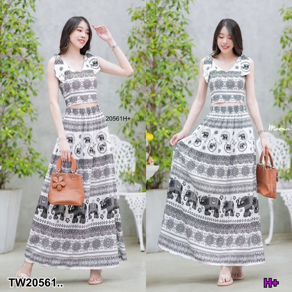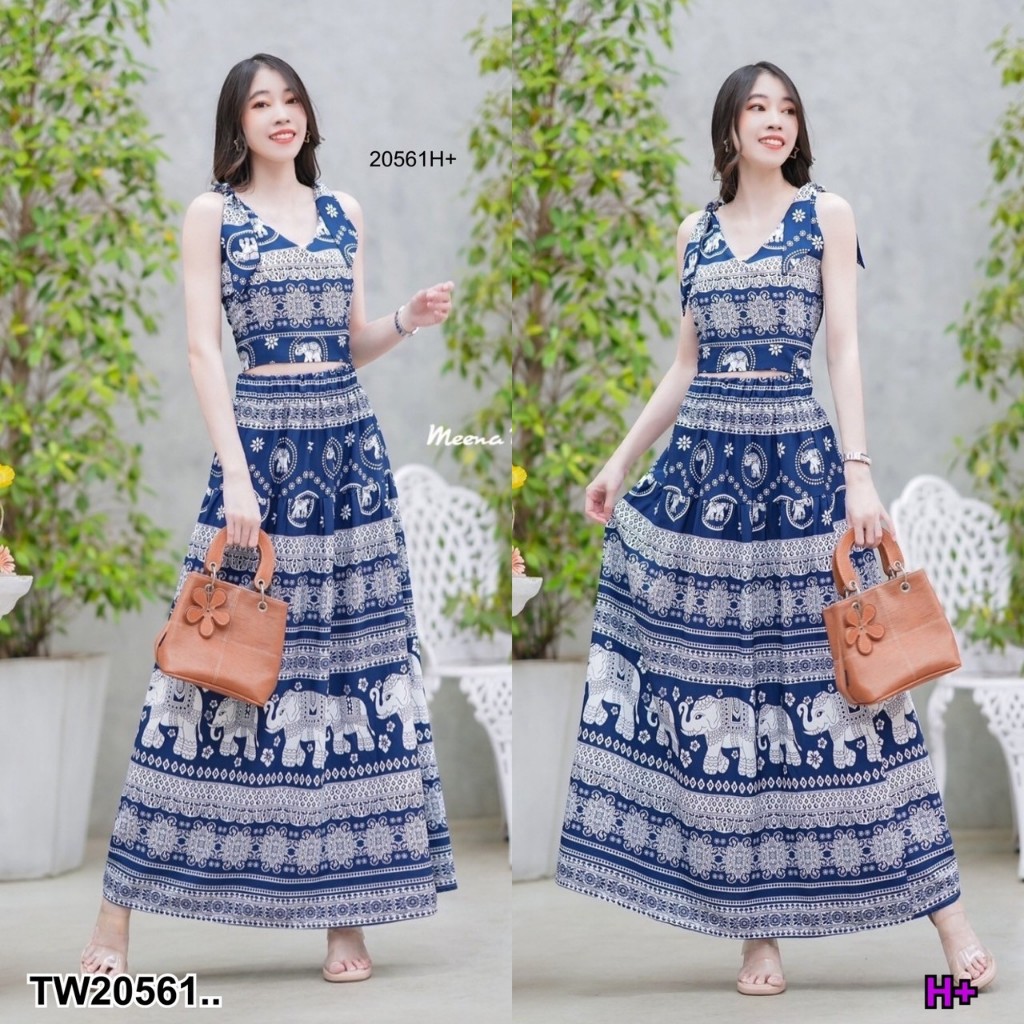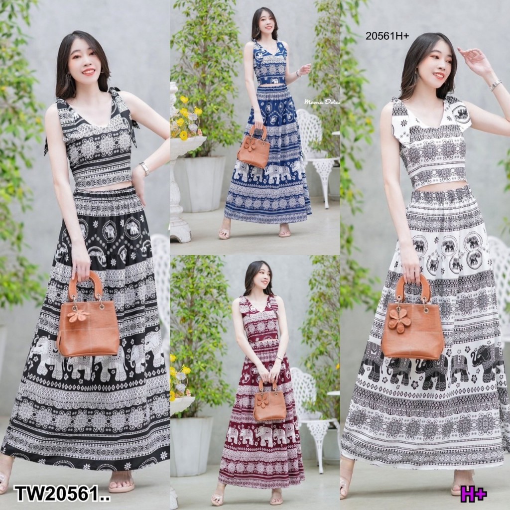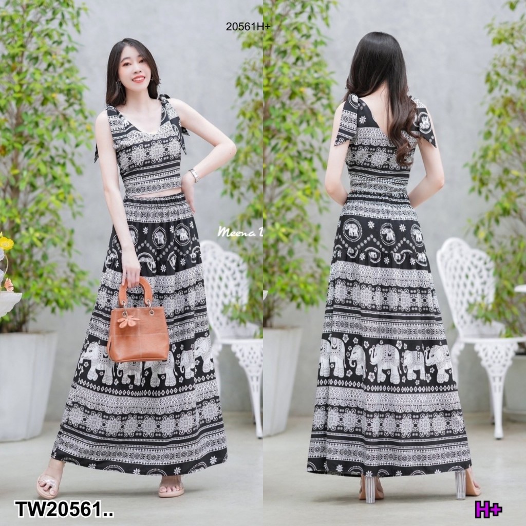 set 2 ชิ้น เสื้อผูกไหล่ลายช้างคอวึ แบบผูกเองปรับสายได้ มีซิปซ่อนด้านข้าง + กระโปรงเอวยางยืดรอบตัว ดีเทลตัดต่อย่นระบายชาย งานลายช้างสวยๆดีไซน์เกร๋ๆ สาวๆจะใส่เที่ยวสงกรานต์ ใส่ชิลล์ น่ารักมากๆเซ็กซี่เบาๆไปเลยคร้าาา