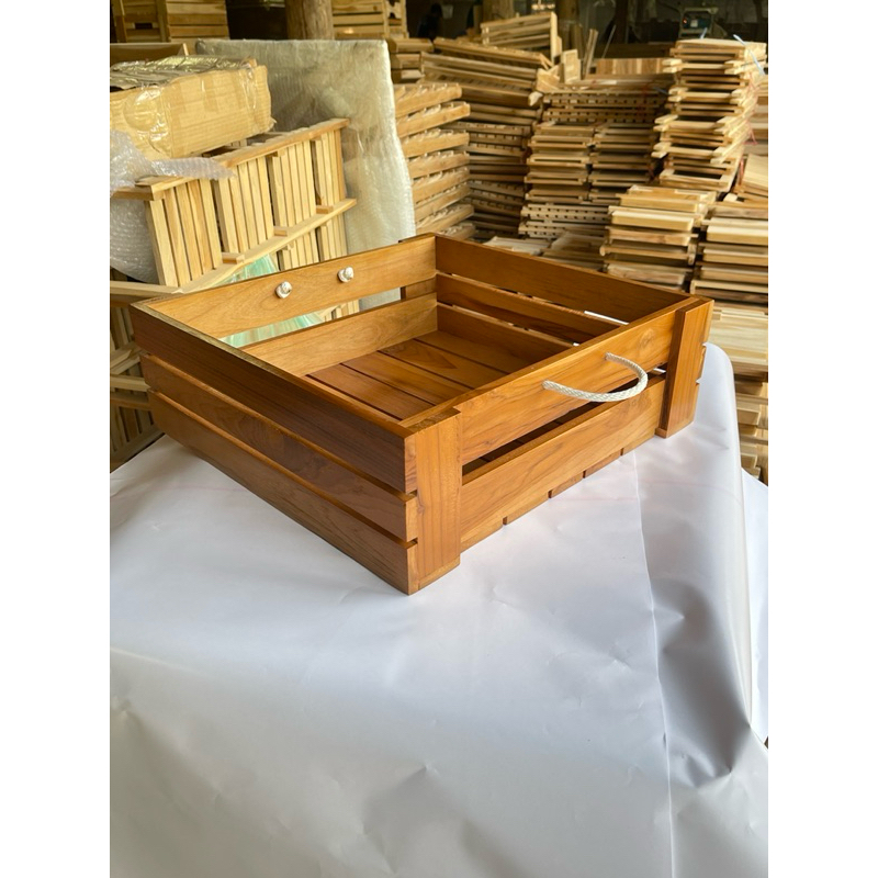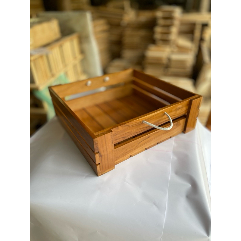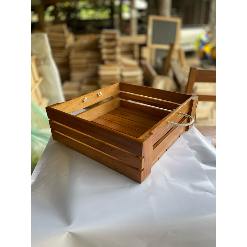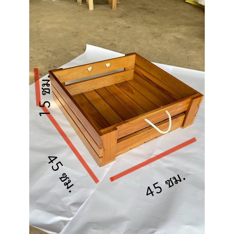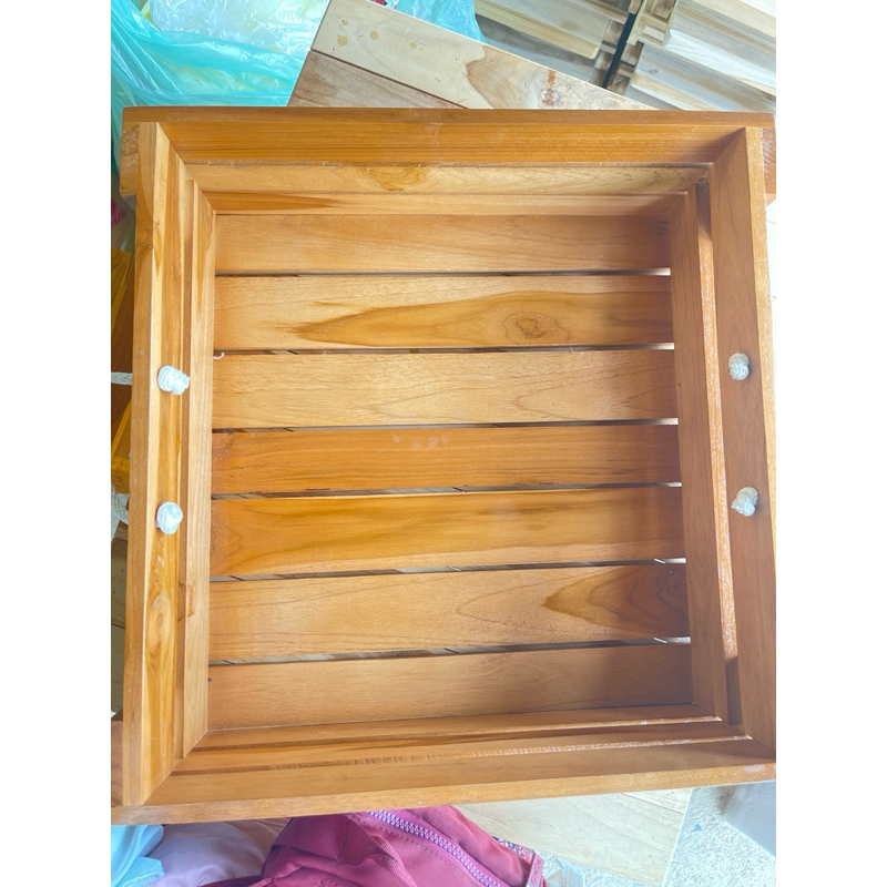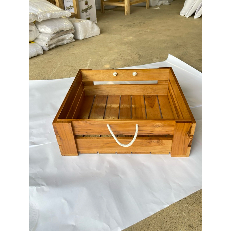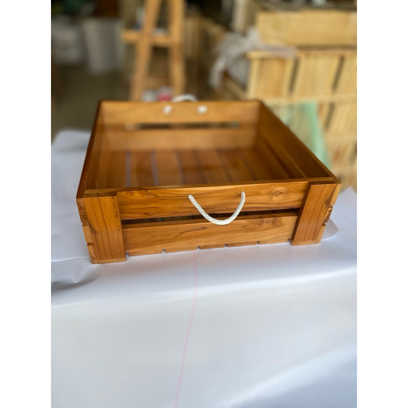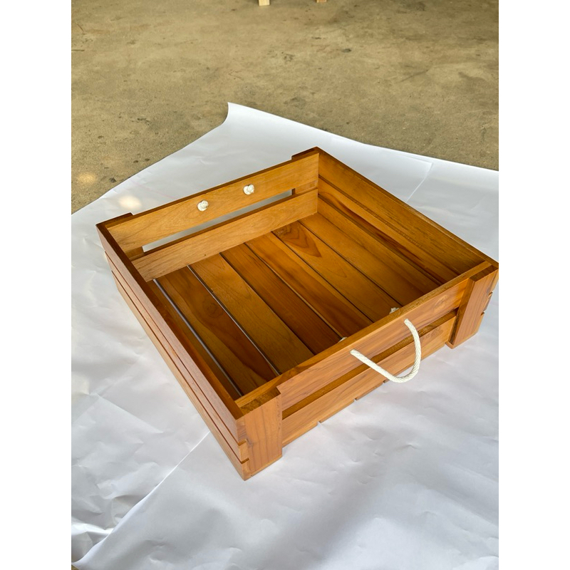 กระบะลังไม้สักแท้ทำสีเคลือบกึ่งเงากึ่งด้านขนาด45*45*15ซม.มีเชือกร้อยไว้สำหรับเป็นหูหิ้วสวยงามสไตล์มินิมอล