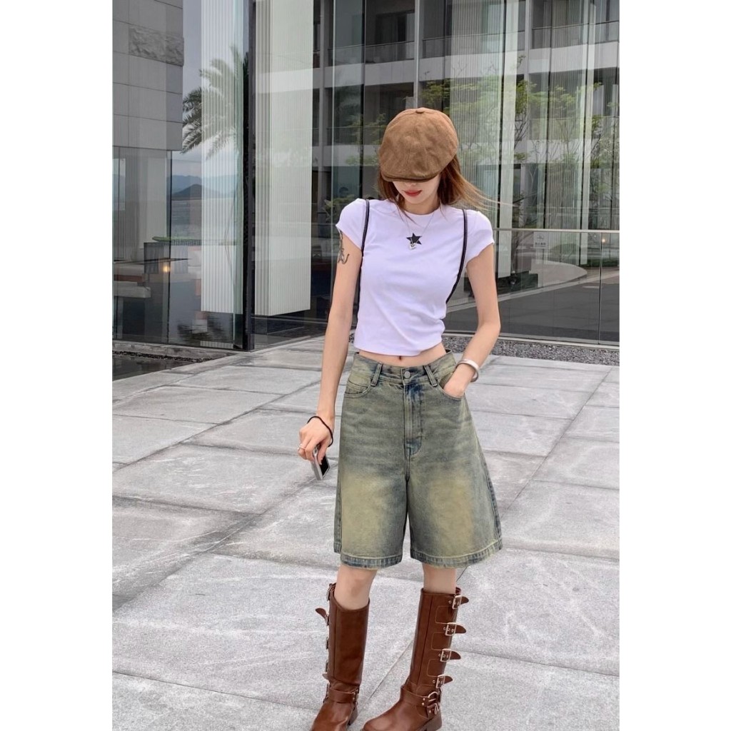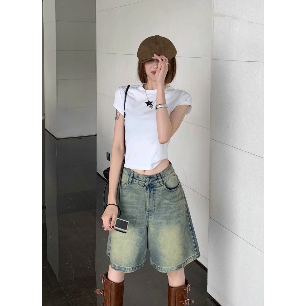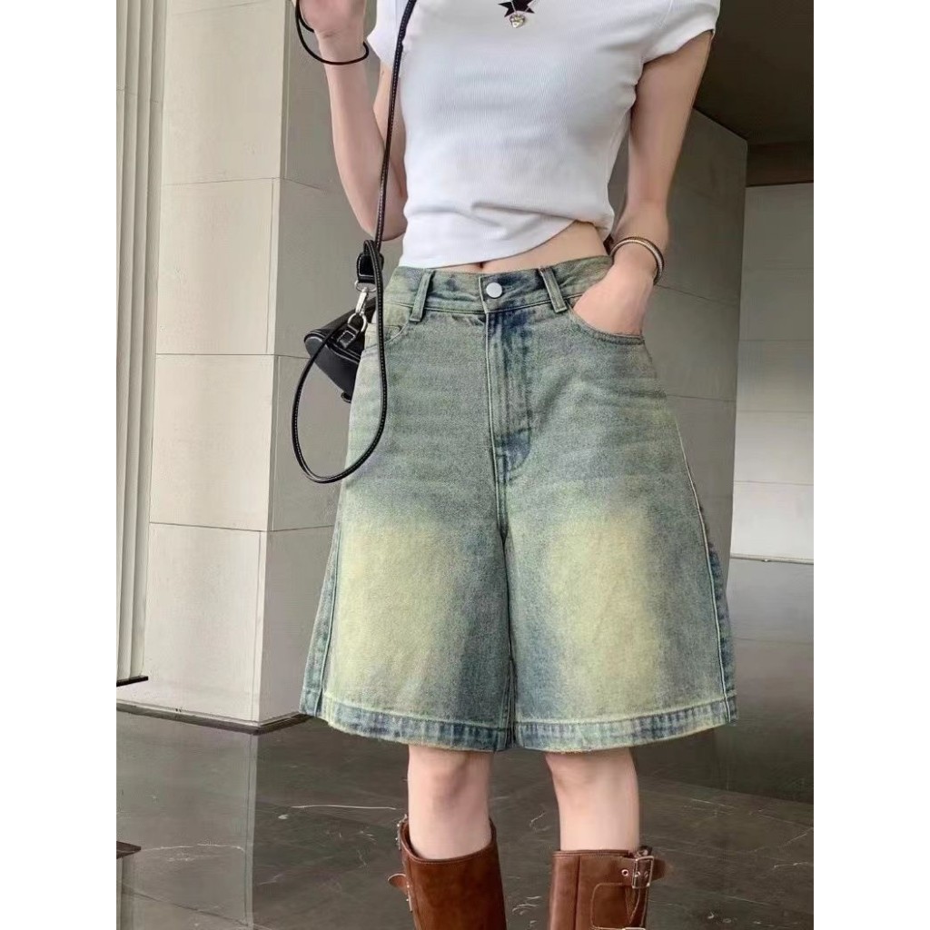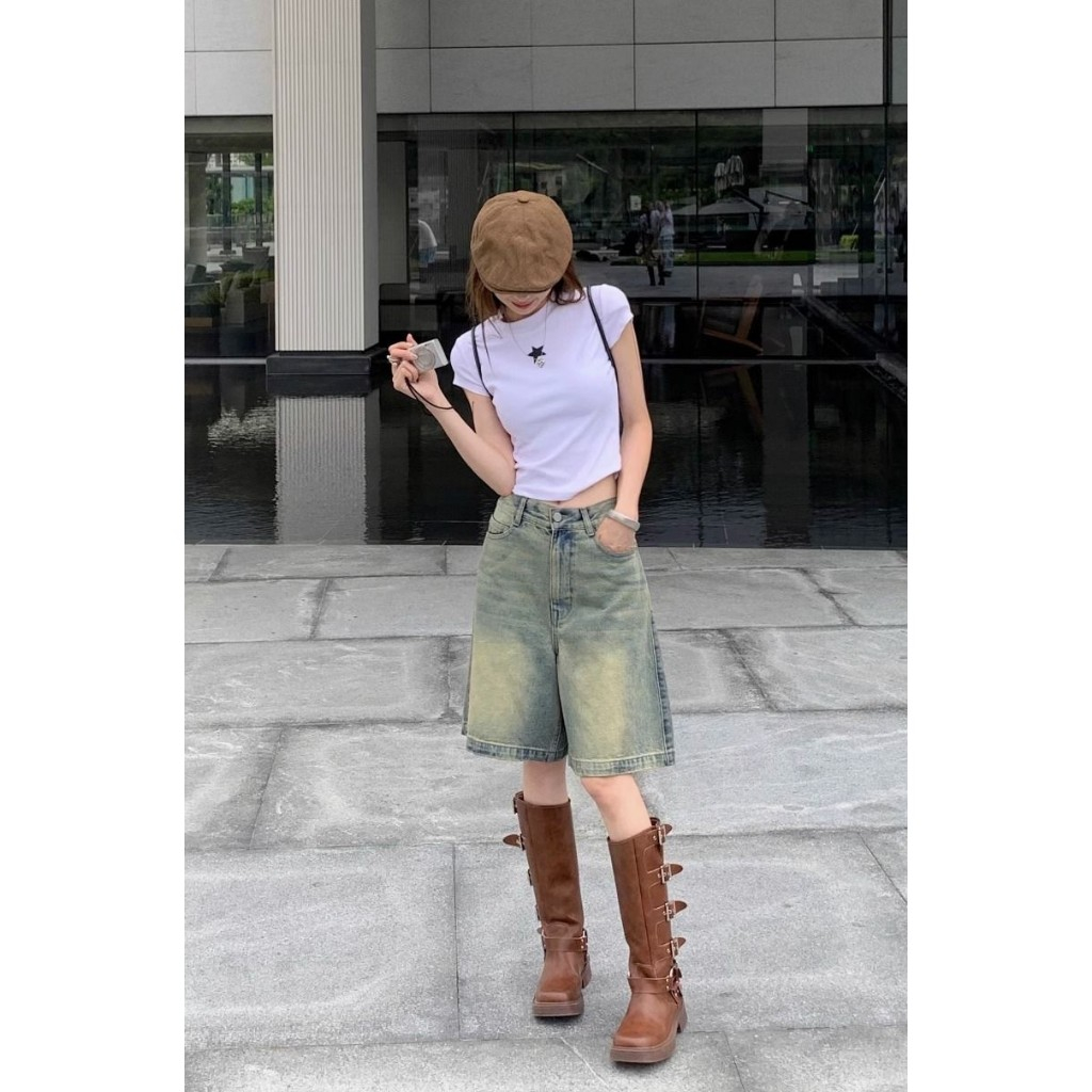 Korean กางเกงครึ่งขา รูปทรงเท่ สไตล์เกาหลี ผ้ายีนส์แท้ ฟอกสีอ่อน ใส่ได้ทั้งหญิงและชาย J040