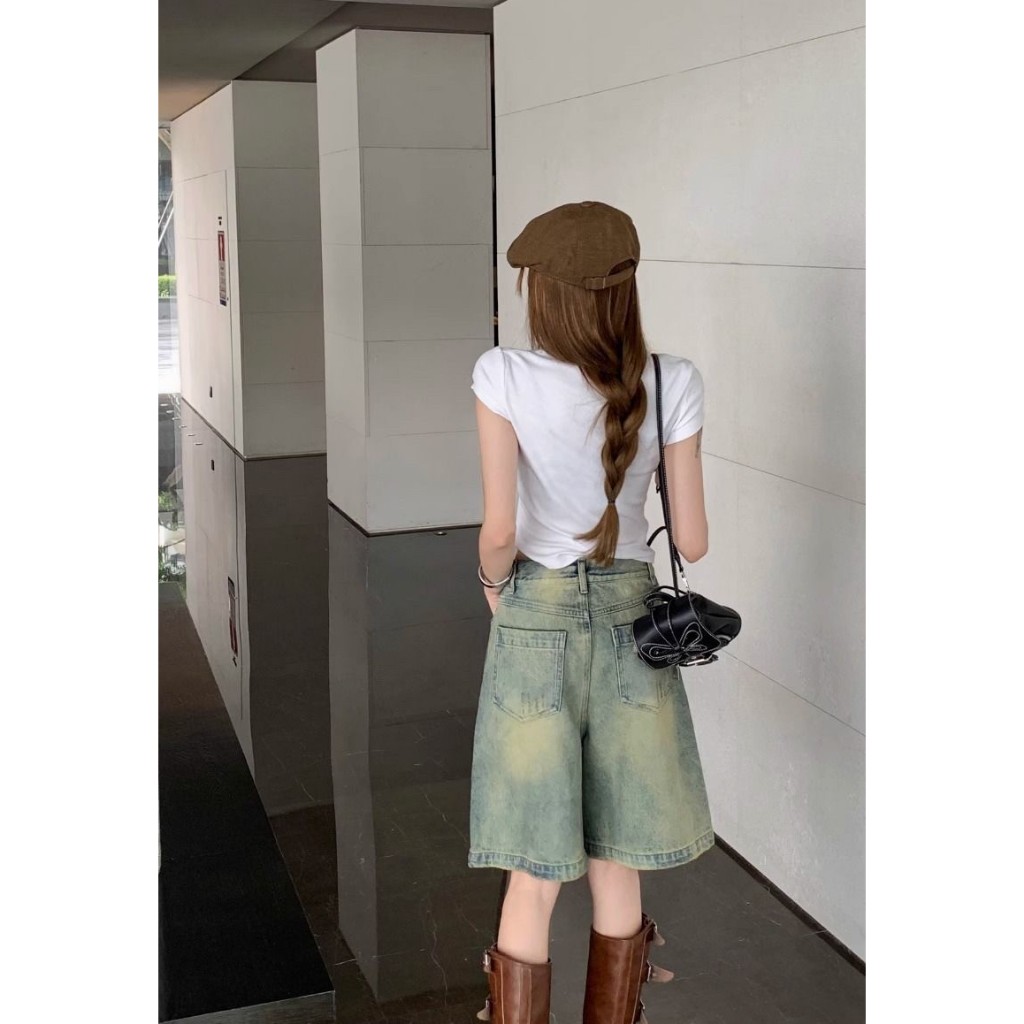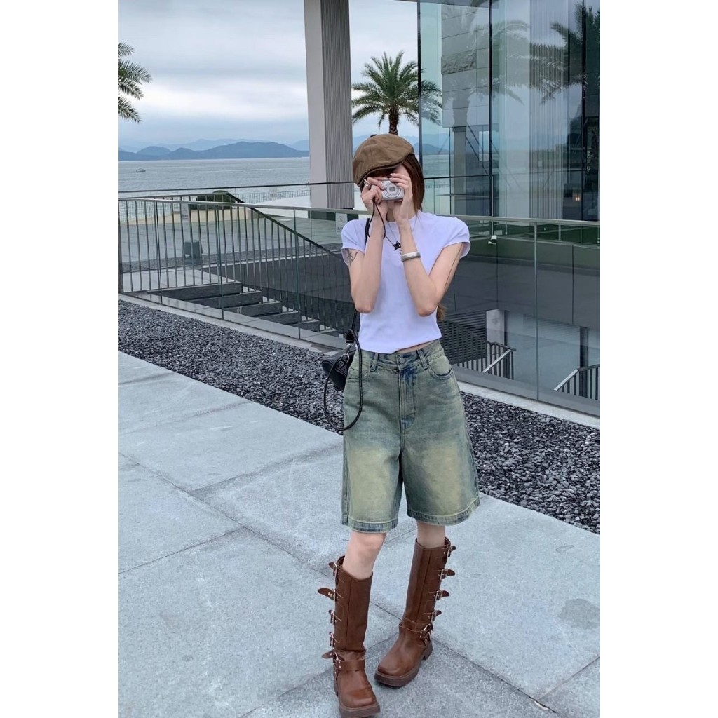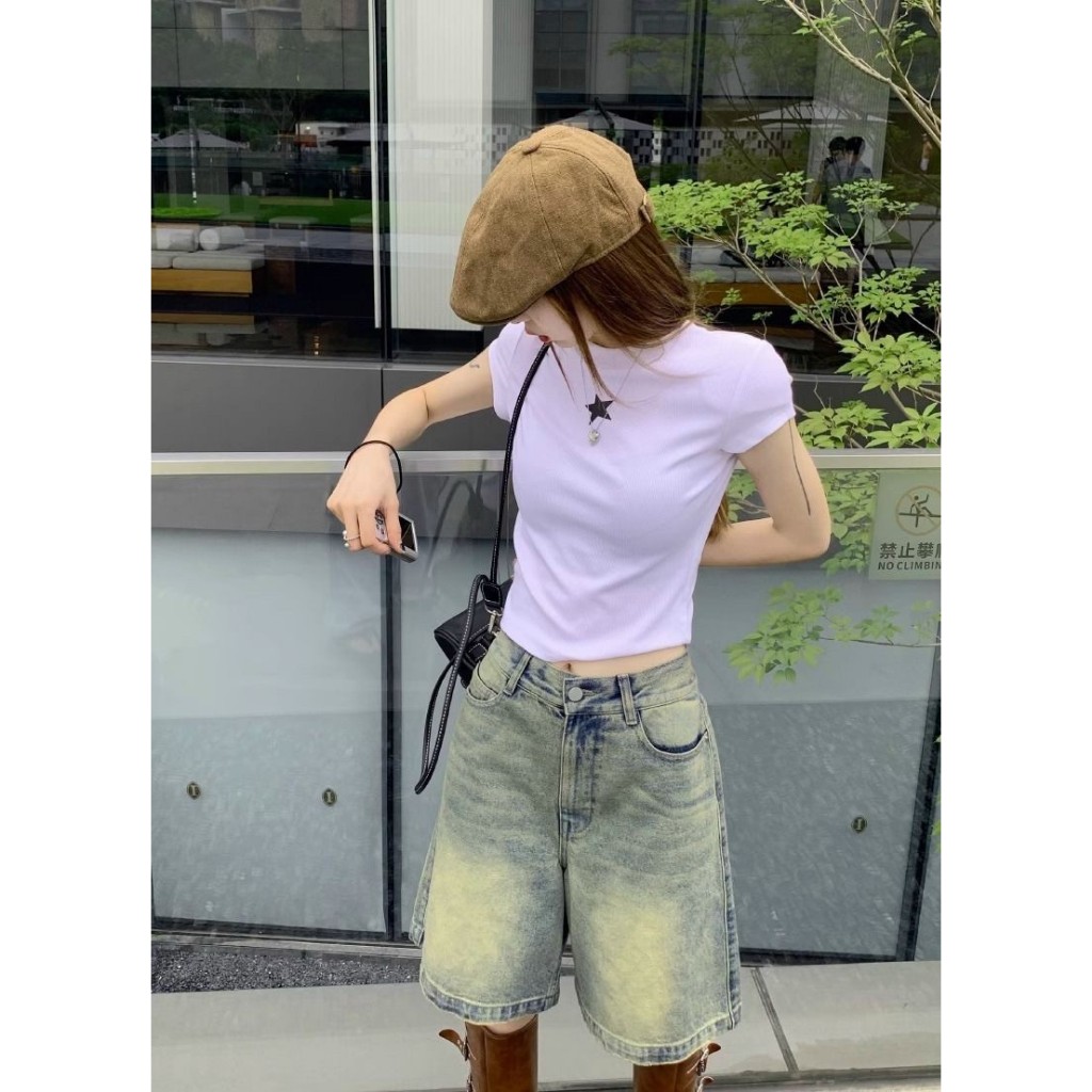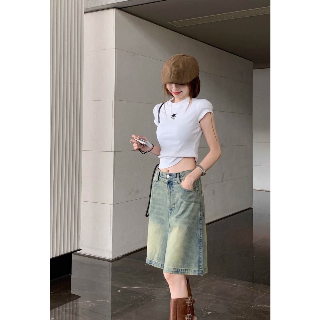 Korean กางเกงครึ่งขา รูปทรงเท่ สไตล์เกาหลี ผ้ายีนส์แท้ ฟอกสีอ่อน ใส่ได้ทั้งหญิงและชาย J040