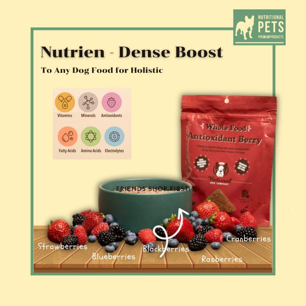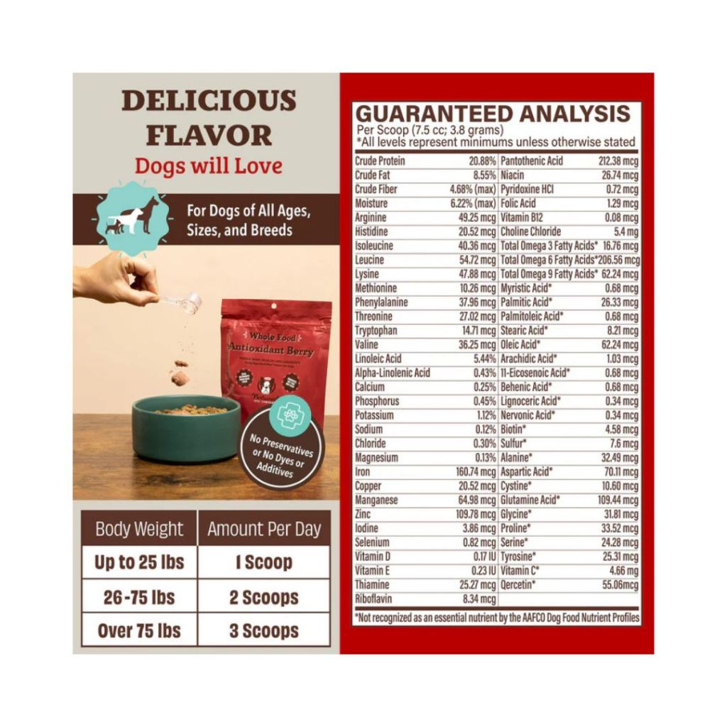 ท็อปเปอร์มื้ออาหาร Superfood ที่เต็มไปด้วยสารอาหาร ! ให้สุนัขของคุณมีสุขภาพที่ดีที่สุดด้วย Antioxidant Berry Granules ซึ่งเป็นวิตามินรวมจากธรรมชาติ อัดแน่นไปด้วยส่วนผสมที่อุดมไปด้วยสารต้านอนุมูลอิสระ เช่น บลูเบอร์รี่ แครนเบอร์รี่ แบล็กเบอร์รี่ ราสเบอร์รี่
