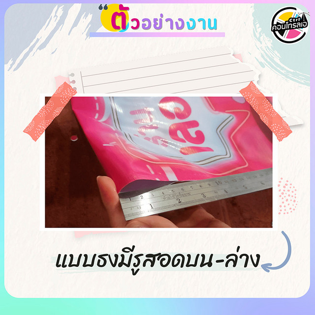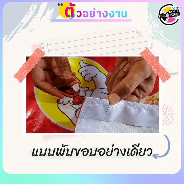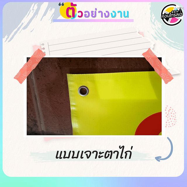 – พับขอบ+ตาไก่ คือ ทางร้านจะพับขอบเก็บงานและเจาะตาไก่ให้ฟรี เหมาะสำหรับนำไปร้อยเชือก / แขวนได้เลย