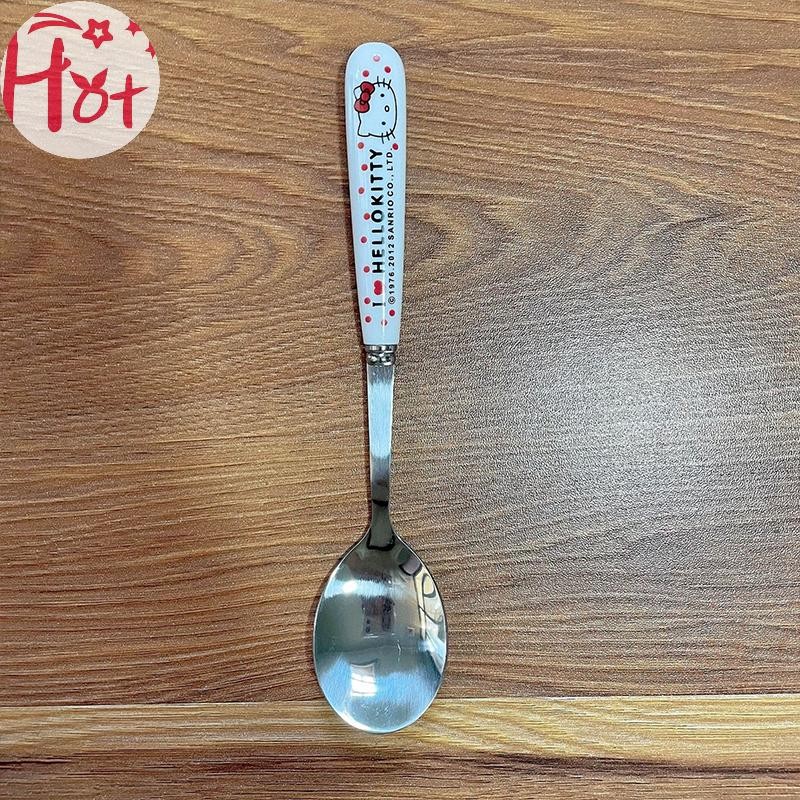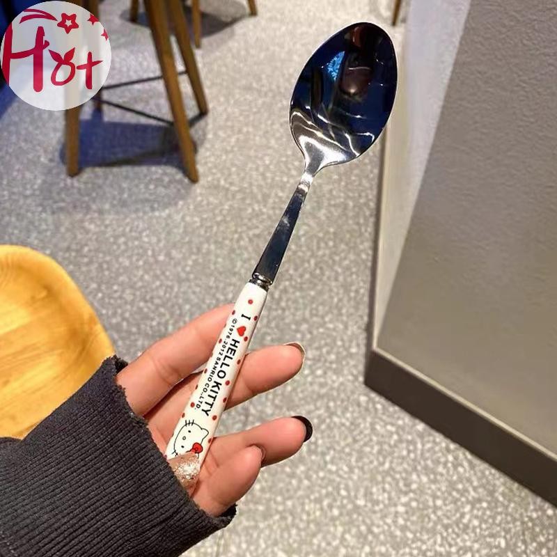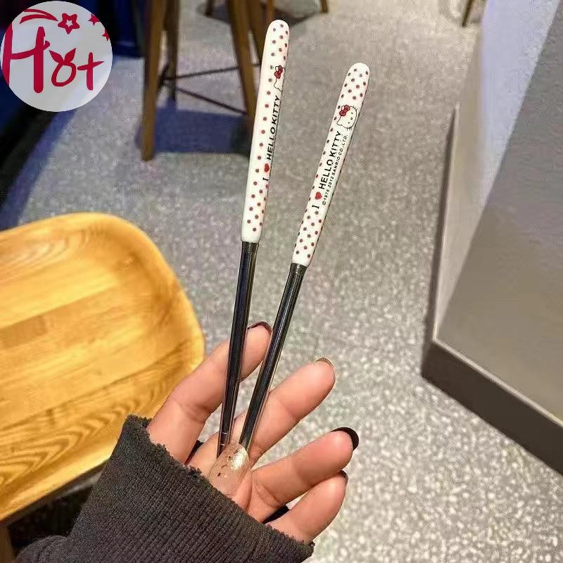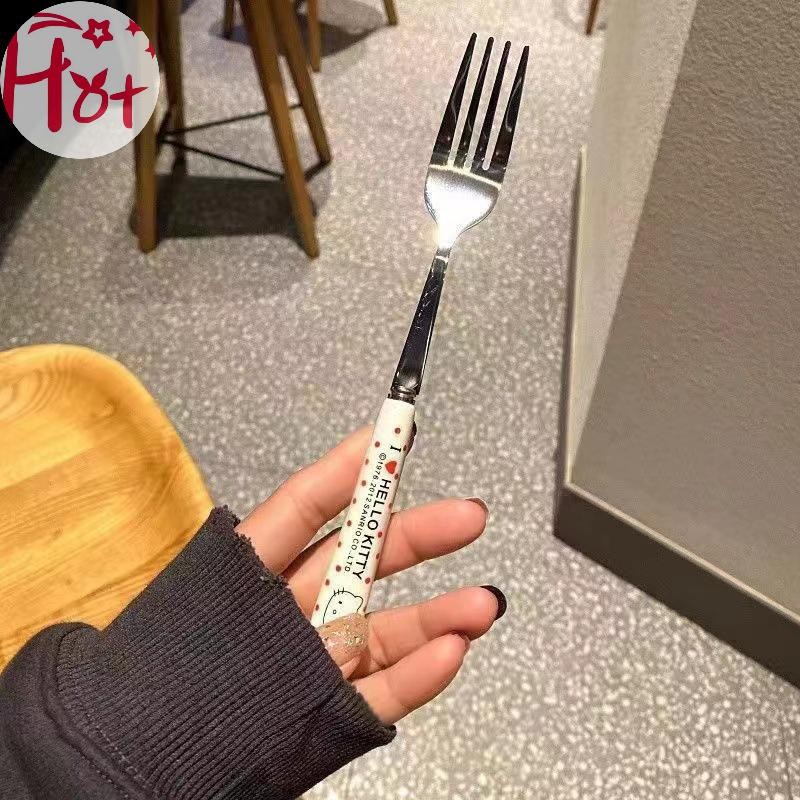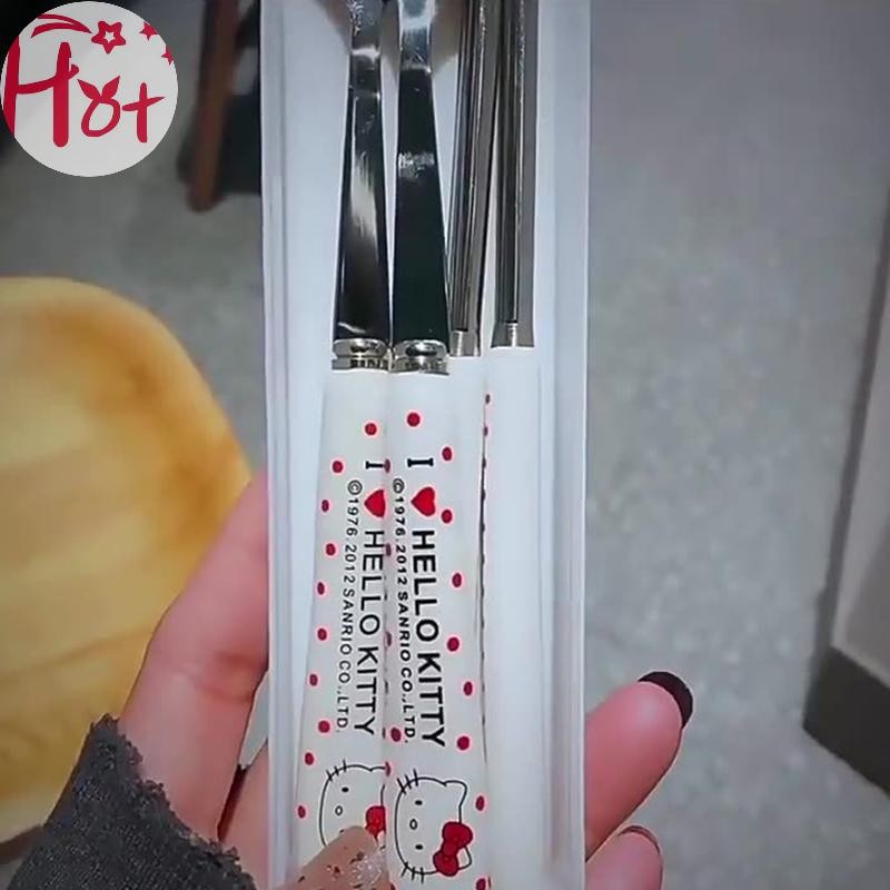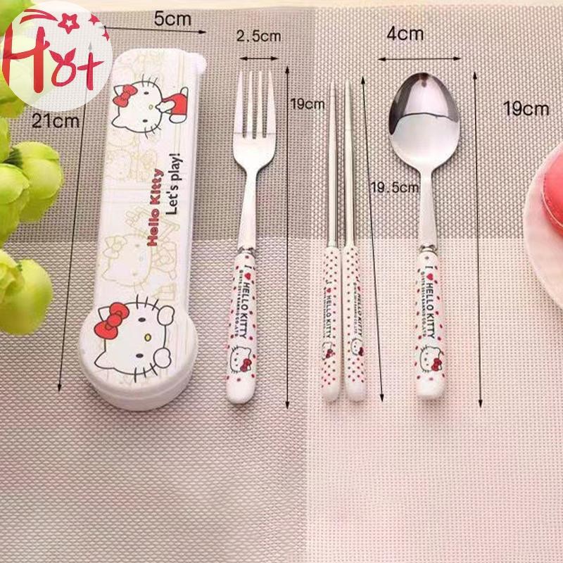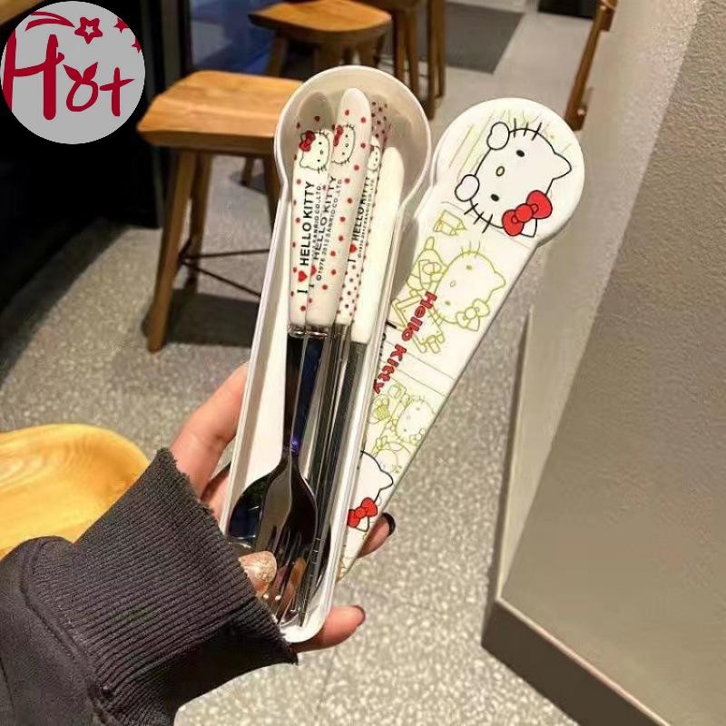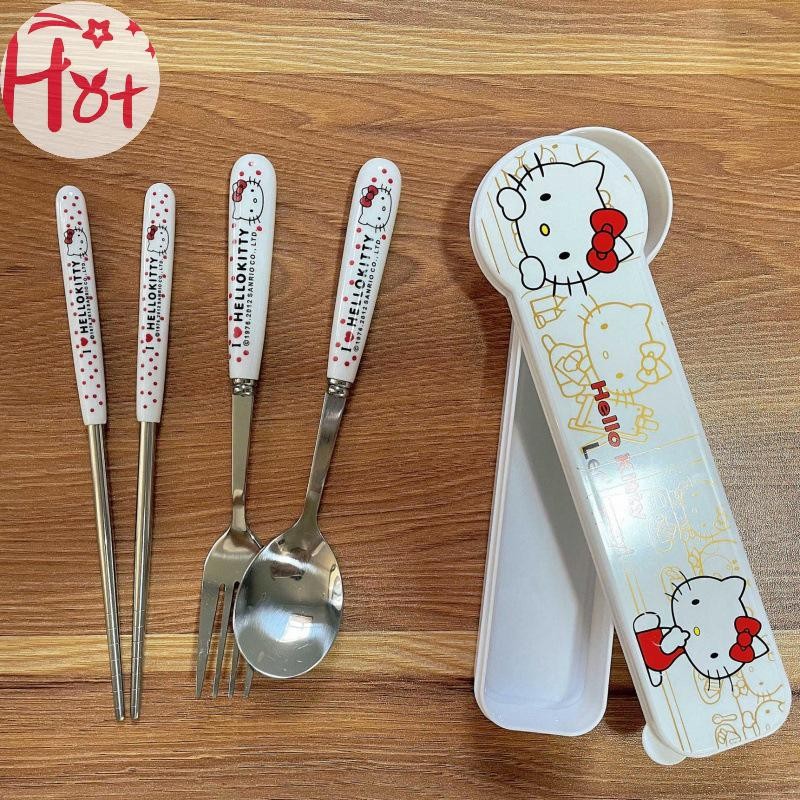 Ge การ์ตูนน่ารัก Hello Kitty ดูดีสับและช้อนชุดสแตนเลสนักเรียนแบบพกพาบนโต๊ะอาหารสําหรับทํางานสแควร์