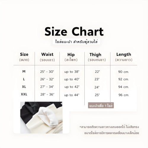 L: ยาวประมาณ 38.6 นิ้ว, รอบเอว 22.8~37.8 นิ้ว, สะโพกประมาณ 42.52 นิ้ว, รอบขาประมาณ 22.83 นิ้ว, ขนาดเท้