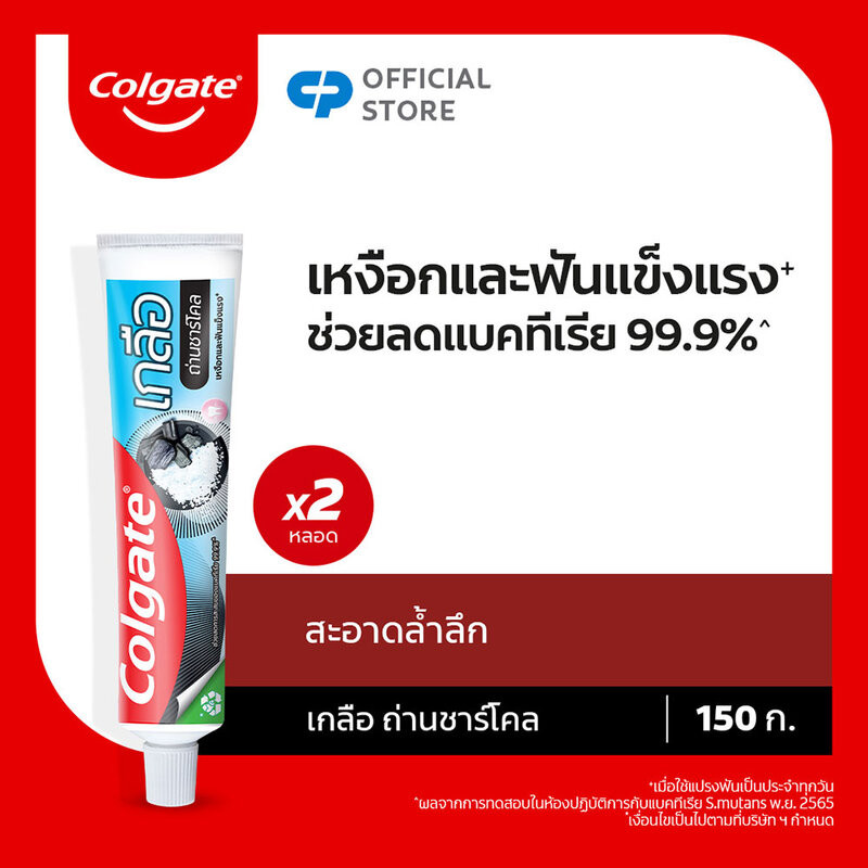 Colgate Salt Charcoal Toothpaste [150g x 2pcs] ยาสีฟันสูตรเกลือผสมถ่านชาร์โคล ผสานพลังจากเกลือและถ่านชาร์โคล พร้อมด้วยฟลูออไรด์ ช่วยลดการสะสมของแบคทีเรีย ป้องกันฟันผุ หมดกังวลเรื่องกลิ่นปาก เพื่อความสะอาด และมีสุขภาพเหงือกและฟันที่แข็งแรง