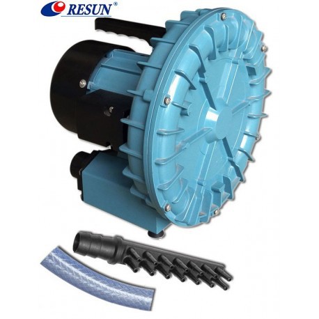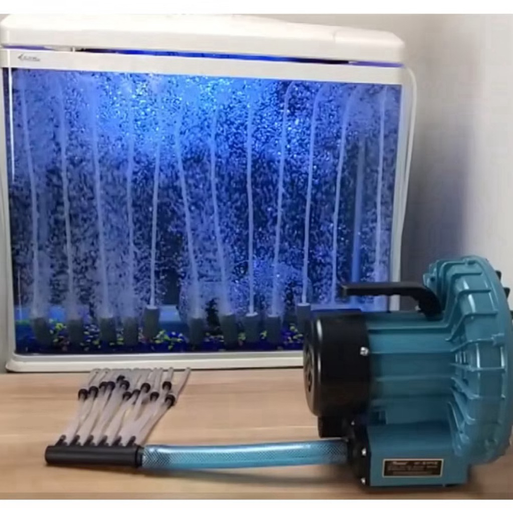 ปั้มลมชนิดพัดลมไฟฟ้า ให้ปริมาณลมมาก แต่จะได้แรงดันน้อย เหมาะสำหรับใช้กับตู้ปลาหรือบ่อเลี้ยงปลาที่น้ำลึกไม่เกิน 60-80 cm.