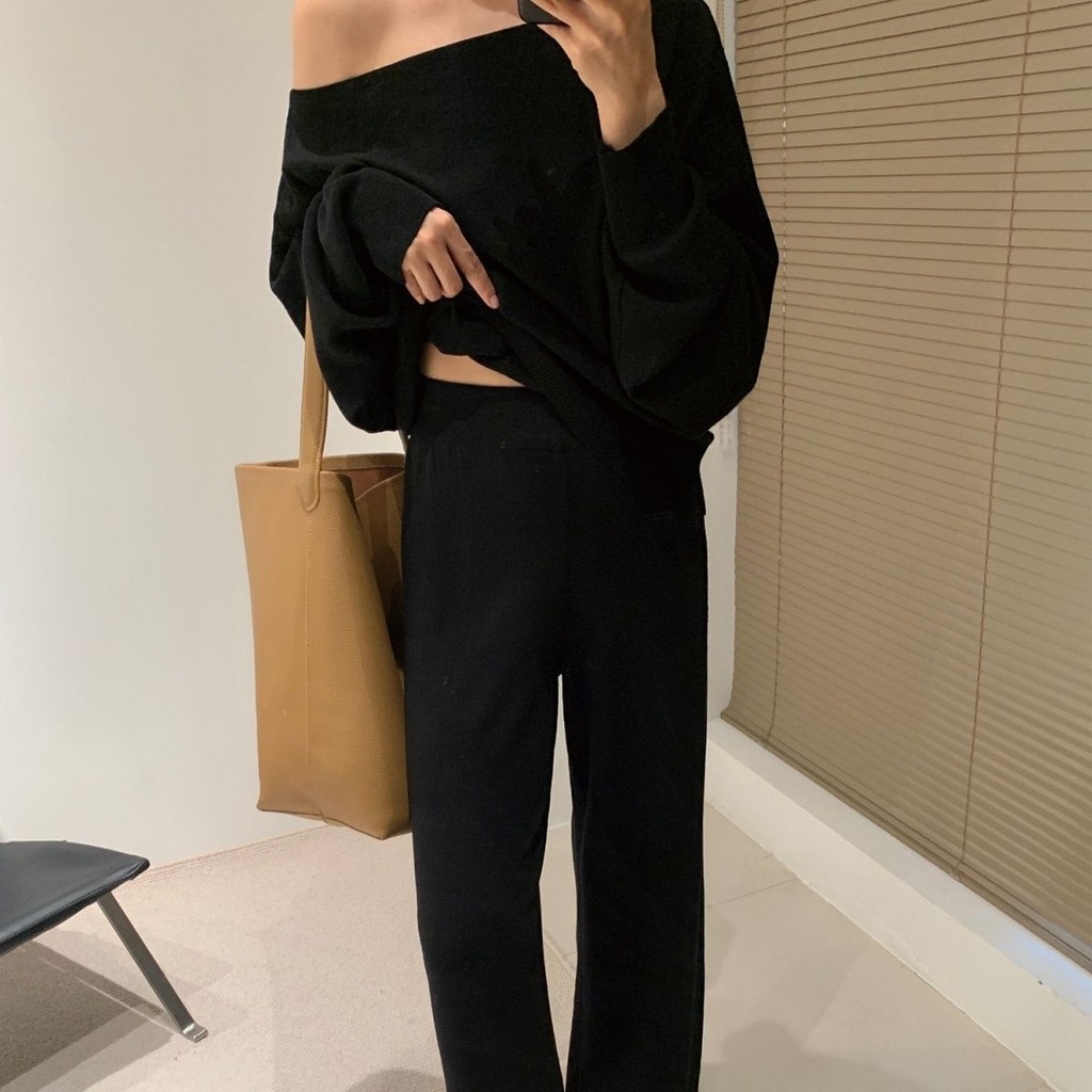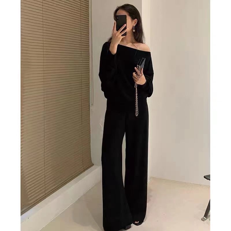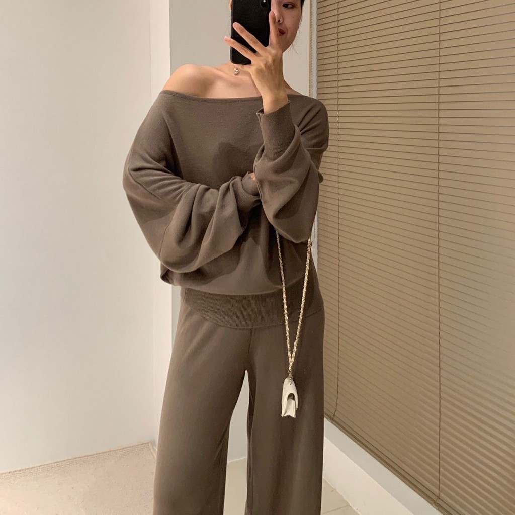สไตล์ยุโรปแฟชั่นผู้หญิงฤดูใบไม้ผลิน้องสาวขี้เกียจสไตล์หนึ่งคำผู้ใหญ่ถักคอเสื้อกันหนาวอารมณ์กว้างชุดสองชิ้น