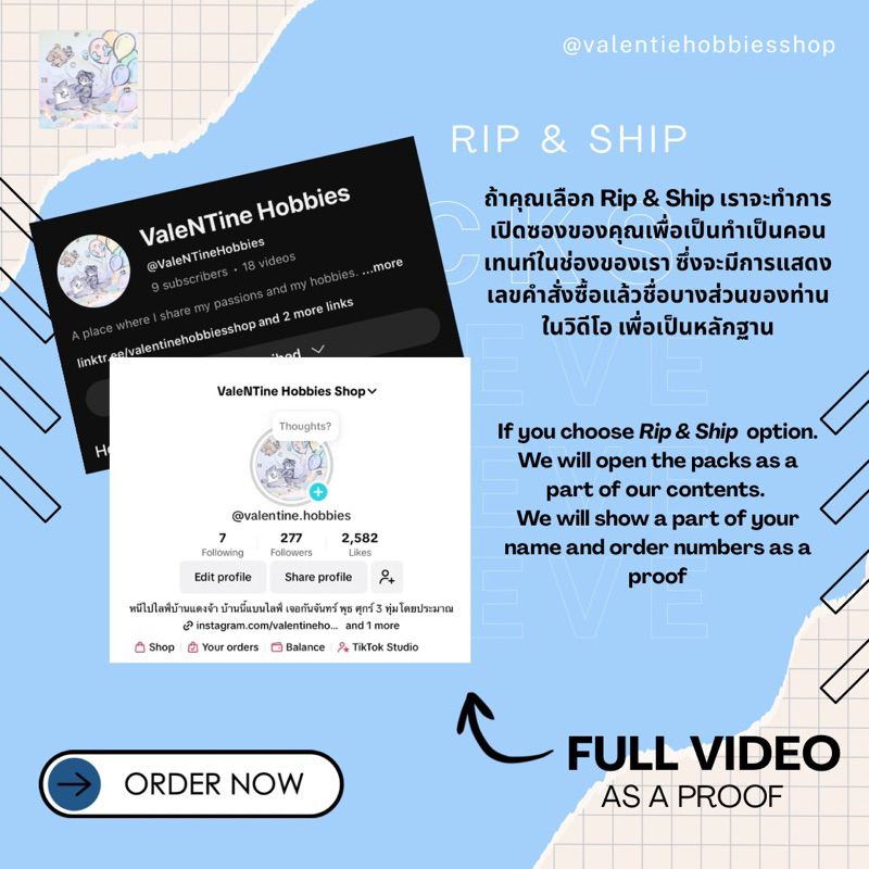 ถ้าคุณเลือก Rip & Ship เราจะทำการเปิดซองของคุณเพื่อเป็นทำเป็นคอนเทนท์ในช่องของเรา ซึ่งจะมีการแสดงเลขคำสั่งซื้อแล้วชื่อบางส่วนของท่านในวิดีโอ เพื่อเป็นหลักฐาน