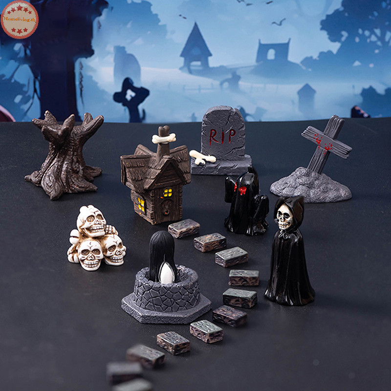 บ้านฮาโลวีนไมโครภูมิทัศน์ขนาดเล็กตุ๊กตาเรซิ่นหัตถกรรมมินินางฟ้าเครื่องประดับสวนฟักทองน่ารักผีแวมไพร์ตกแต่ง ไทย