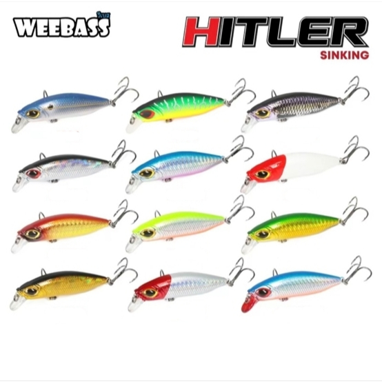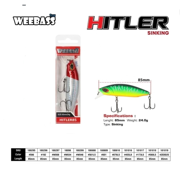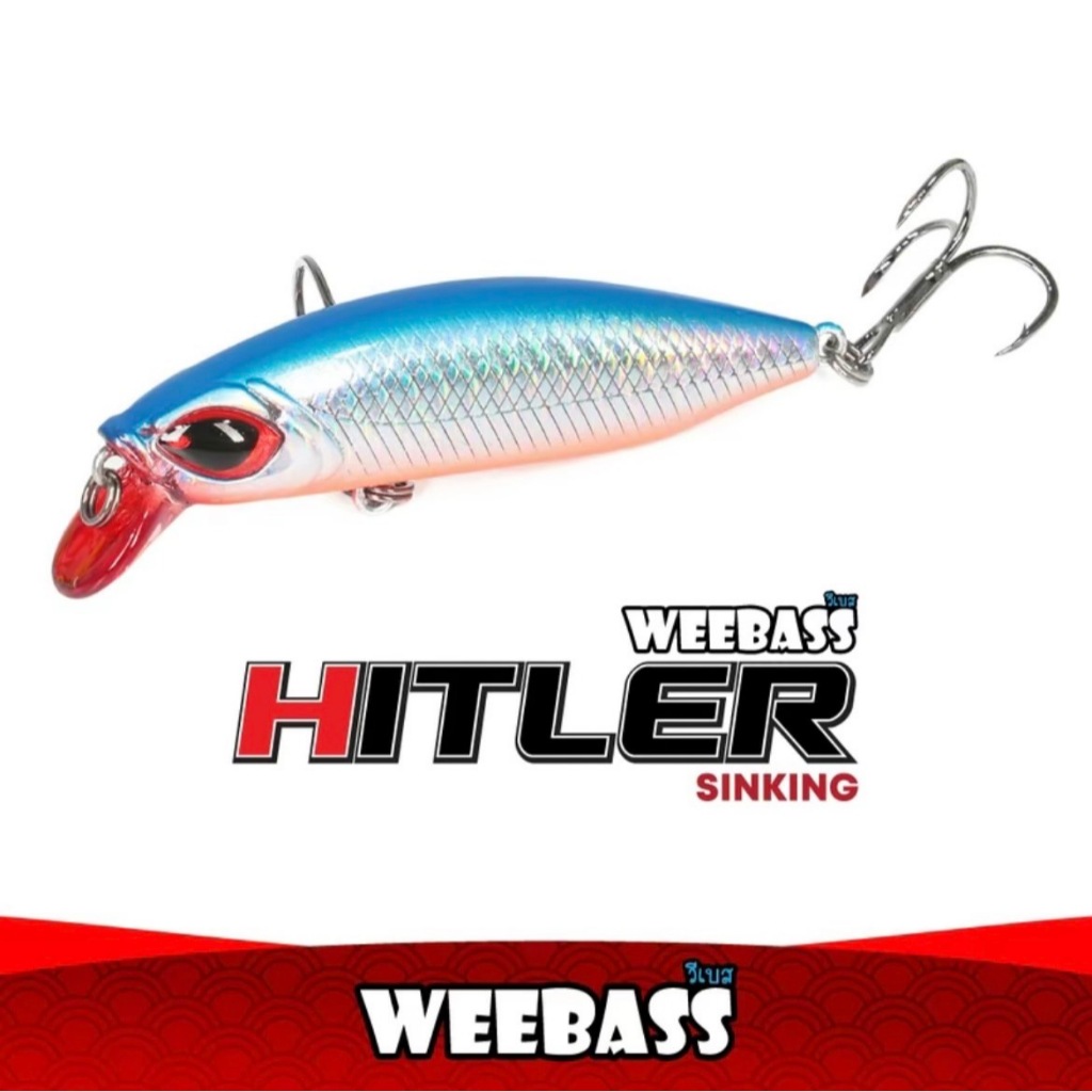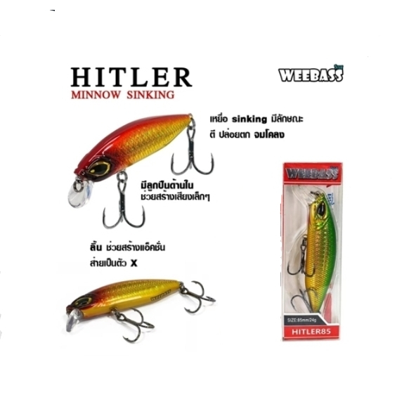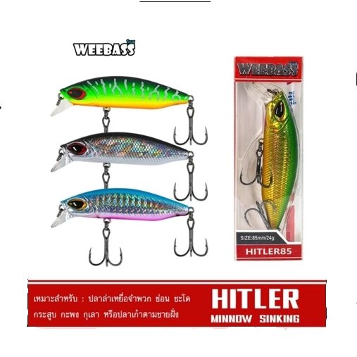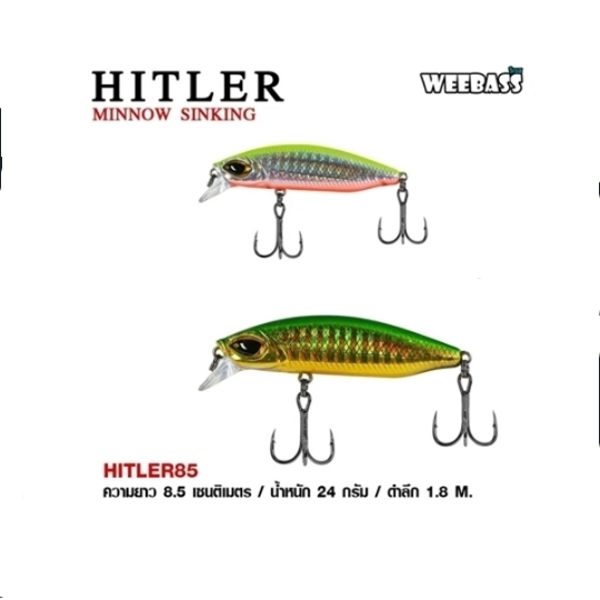 เหยื่อ Weebass HITLER (Sinking) ขนาด 85 mm. -Length 85 mm. Weight 24.0 g -เป็นเหยื่อตระกูล MINNOW ประเภท SINKING -ผลิตจากพลาสติก ABS มีความโดดเด่นในเรื่องของความแข็ง เหนียว และการกระแทก การกระชากของปลา ได้เป็นอย่างดี -เหมาะสำหรับ ใช้ตีปลาจำพวกปลาล่าเหยื่อ