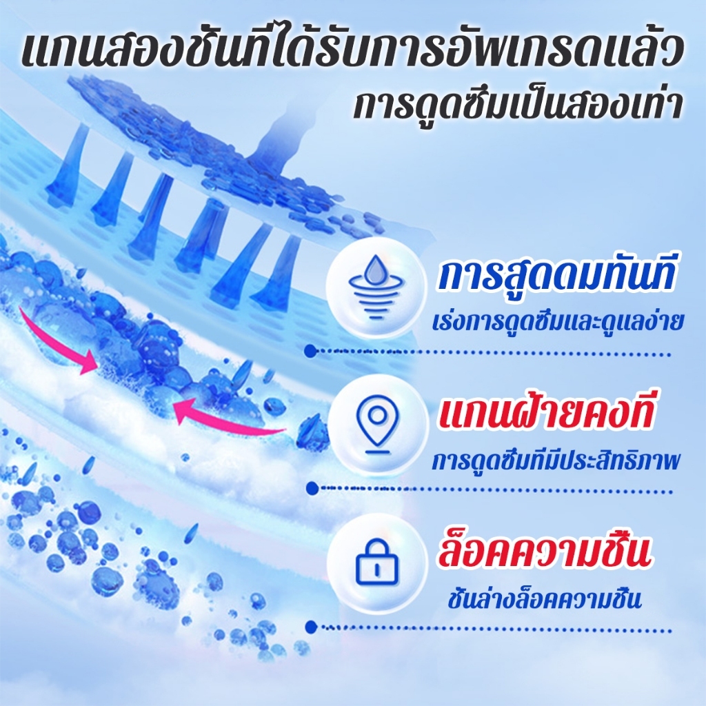 ● ซึมซับได้มากกว่า และ ซึมซับได้รวดเร็วกว่า ด้วยเทคโนโลยี เจลซึมซับพิเศษจากญี่ปุ่น ทำให้ผู้สวมใส่ ไม่อับชื้น แห