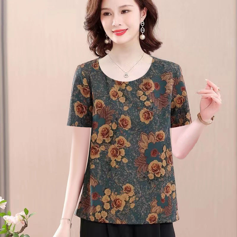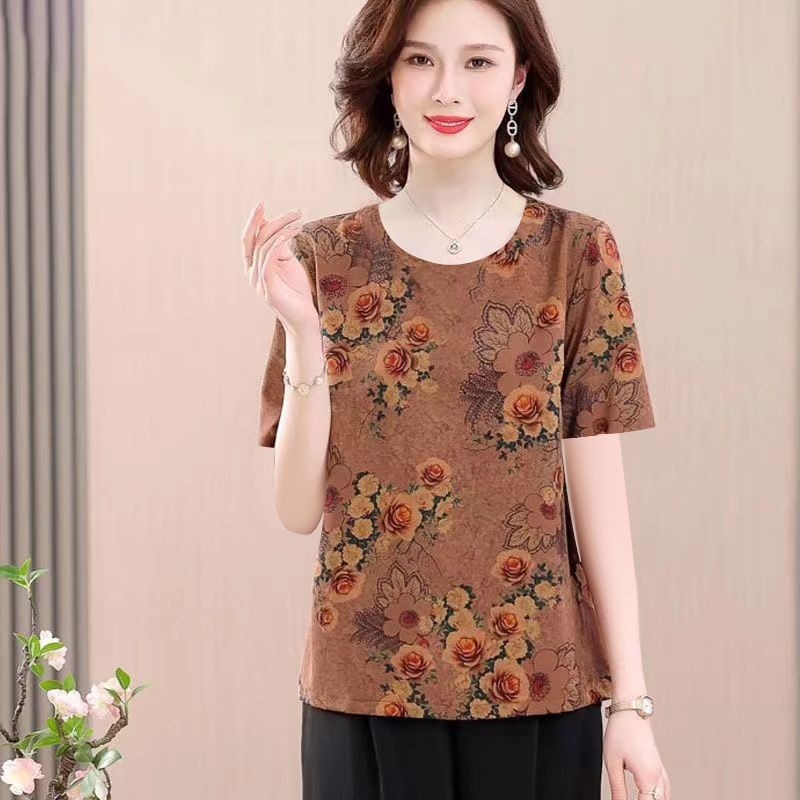 หยิบใส่ตะกร้าเสื้อยืดผ้าไหมน้ําแข็งแม่วัยกลางคนผู้สูงอายุสวมกว้างเลดี้พิมพ์ขนาดใหญ่แฟชั่น High-En