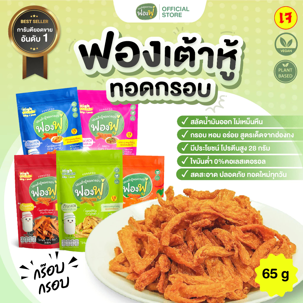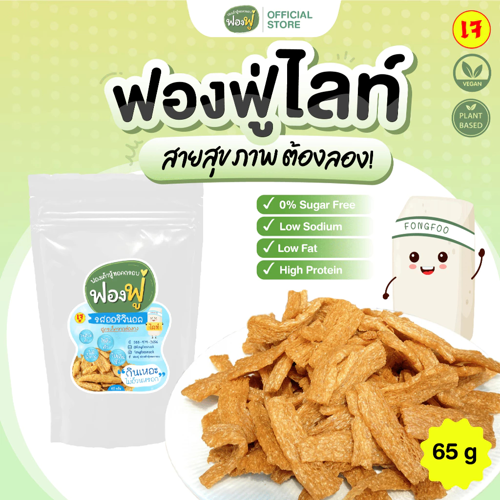 ฟองฟู่…ฟองเต้าหู้ทอดกรอบ 1 ซอง น้ำหนัก 28 กรัม ให้โปรตีนเทียบเท่าอกไก่ 1 ชิ้น หรือไข่ไก่ 4 ฟอง ตอบโจทย์ตรงใจคนที่ดูแลสุขภาพหรือคนที่ออกกำลังกาย สามารถทานคู่กับข้าวหรืออาหารอื่น ๆ ได้หลายชนิดโดยไม่ทำให้อ้