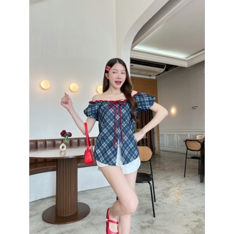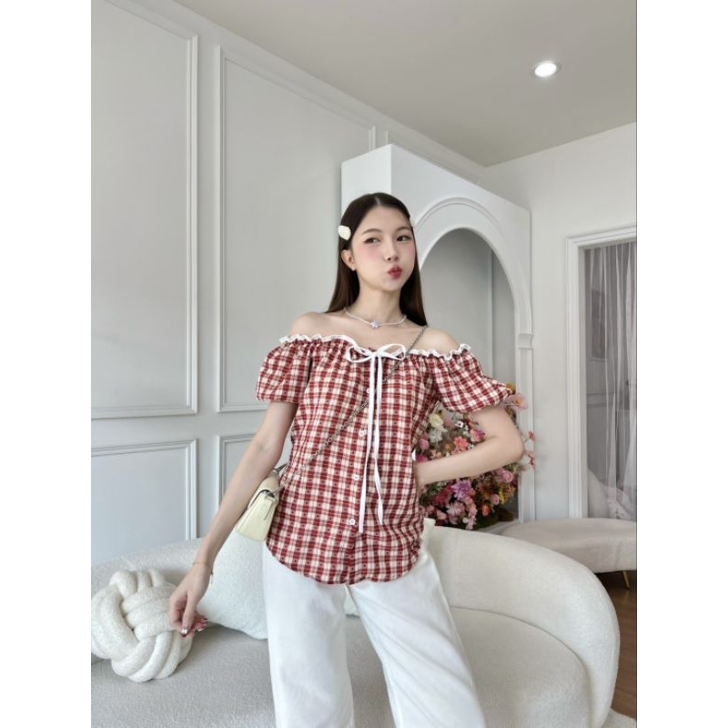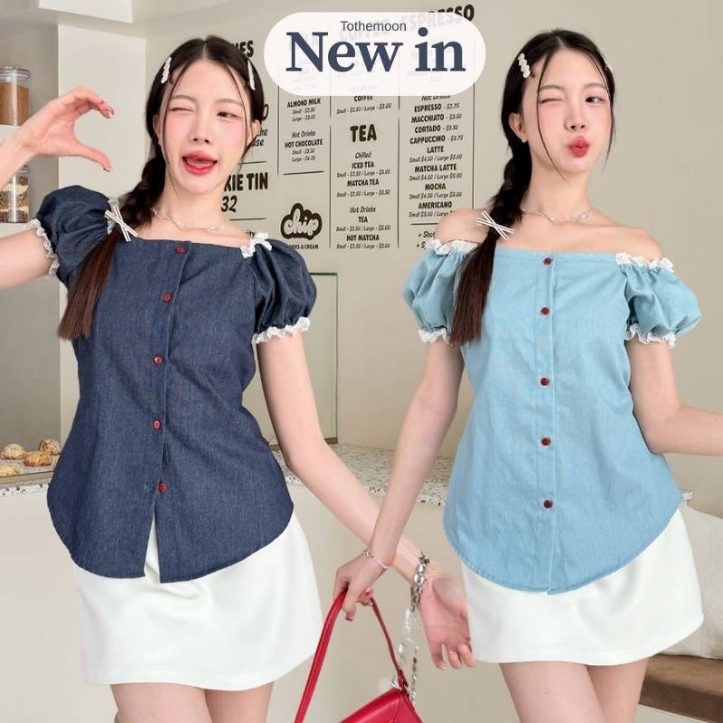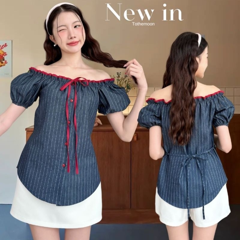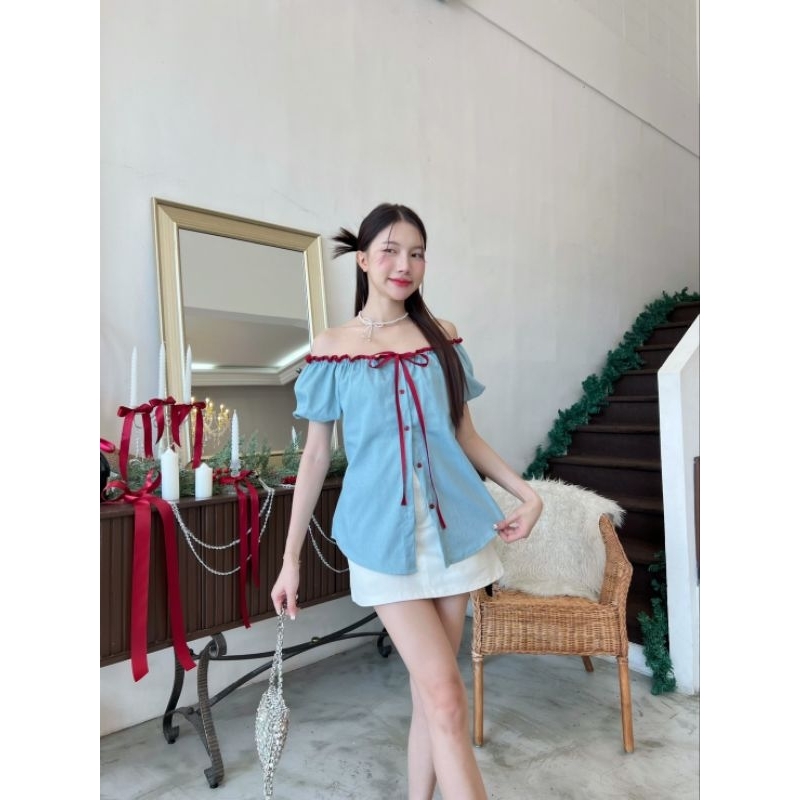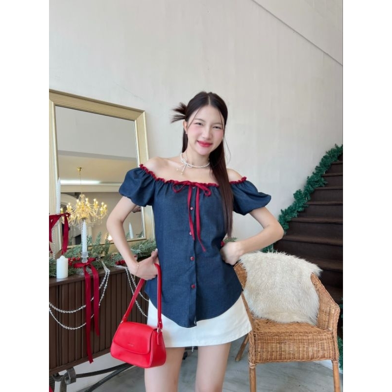 เสื้อยีนส์แขนตุ๊กตาปาดไหล่ แต่งขอบกุ้นผูกโบว์สีแดงตัดกระดุมสีแดง ปลดกระดุมชายใส่ผ่าหน้านิดๆสวยอีกแบบน้าาา