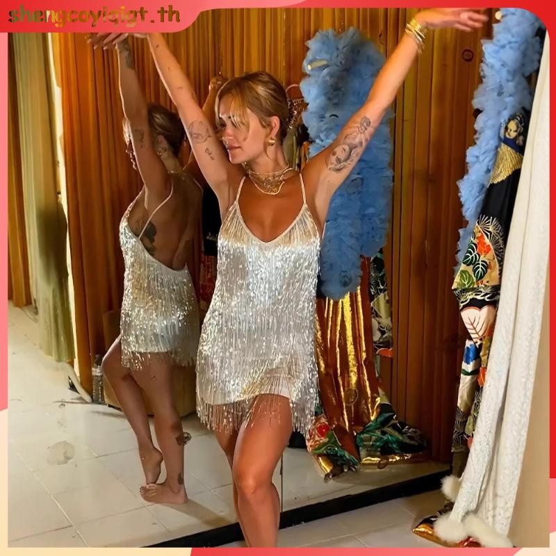 Hilario ชุดมินิเดรส คอวี สายสปาเก็ตตี้ ประดับพู่ กลิตเตอร์ สไตล์โบฮีเมียน หรูหรา สําหรับปาร์ตี้ค็อกเทล