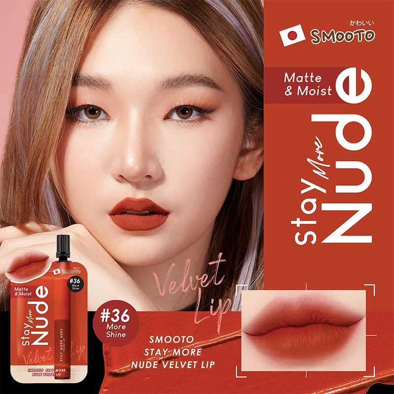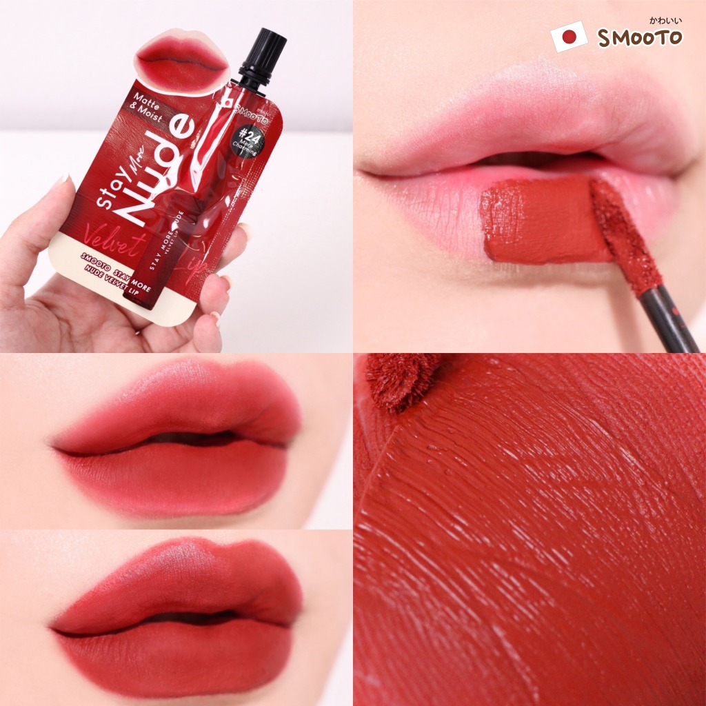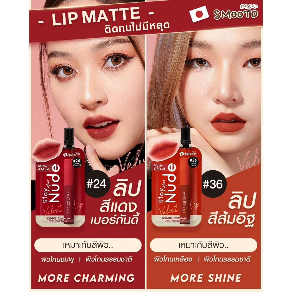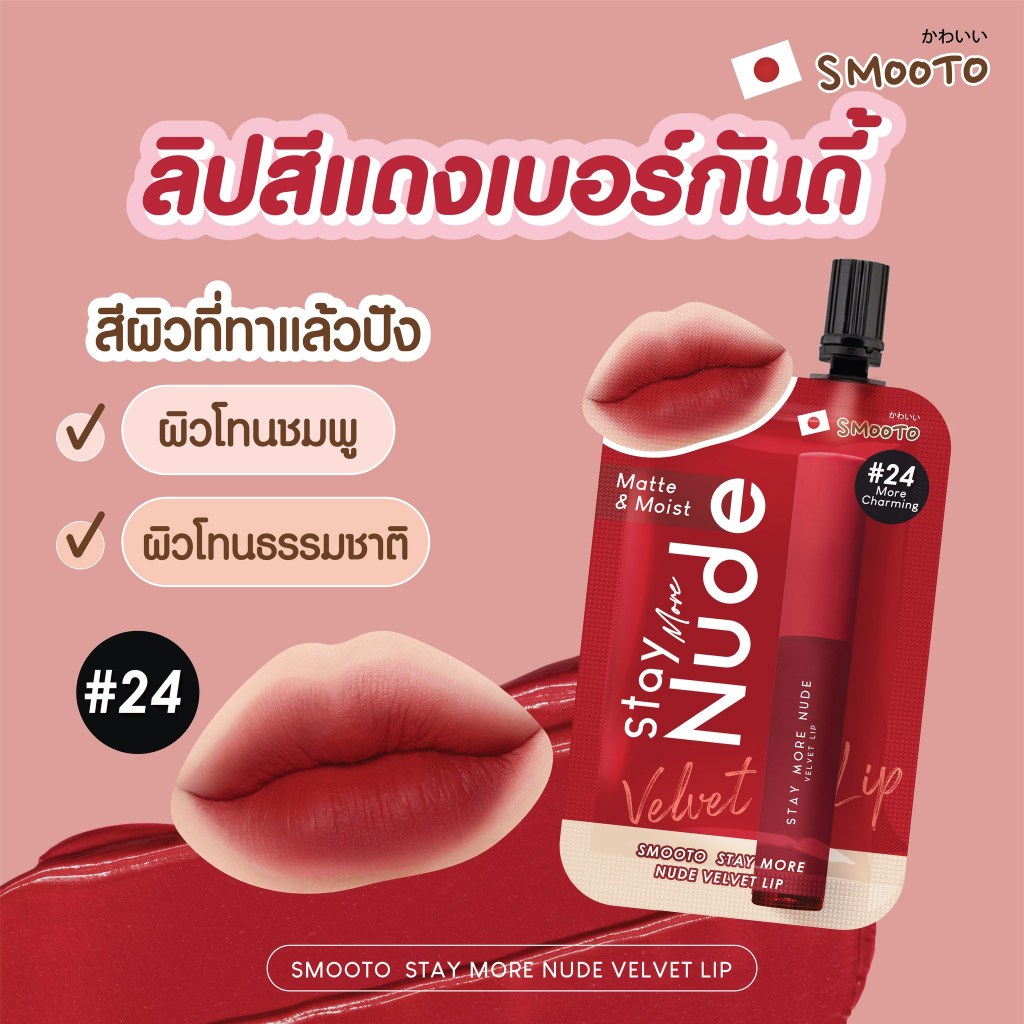 ลิปเนื้อกำมะหยี่ เนื้อนุ่ม เม็ดสีสวยชัด กลบสีปากมิด ไม่ตกร่อง สีติดทนนาน ไม่ติดแมส