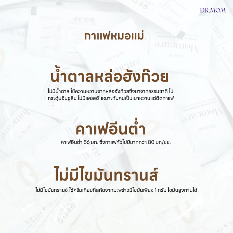 DR.MOM Momcare Instant Coffee Mixed Powder 15g x 10 Sachets ผลิตภัณฑ์เสริมอาหารกาแฟปรุงสำเร็จชนิดผง คาเฟอีนต่ำ แต่ยังคงความหอมของกาแฟอาราบิก้า ให้ความหวานจากหล่อฮังก๊วย ปราศจากน้ำตาล, ไขมันทรานส์ และคอเลสเตอรอล