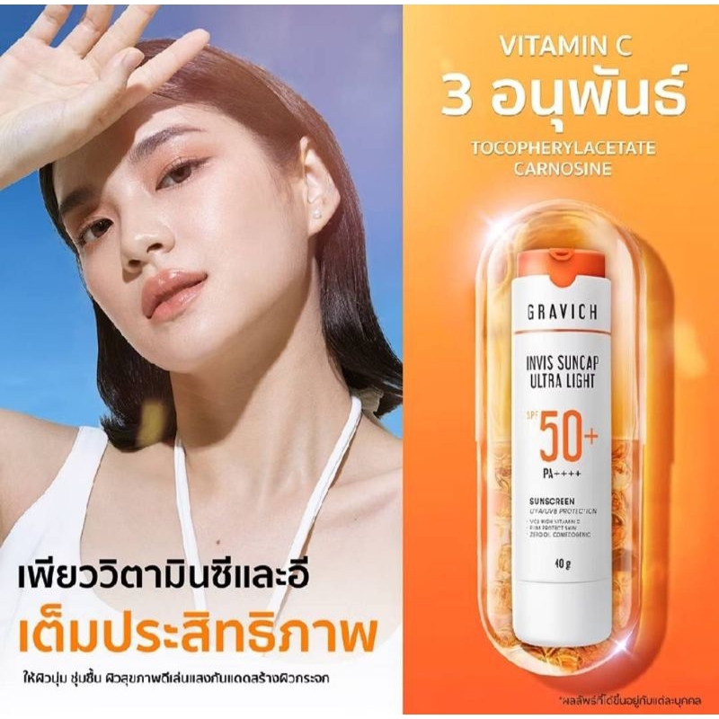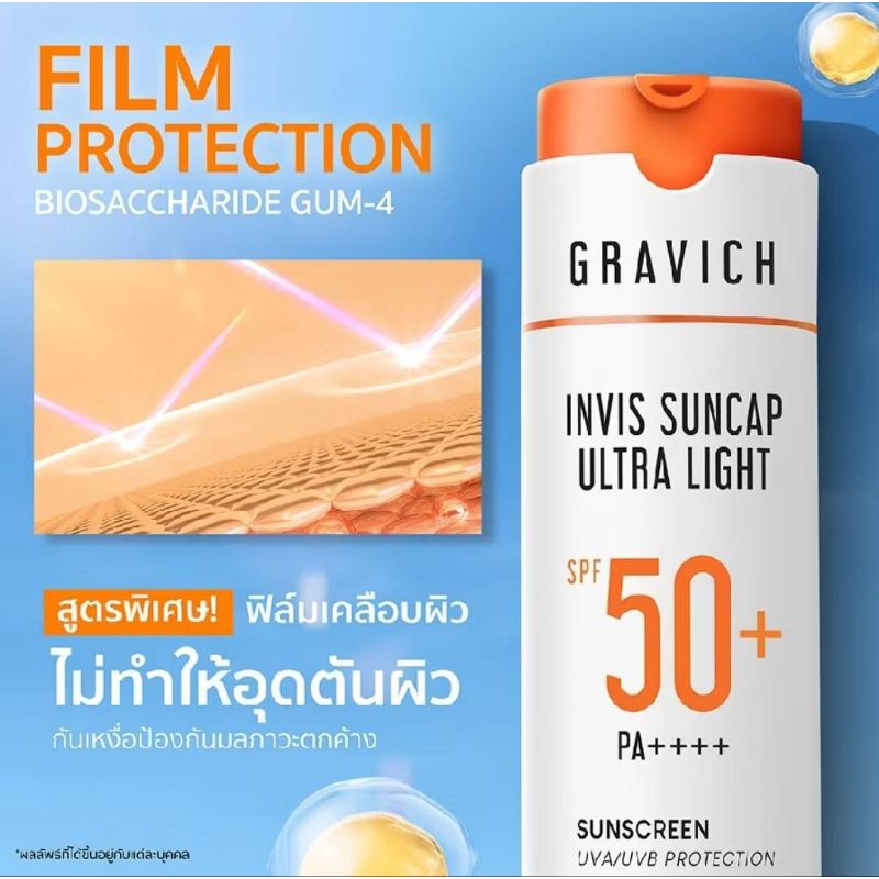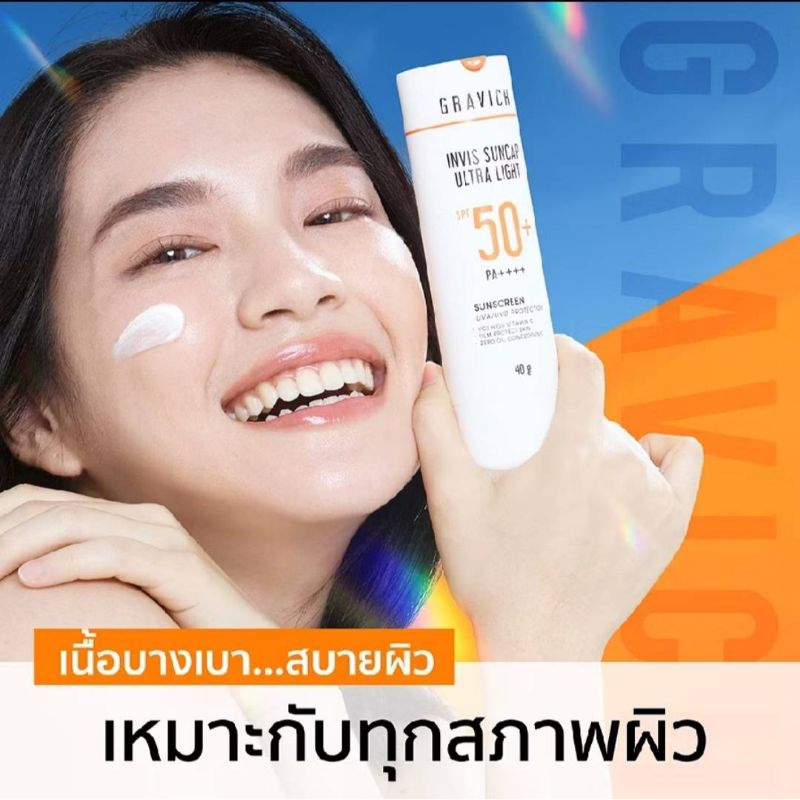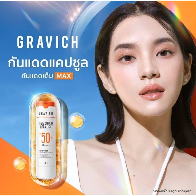 กราวิช อินวิซ ซันแคป อัลตรา ไลท์ ซันสกรีน เอสพีเอฟ 50+ พีเอ ++++ นวัตกรรมกันแดดแคปซูล เนื้อสัมผัสบางเบา ด้วยไลโปโซมบรรจุสารกันแดดทั้งหมด 3 ชนิด ประสิทธิภาพช่วยสะท้อน และ ดูดกลืนแสงแดดยูว