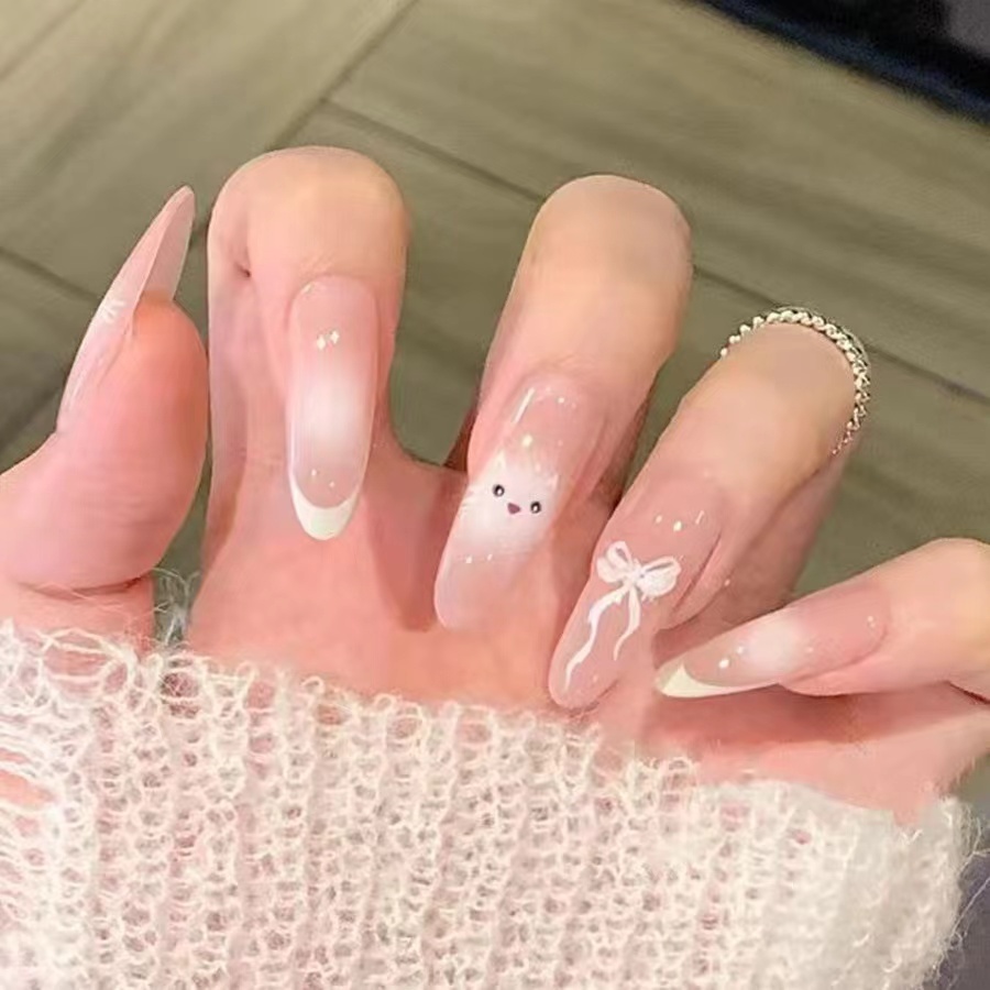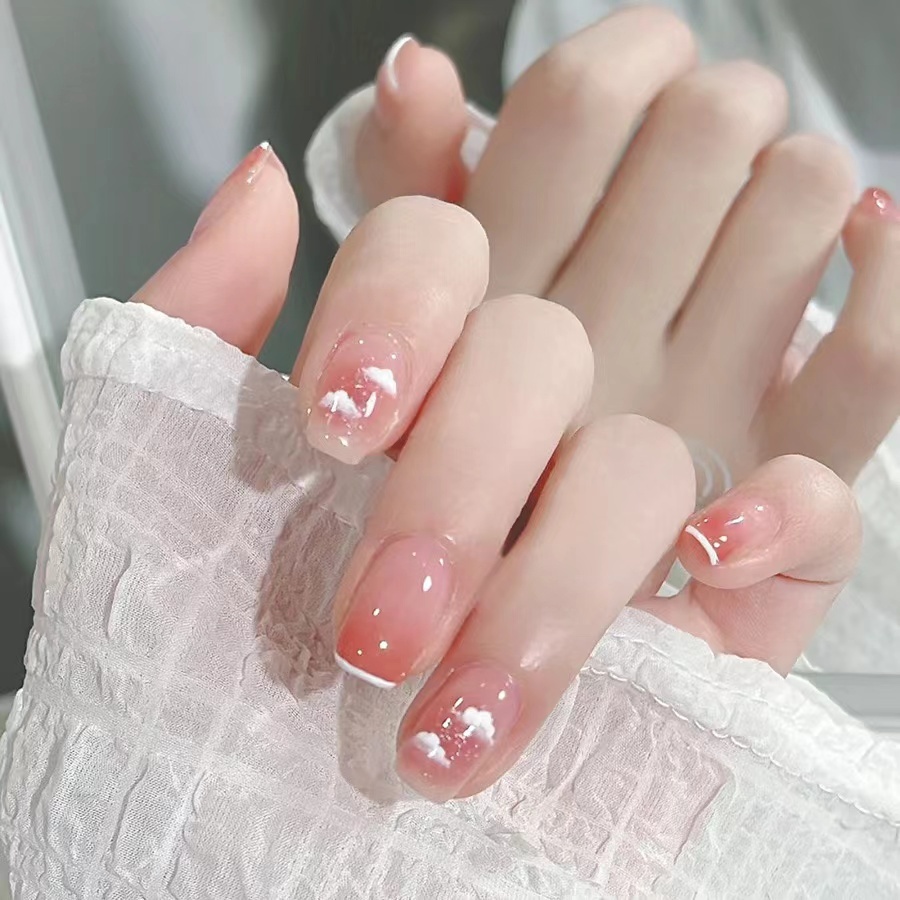 ✨# ชมพู ขาว เล็บสวย เล็บปลอม แฟชั่นสีเล็บ 24 ชิ้น【AA147】