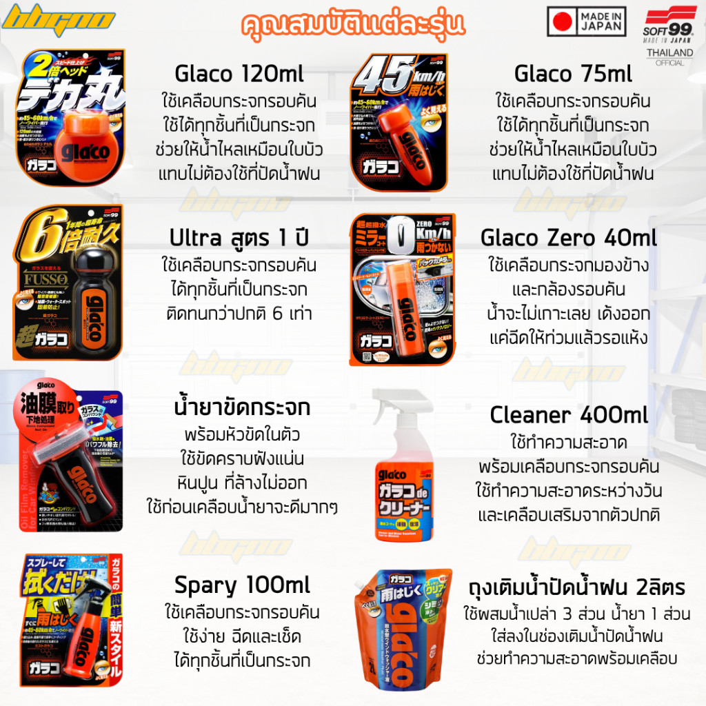 | Model | 120ml, ผ้า 1 ผืน, ถุงเติม 2, 000ml, ผ้า 1 ผืน, Glaco Zero, ผ้า 1 ผืน, Glaco Ultra เข้มข้น, ผ้า 1 ผืน, Cleaner+เคลือบ 400ml, ผ้า 1 ผืน, Cleaner+เคลือบ 400ml, ผ้า 2 ผืน, Cleaner+เคลือบ 400ml, ผ้า 4 ผืน, Glaco Ultra เข้มข้น, ผ้า 4 ผืน, 75ml, ผ้า 1 ผืน, ถุงเติม 2, 000ml, ไม่รับผ้ |