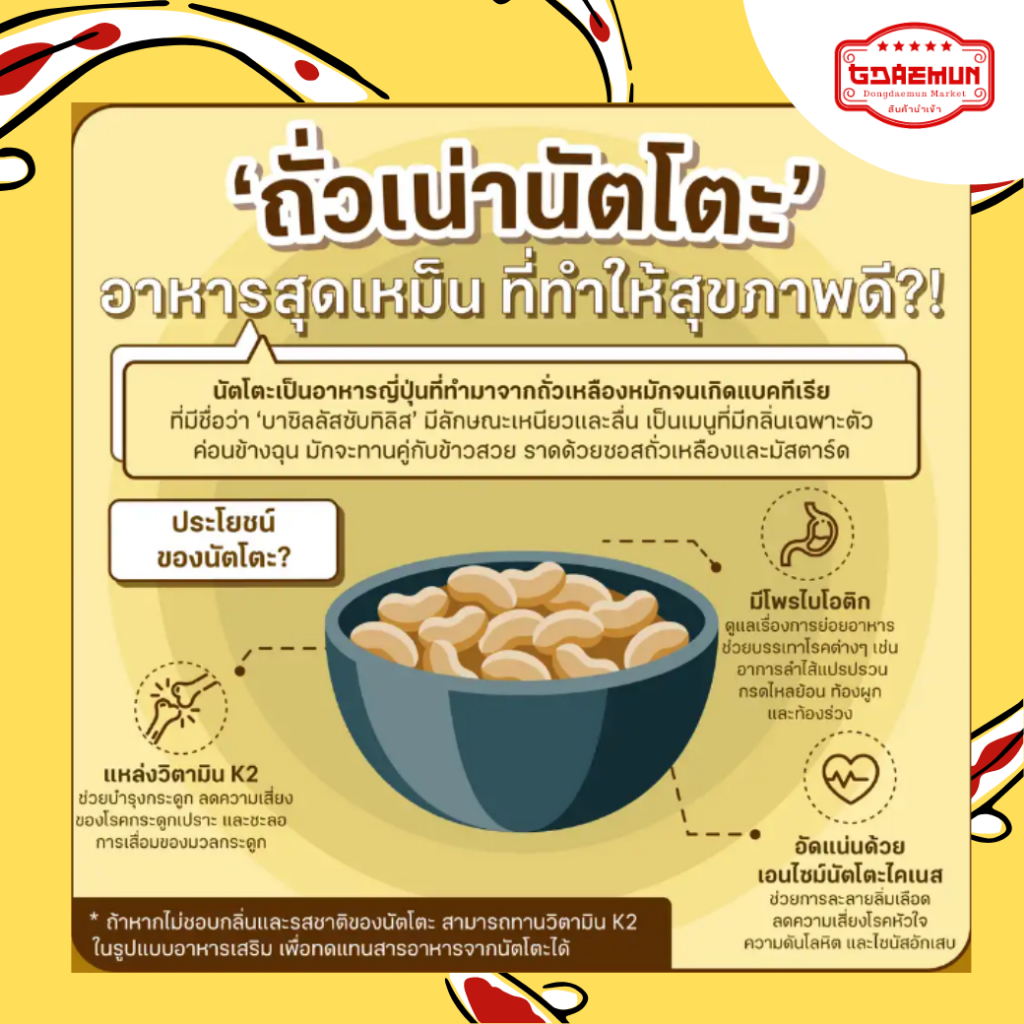 🚩 นัตโตะเป็นอาหารพื้นเมืองของประเทศญี่ปุ่น ทำจากถั่วเหลือง หมักด้วยเชื้อแบคทีเรียสายพันธุ์ Natto นิยมรับประทานเป็นอาหารเช้า นัตโตะอุดมไปด้วยโปรตีน