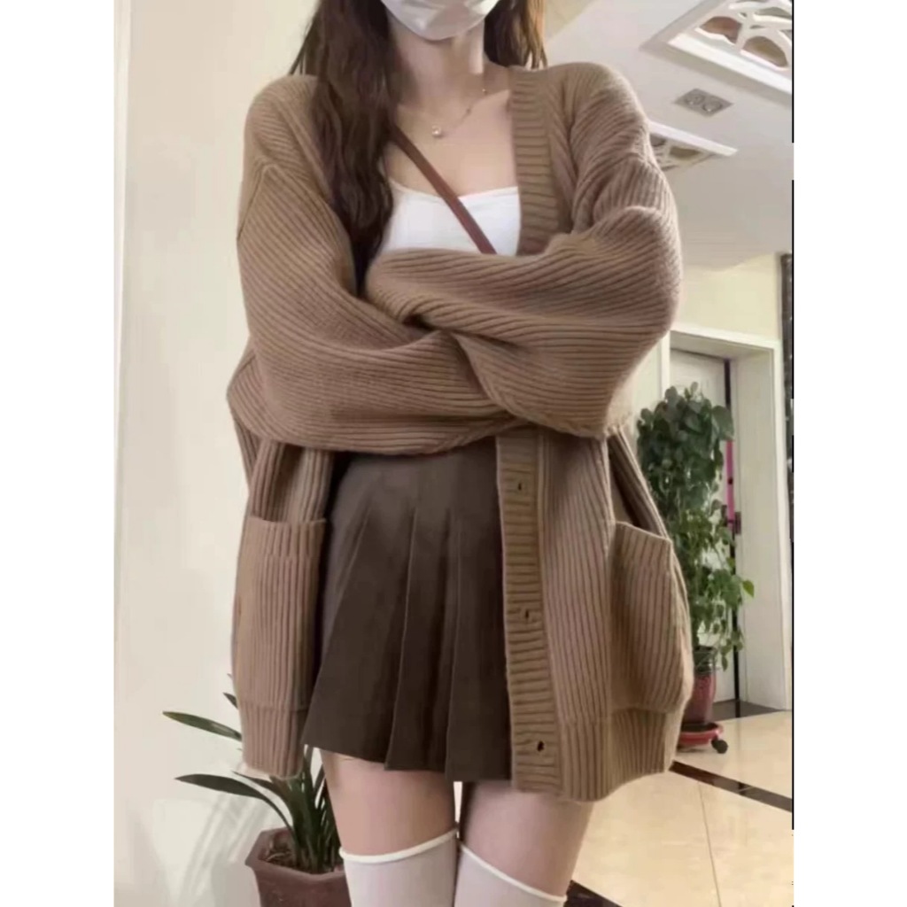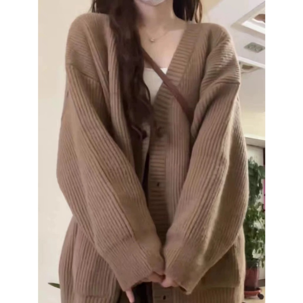 สีเทากลางความยาวเสื้อกันหนาวแจ็คเก็ตผู้หญิงฤดูใบไม้ผลิฤดูใบไม้ร่วงสวมใส่ด้านนอกขี้เกียจย้อนยุคนมสไตล์สวมใส่ฤดูใบไม้ร่วงฤดูหนาวถักคาร์ดิ