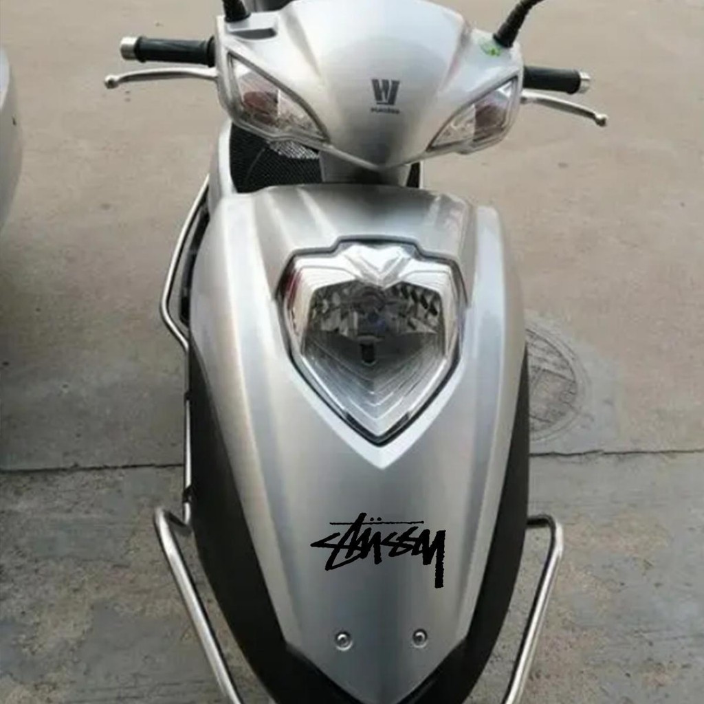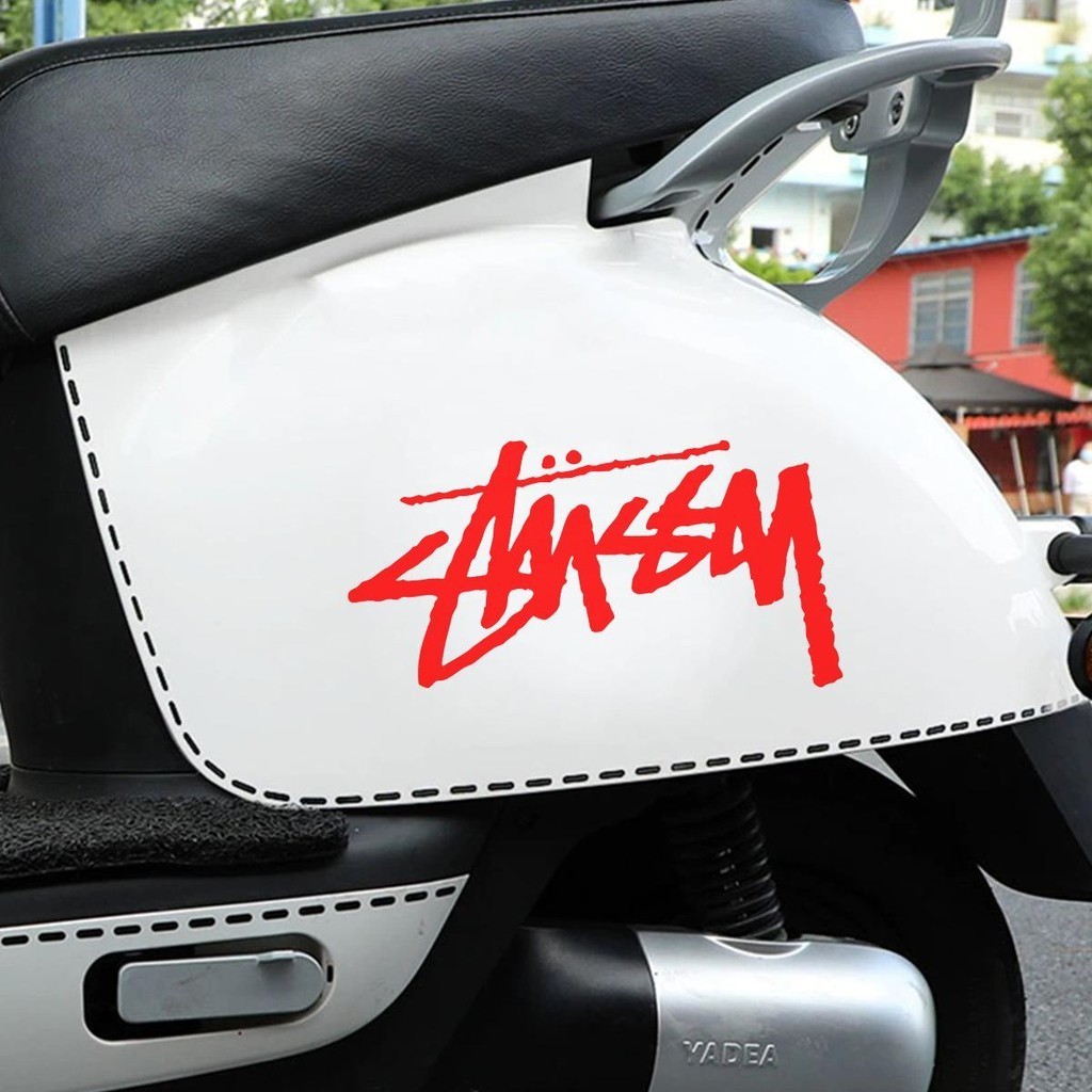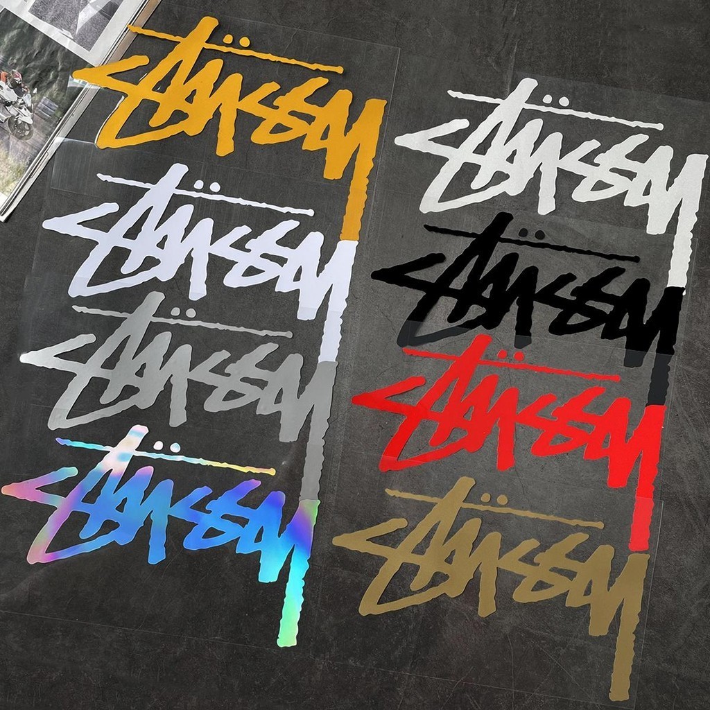 รถจักรยานยนต์ สติ๊กเกอร์สะท้อนแสง Stussy พร้อมตัวอักษรส่วนบุคคลเหมาะสําหรับ Honda Yamaha และสกู๊ตเตอร์อื่นๆ ด้านหน้าของรถยนต์ตกแต่งด้วยสติ๊กเกอร์สําหรับหน้าต่างรถยนต์