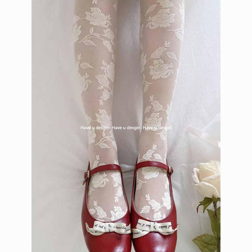 มี u desgin Rose รูปแบบถุงน่องสีขาว Pure Desire สไตล์ลูกไม้ Jacquard หวานภาษาฝรั่งเศสคําฤดูร้อนบางเฉียบโปร่งใสเนื้อขาสวย Pantyhose ผู้หญิง