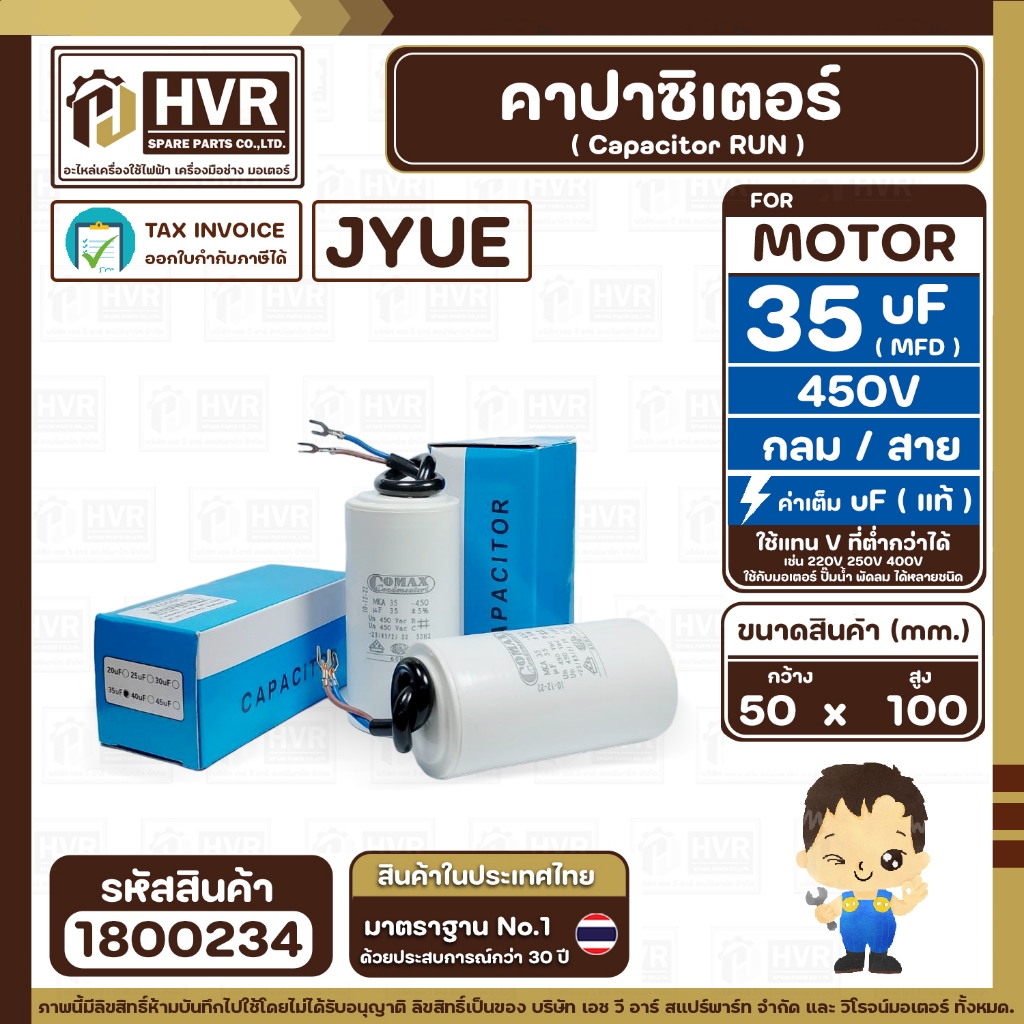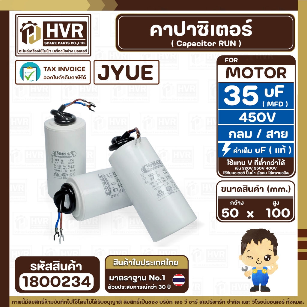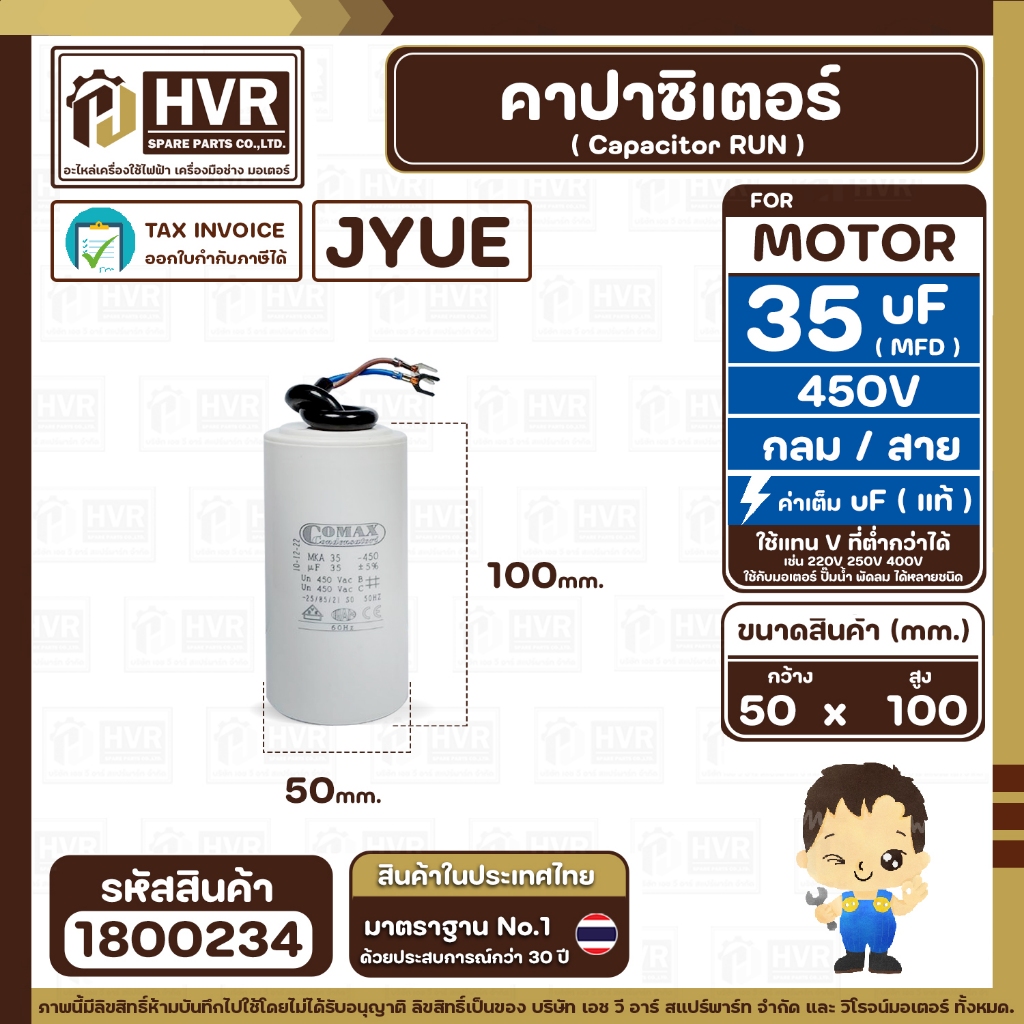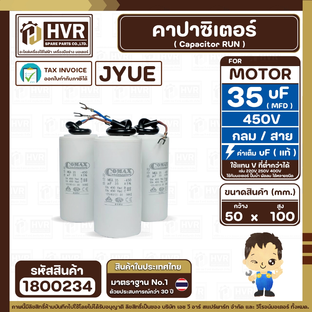 คาปาซิเตอร์ ( Cap Run ) 35 uF ( MFD ) 450V ( กลม สาย ) ( COMAX ) ( CBB65 )( 50 x 100 mm.) #1800234
