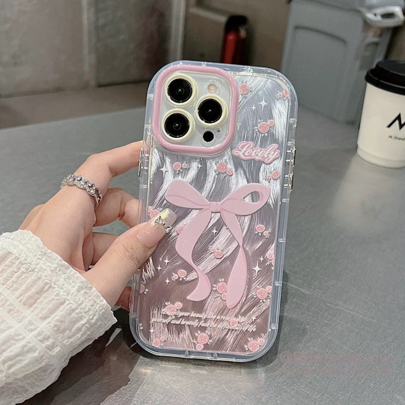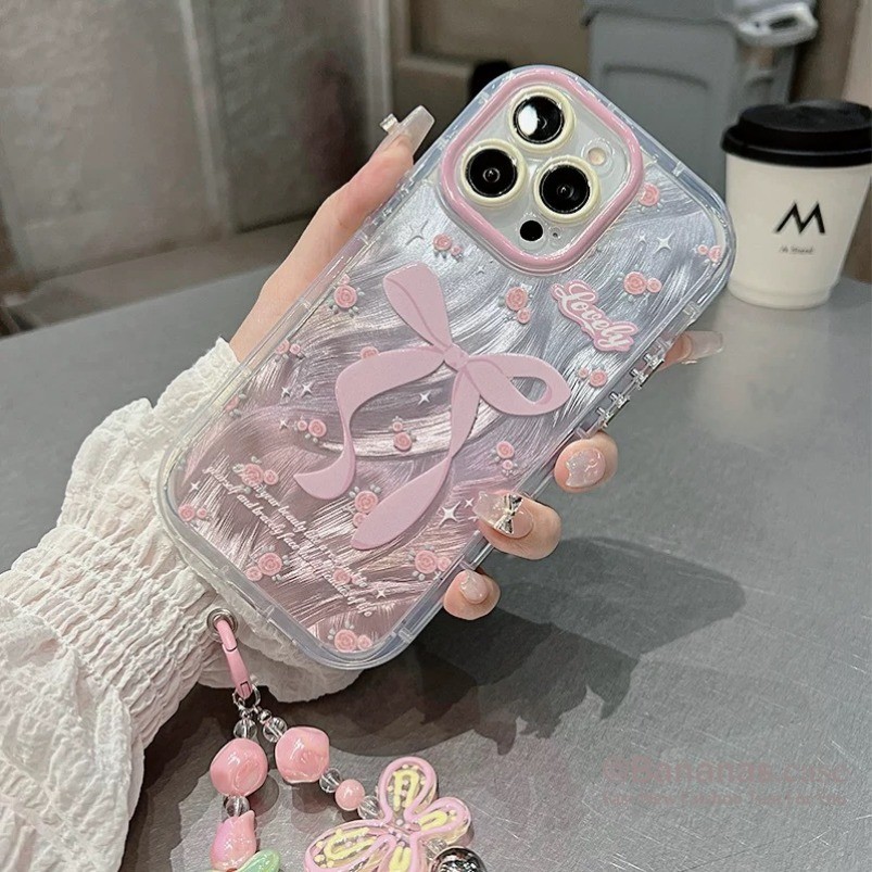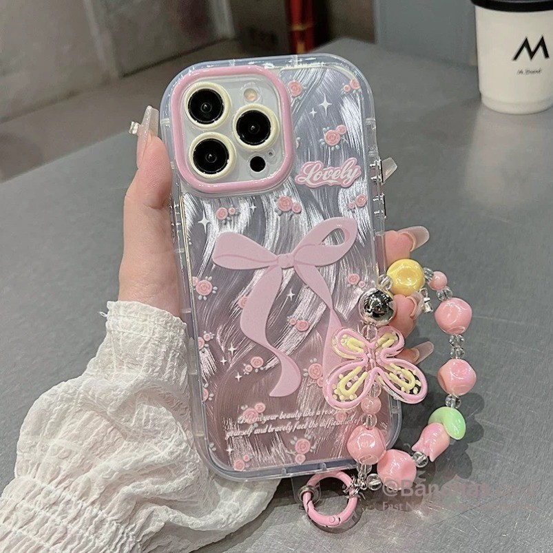 Iphone 16 15 14 13 12 11 Pro Max X Xr Xs Max 7 8 Plus SE2020 เคสโทรศัพท์ Ins ดอกไม้ขนาดเล็ก Rose สีชมพูโบว์ + Lanyard Bling Clear ฝาครอบโทรศัพท์