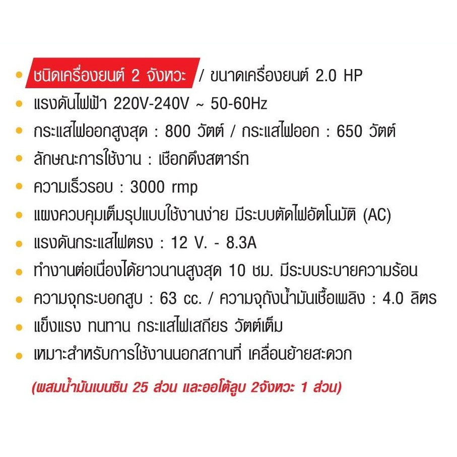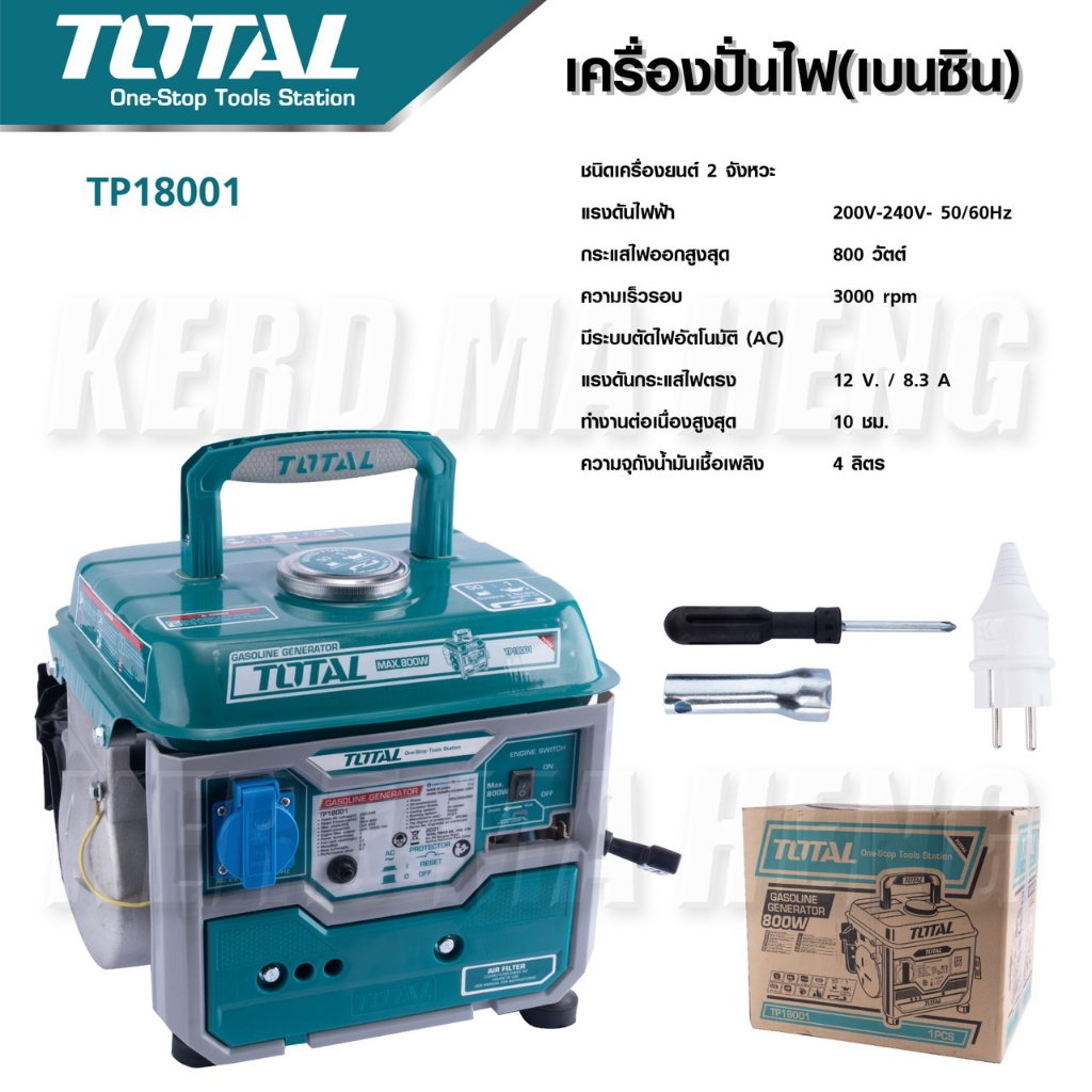 Total เครื่องปั่นไฟ เบนซิน เครื่องยนต์ 2 แรงม้า 2 จังหวะ รุ่น TP18001 – สินค้าใหม่ 100% – แรงดันไฟฟ้า 220-240V 50-60 Hz – กระแสไฟออกสูงสุด 800 วัตต์ / กระแสไฟออก 650 วัตต์ – ลักษณะการใช้งาน เชือกดึงสตาร์ท – ความเร็วรอบ 3000 RPM – แผงควบคุมเต็มรูปแบบใช้งา