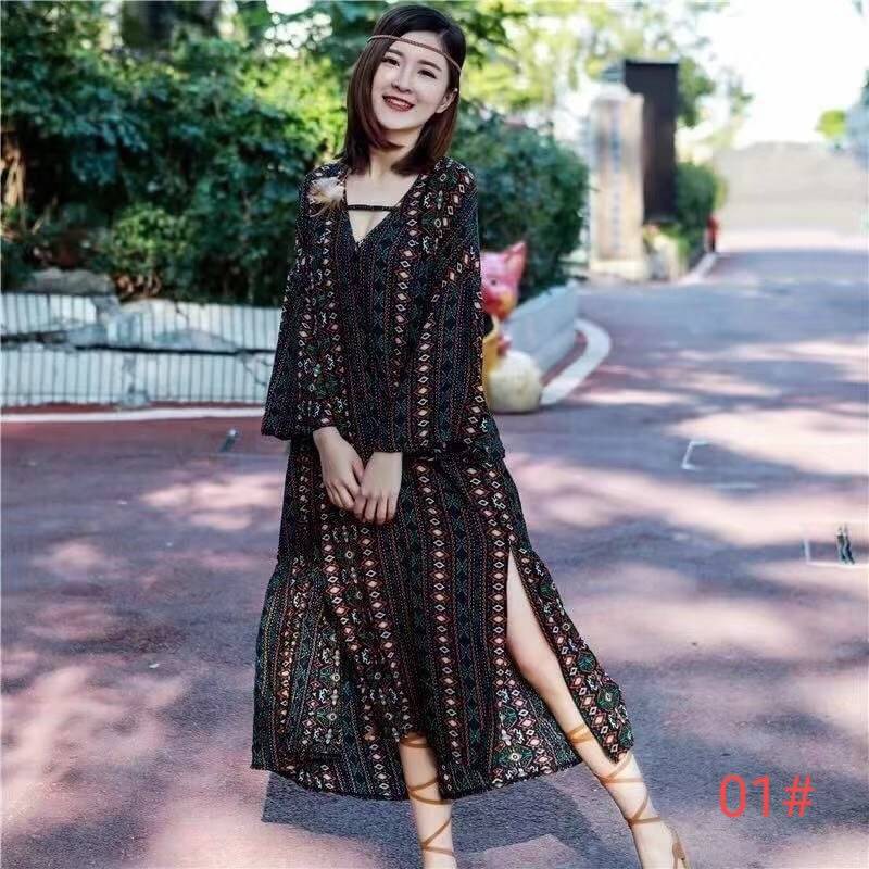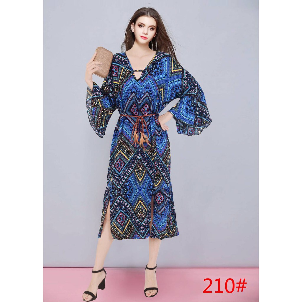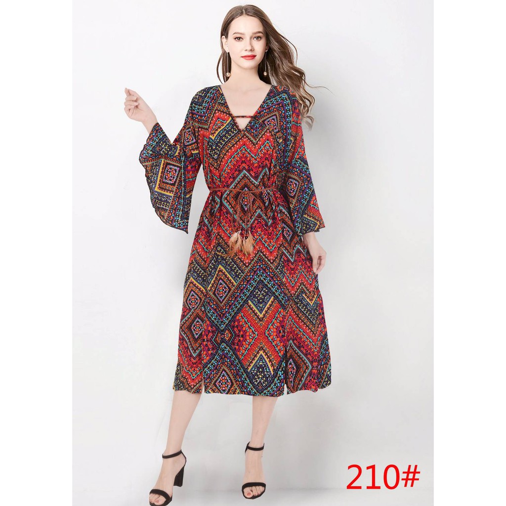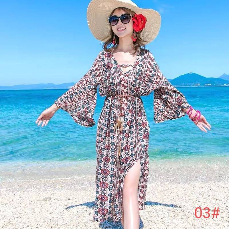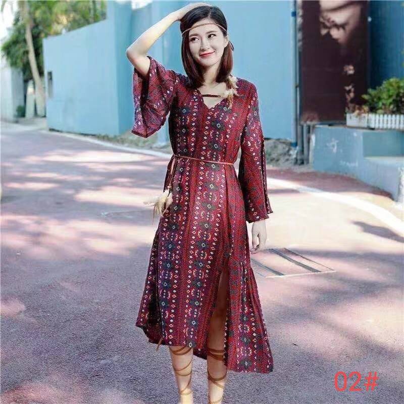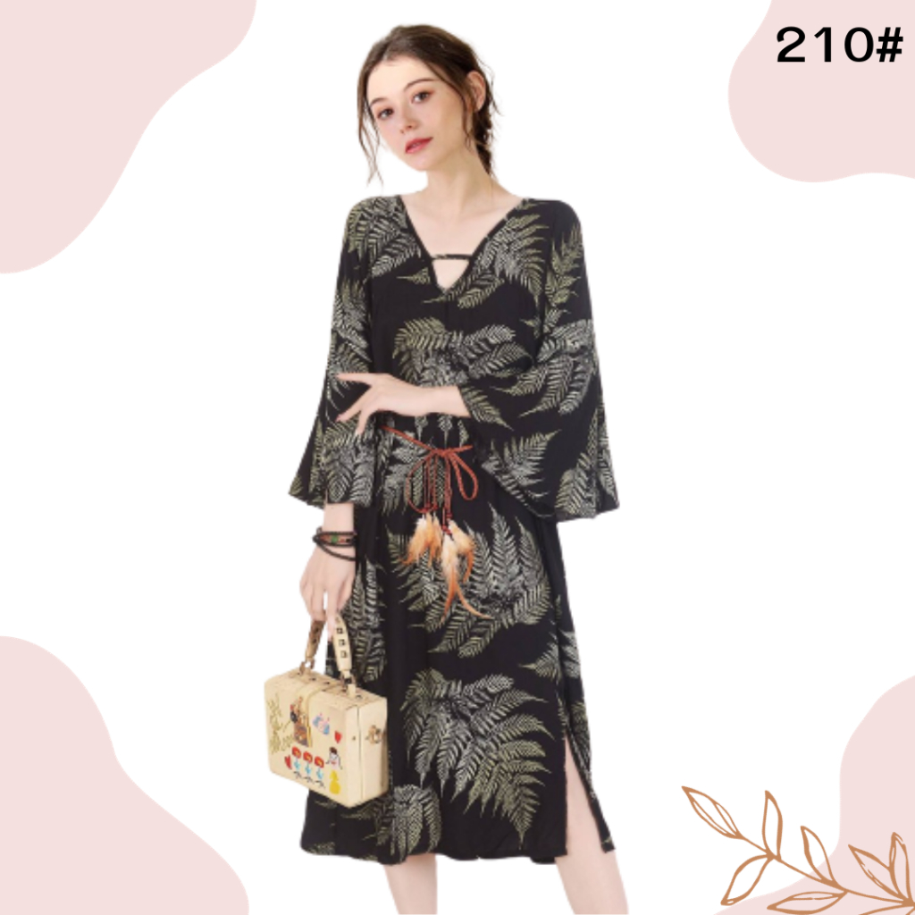 [Bahanmei] NEW ใหม่สุด เดรสโบฮีเมียนมีสายประดับผูกเอวตกแต่งด้วยขนไก่ ชุดผ่าข้างชายกระโปรงยาวคลุมเข่า