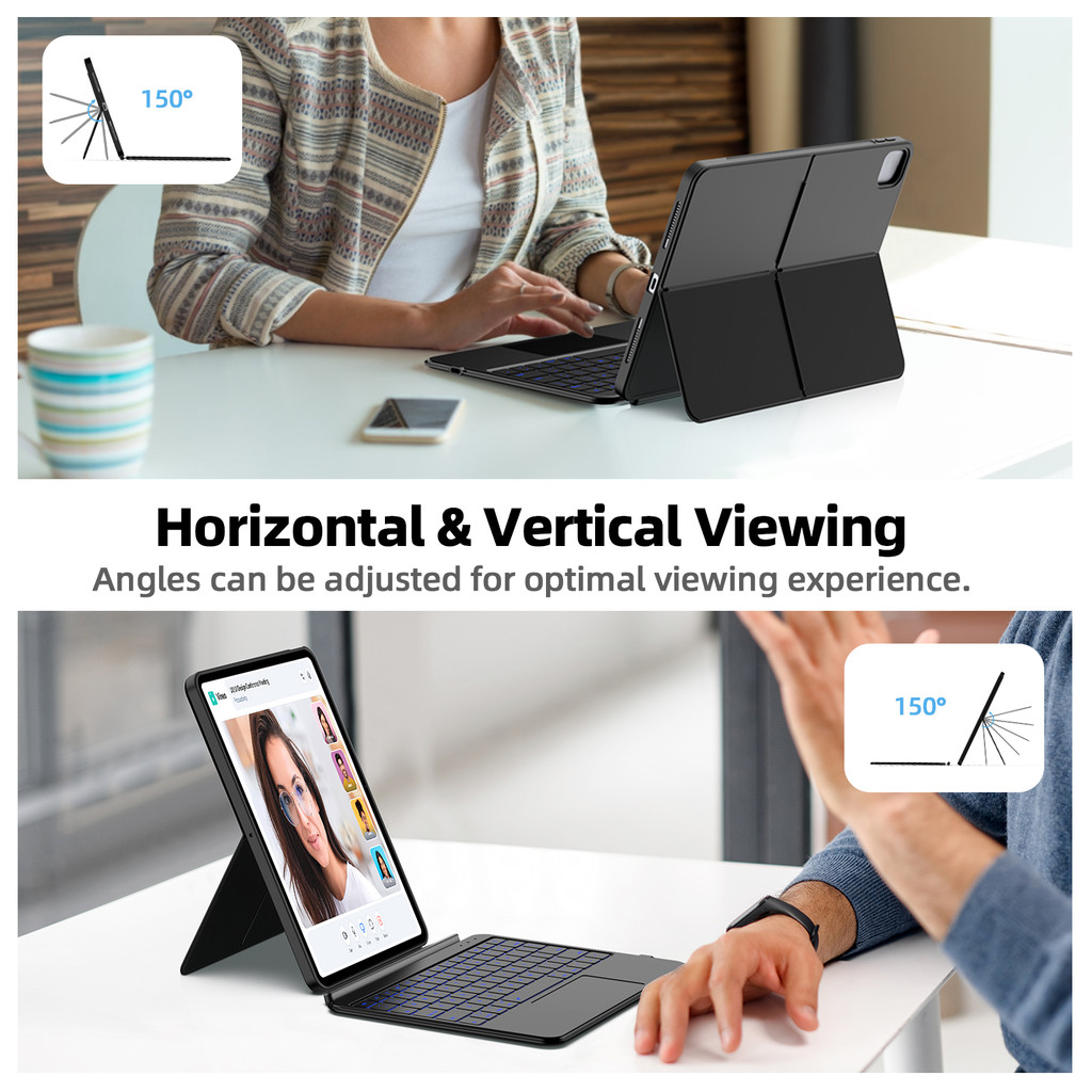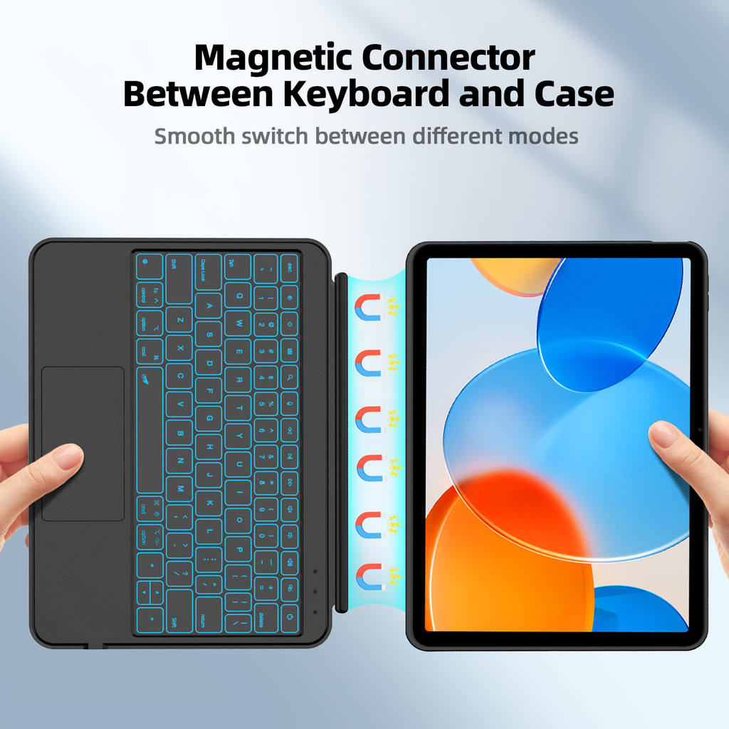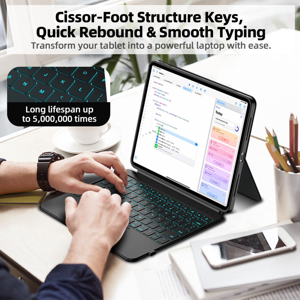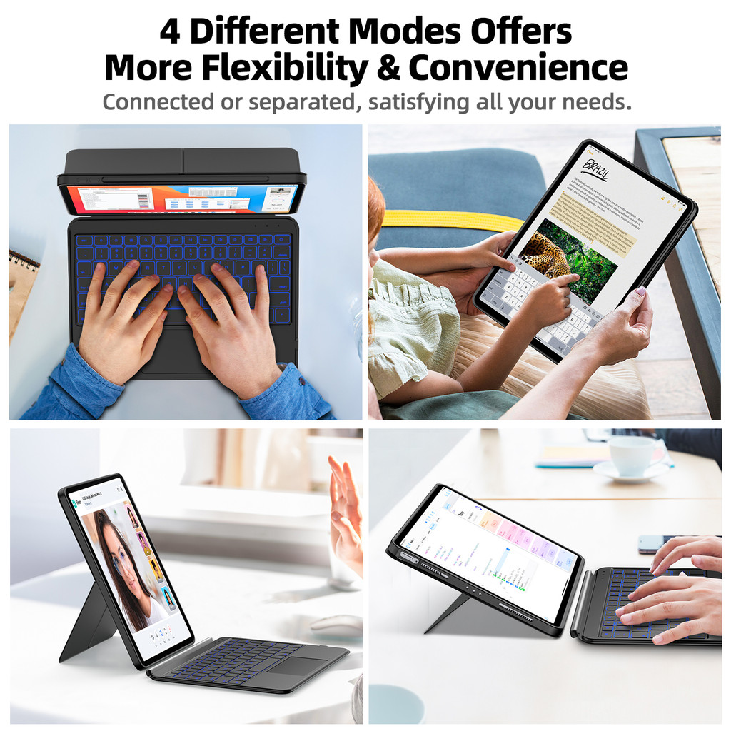“การออกแบบสองชิ้นที่ถอดออกได้: เคสแป้นพิมพ์มีขั้วต่อการดูดซับแม่เหล็กทำให้สามารถแยกแป้นพิมพ์และฝาครอบแท็บเล็ตได้อย่างง่ายดาย รองรับการปรับมุมมองทั้งแนวนอนและแนวตั้งและมีโหมดการใช้งานสี่โหมด: โหมดการพิมพ์โหมดการดูโหมดการอ่านและโหมดร่าง การสลับระหว่างโหมดต่