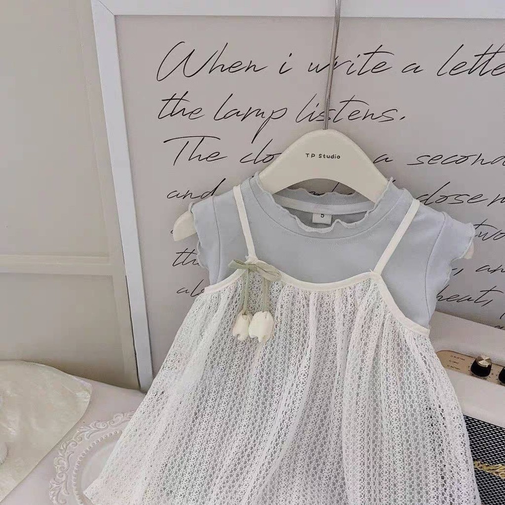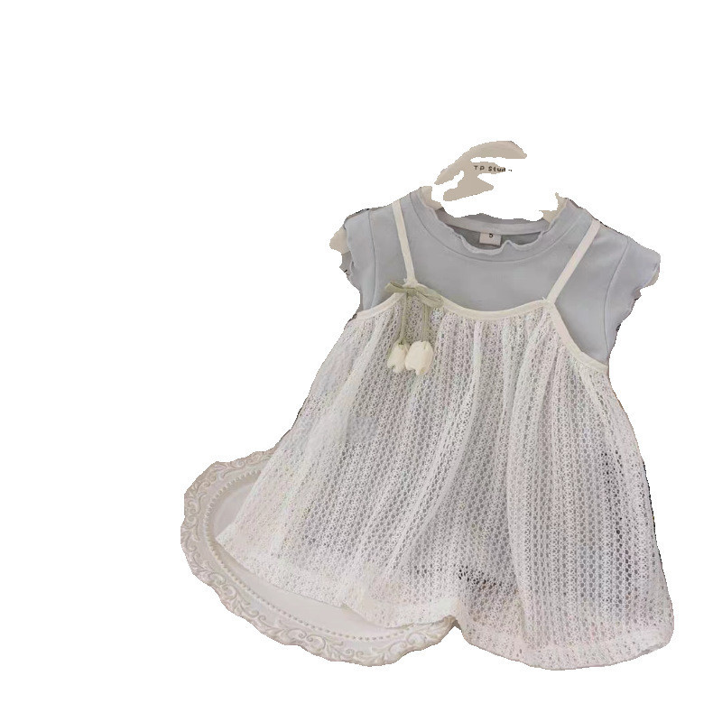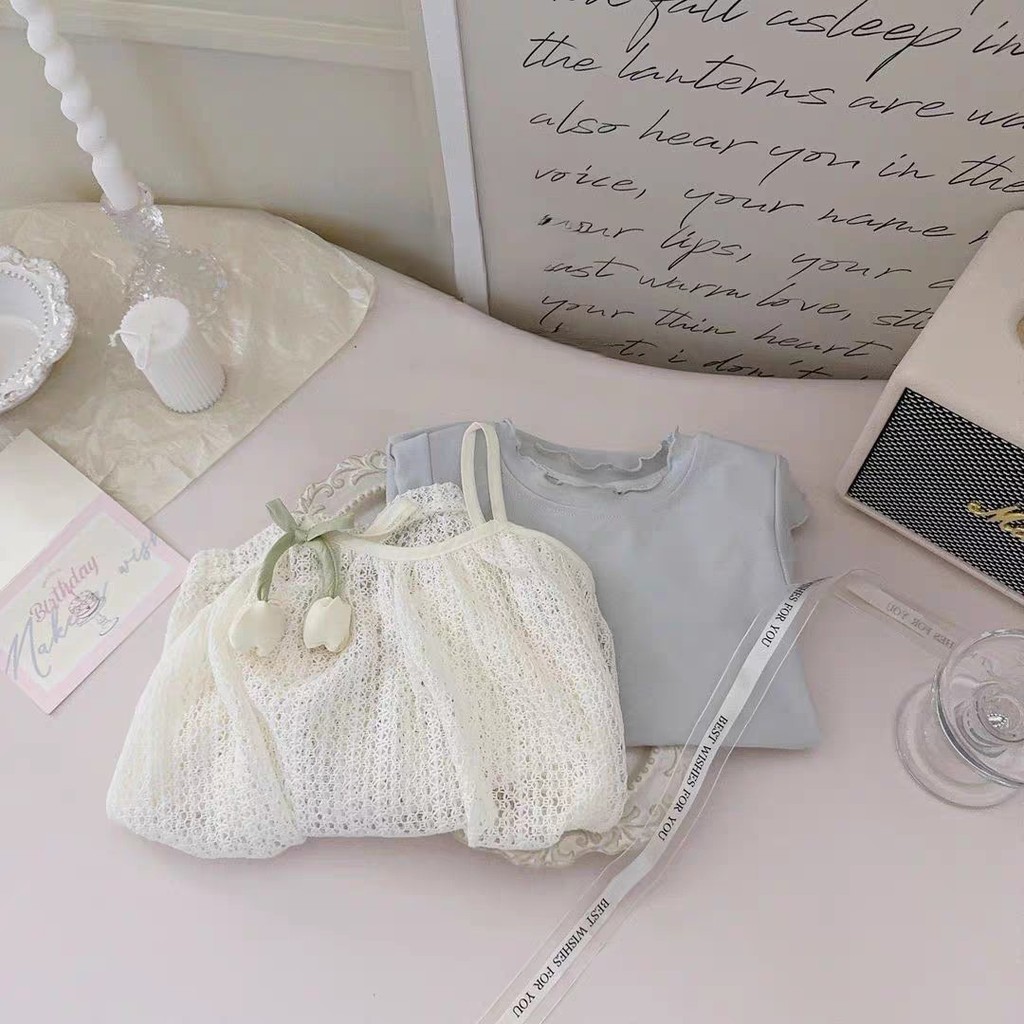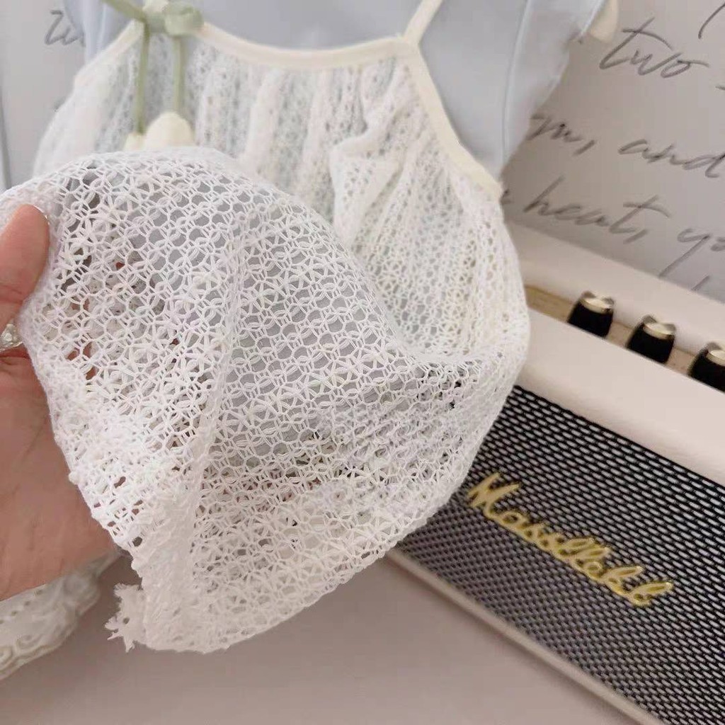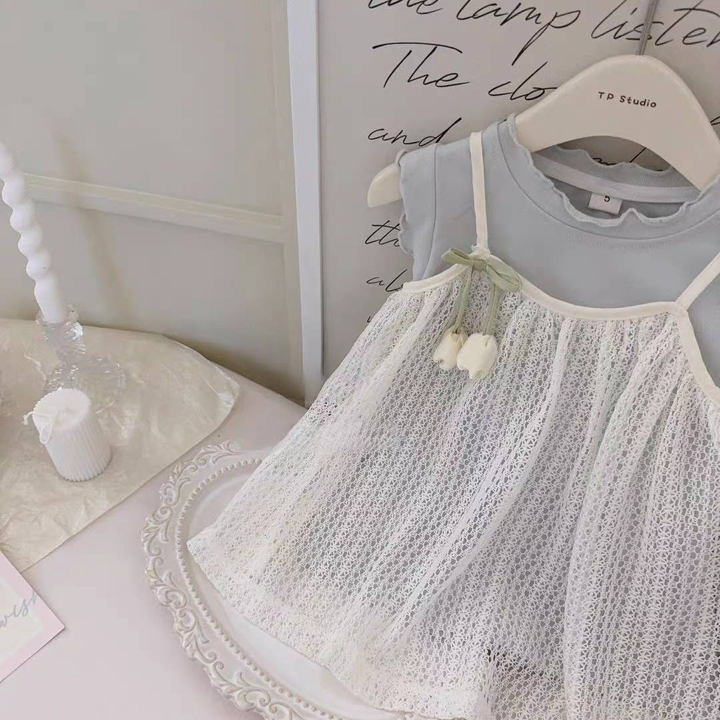 ฤดูร้อนสไตล์ใหม่เด็กสาวสีฟ้าเสื้อกั๊กชุดลูกไม้สลิงดอกทิวลิปหน่อชุดชุดสองชิ้น