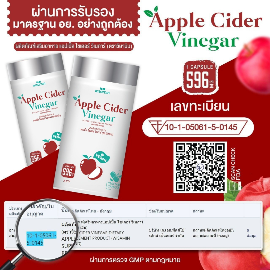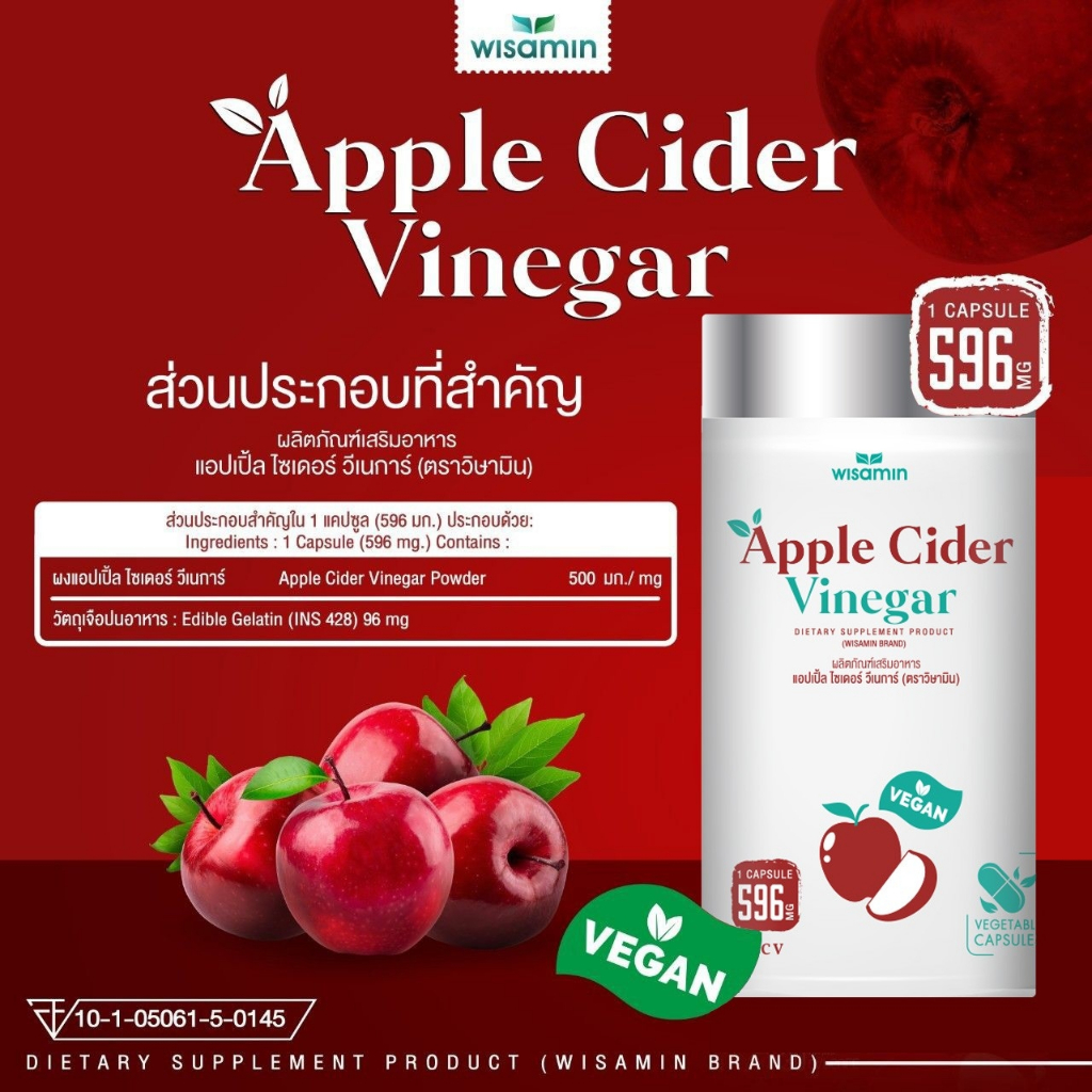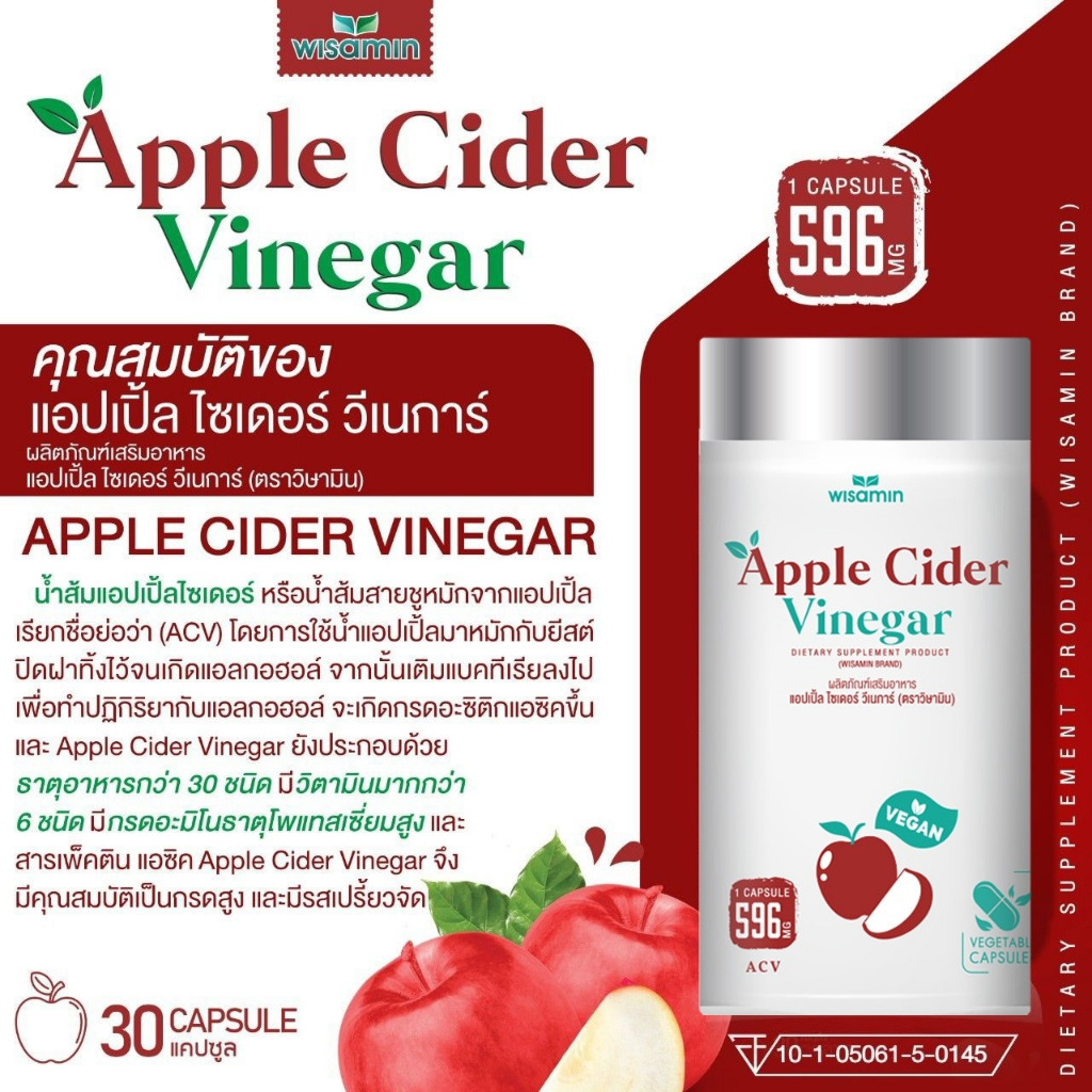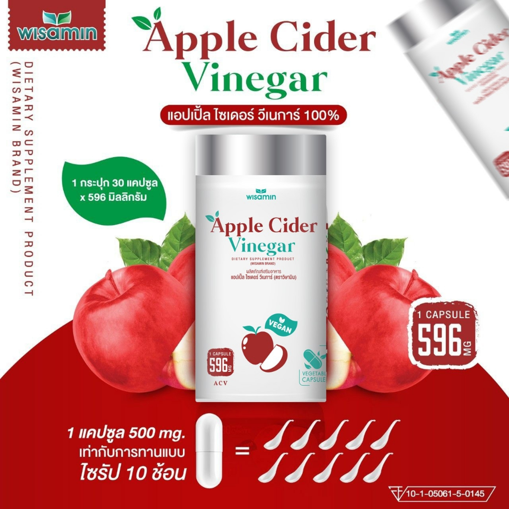 (แพคคู่ 2 กระปุก) APPLE CIDER VINEGAR แอปเปิ้ล ไซเดอร์ วีเนการ์ แคปซูล 500 mg. (ตราวิษามิน) จำนวน 2 กระปุก รวม 60 แคปซูล