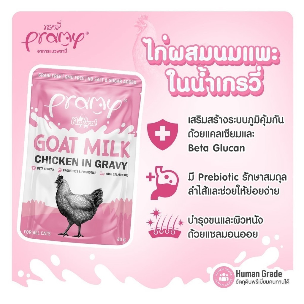 [12 ซอง] Pramy พรามี่ อาหารเปียกแมวผสมนมแพะในน้ำเกรวี่ ไม่เติมเกลือ เกรนฟรี ปราศจากธัญพืช ขนาด 60 กรัม