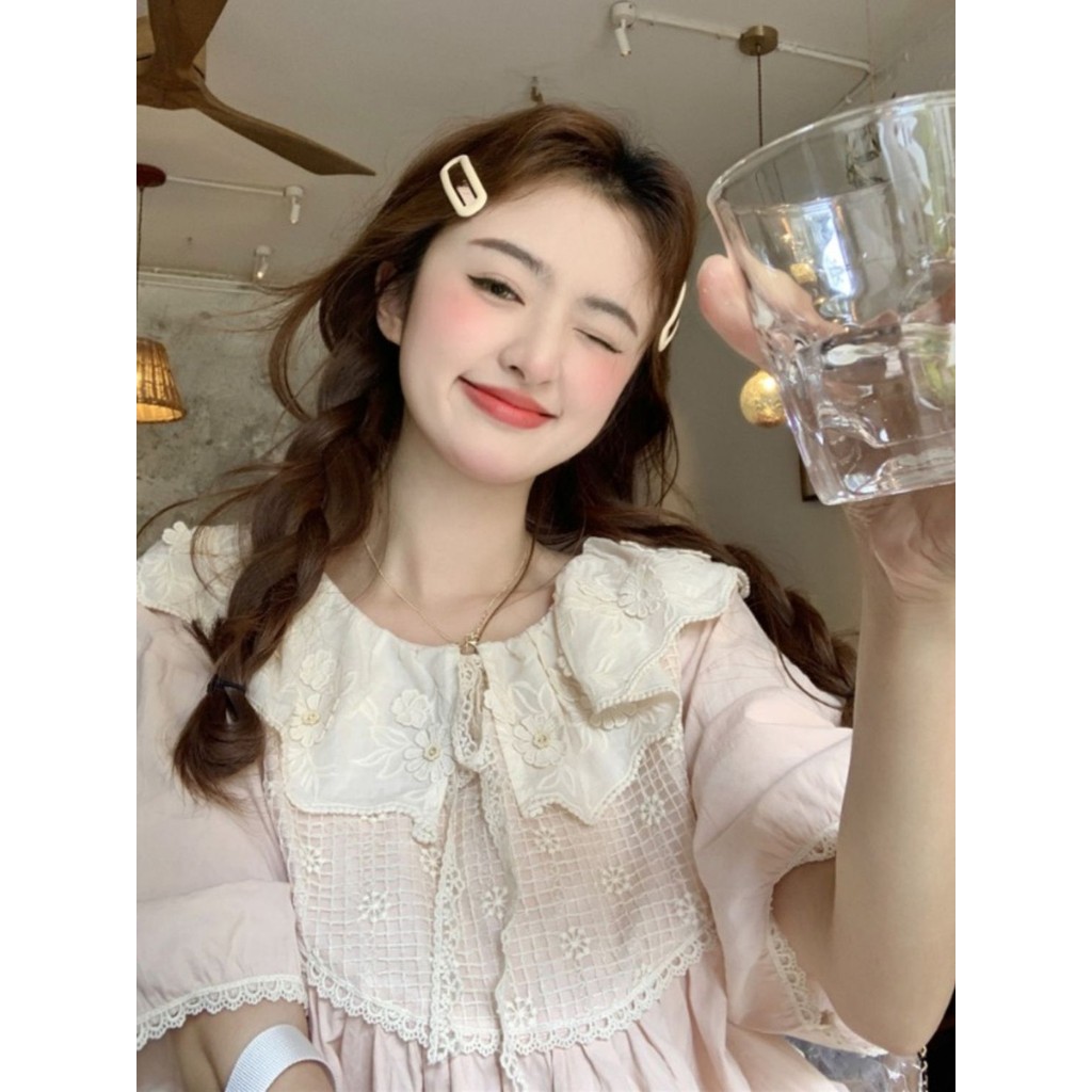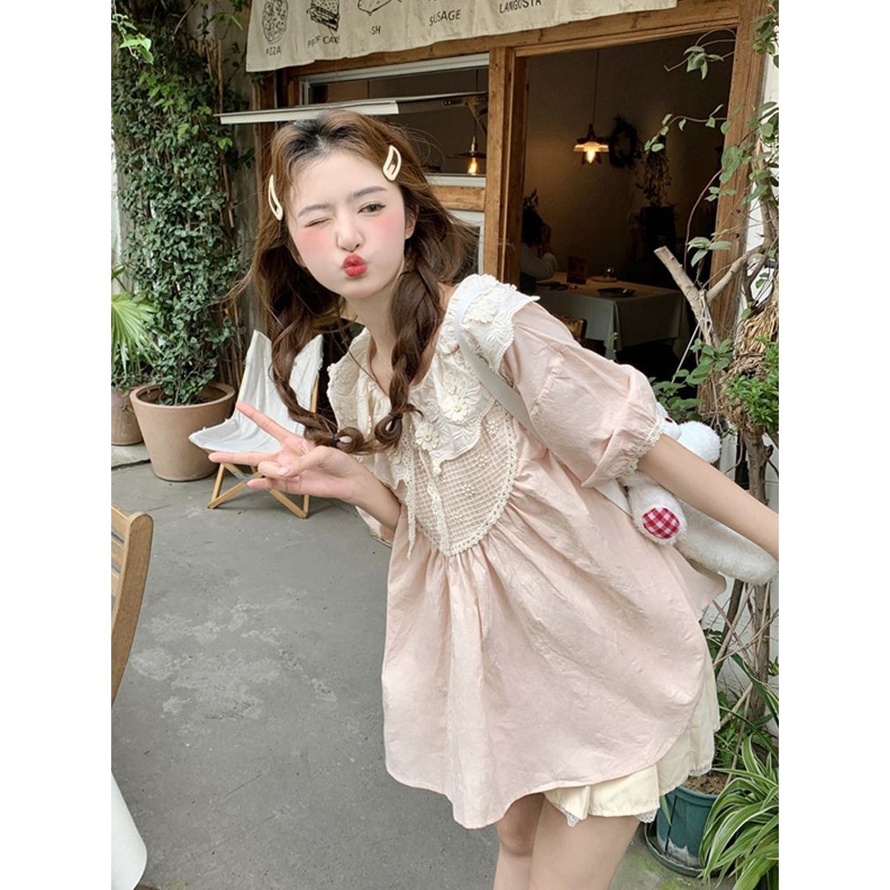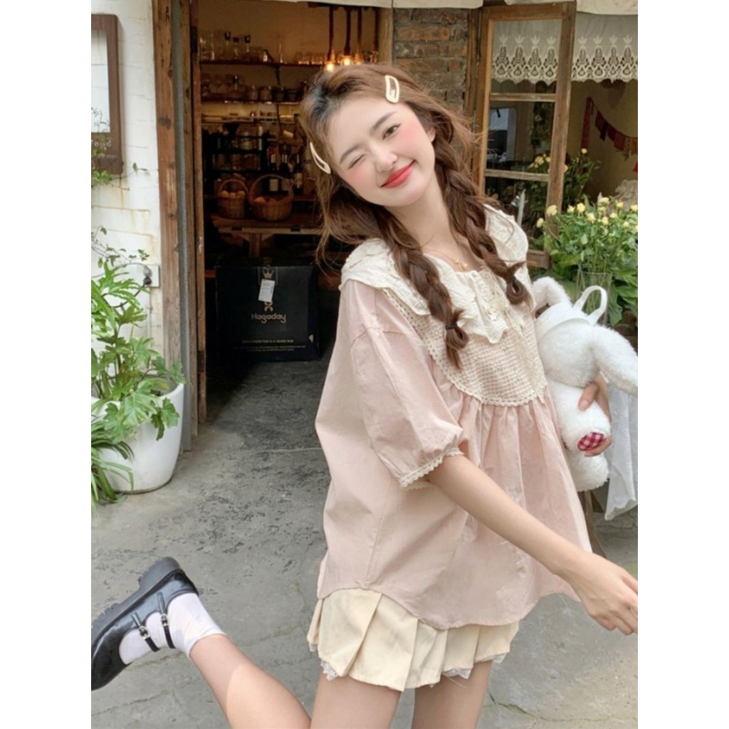 ลูกไม้ลูกไม้หวานเย็บปะติดปะต่อกันเสื้อแขนสั้นผู้หญิงฤดูร้อนขนาดบวกหลวมทั้งหมดด้านบนน้ํา All Top Tide