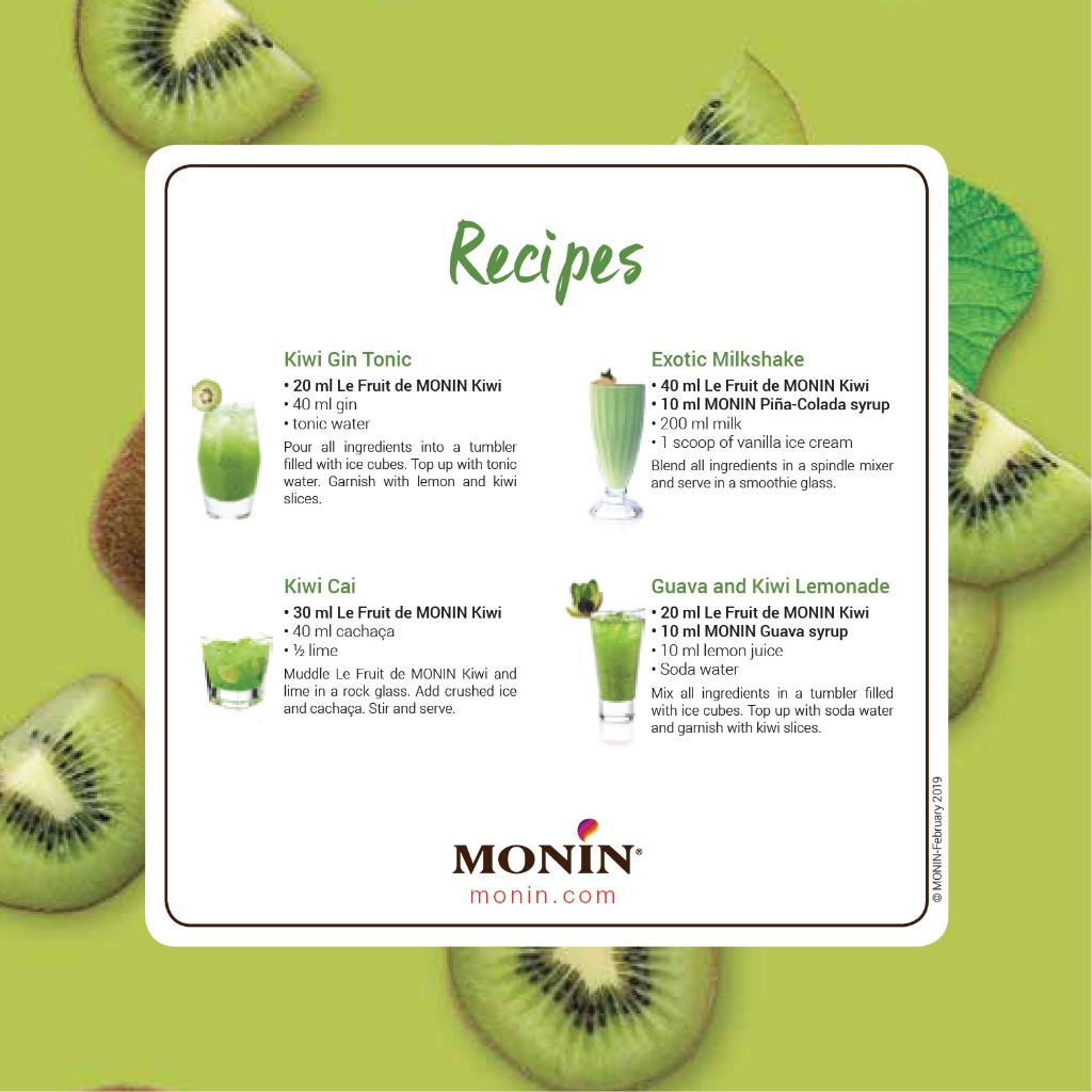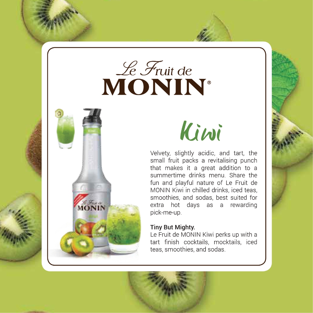 กีวี่ผลไม้ขนาดเล็ก รสชาติเปรี้ยว ให้กลิ่นหอมสดชื่น เหมาะกับการทำเมนูเครื่องดื่มในน่าร้อน เพิ่มความสนุกสนานและความคิดสร้างสรรค์เมนูใหม่ๆ Kiwi Monin Fruit Mix เหมาะสำหรับเครื่องดื่ม ชา สมูทตี้ โซดา สำหรับวันพักร้อนท