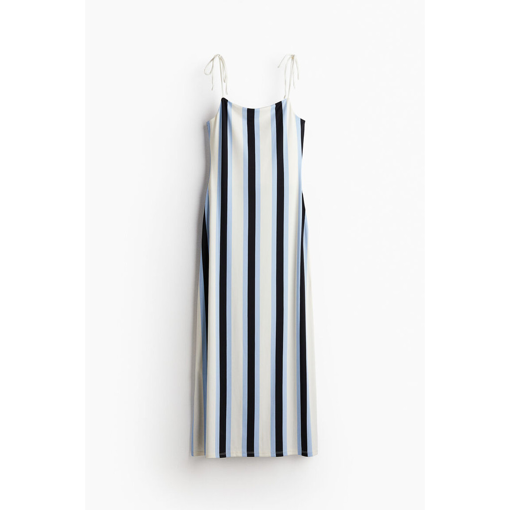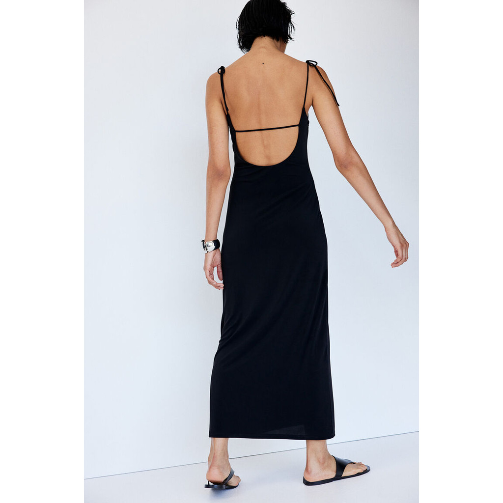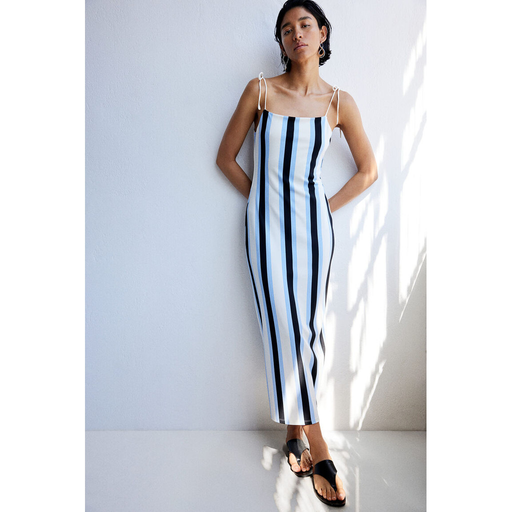 เดรสยาวระดับน่อง ตัดเย็บจากผ้ายืด คอตรง มีสายบ่าสปาเก็ตตี้แบบผูกด้านบน และเว้าโค้งลึกด้านหลังมีสายผูกแนวนอนเส้นเล็ก ท่อนบนมีซับใน