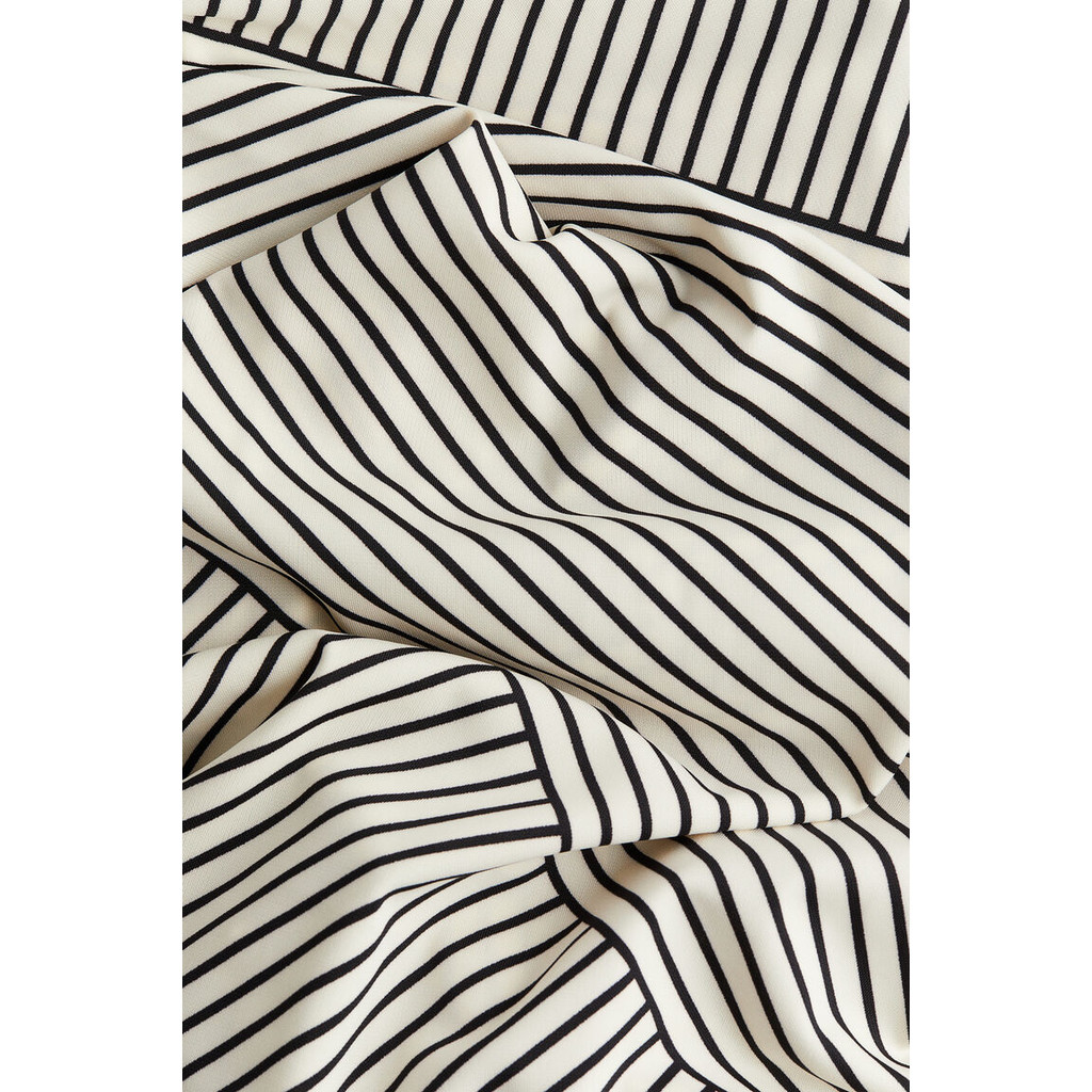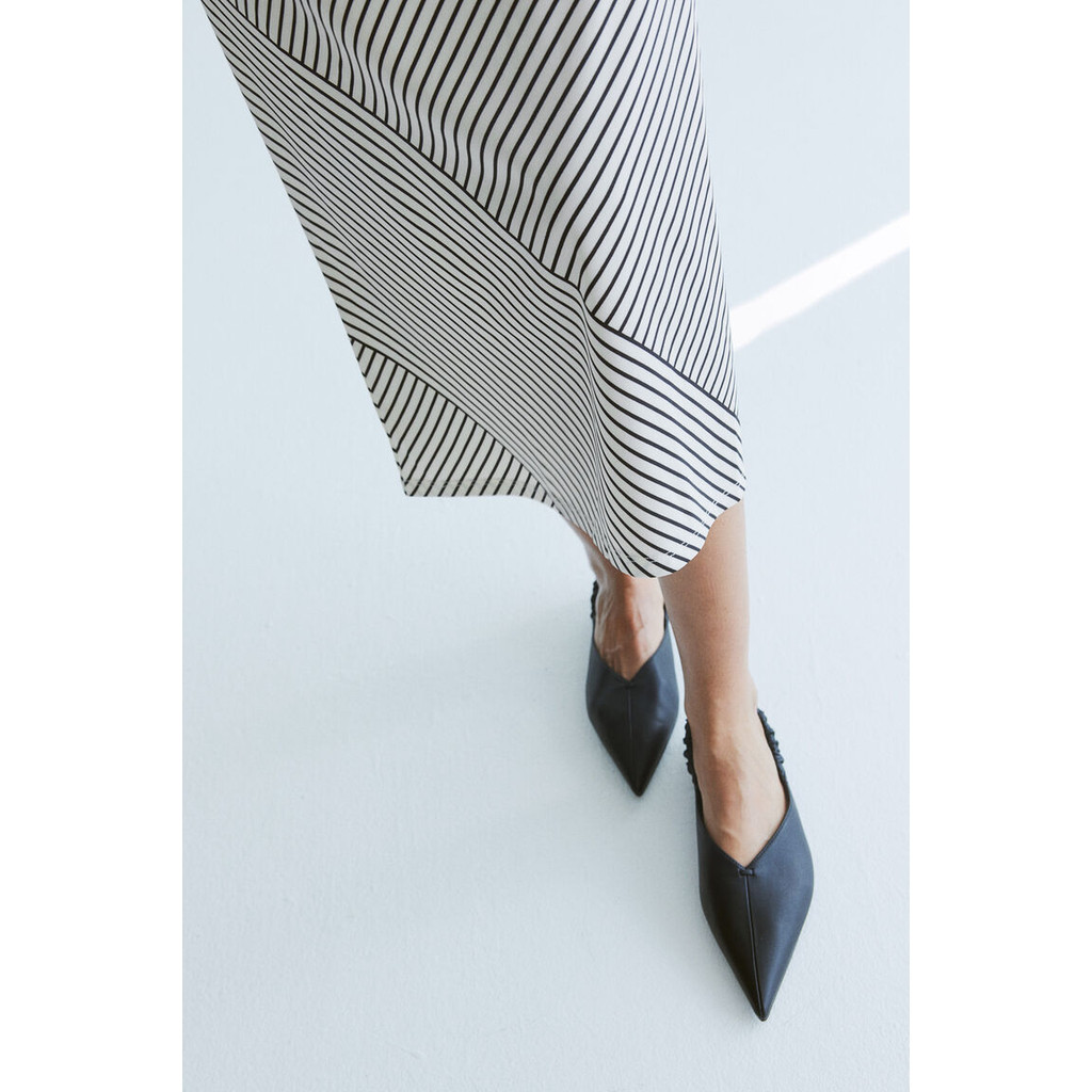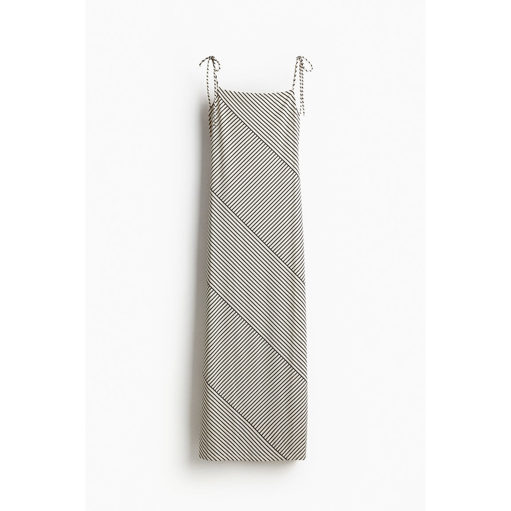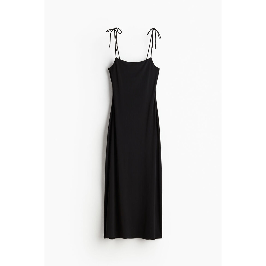เดรสยาวระดับน่อง ตัดเย็บจากผ้ายืด คอตรง มีสายบ่าสปาเก็ตตี้แบบผูกด้านบน และเว้าโค้งลึกด้านหลังมีสายผูกแนวนอนเส้นเล็ก ท่อนบนมีซับใน