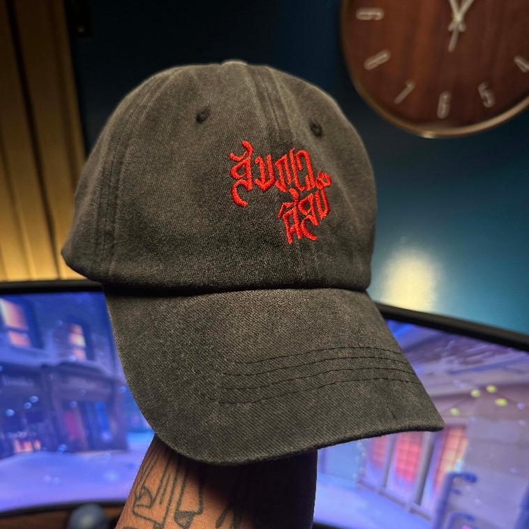 หยิบใส่ตะกร้าหมวกแก็ป สีผ้าฟอก งานปักโลโก้ สัมภเวศิลป์