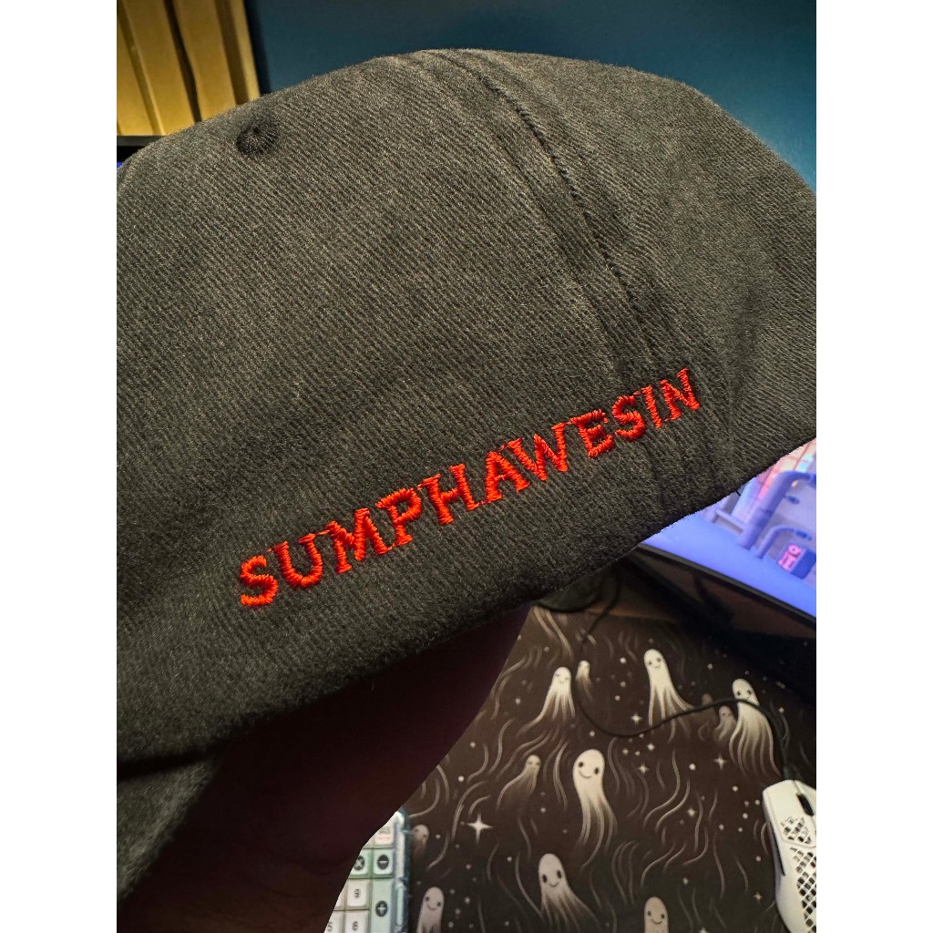 หมวกแก้ปสัมภเวศิลป์แบบผ้าฟอก มีโลโก้เป็นงานปักอยู่ด้านหน้า ด้านข้างปัก SUMPHAEWSIN