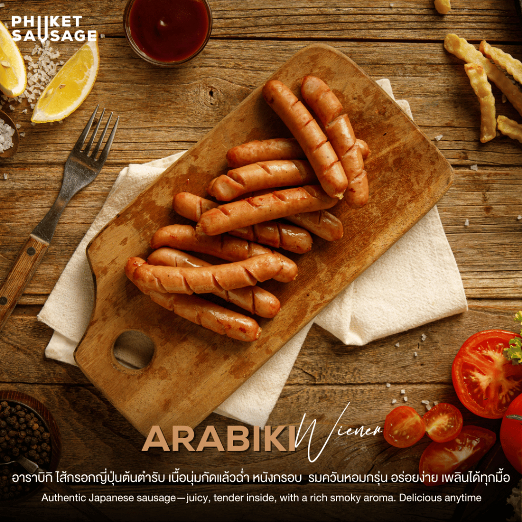 อาราบิกิ ไส้กรอกสูตรต้นตำรับจากญี่ปุ่นแท้ๆ ผลิตจากเนื้อหมูคุณภาพเยี่ยม ผสมผสานเครื่องเทศหอมเฉพาะตัว รมควันหอมกรุ่น หนังกรอบนอกนุ่มใน เคี้ยวเพลินทุกคำ อร่อยจนต้องร้องว้าว! พร้อมอร่อยง่ายๆ อุ่นร้อนนิดหน่อยก็อร่อยแล้ว สะดวกสำหรับทุ