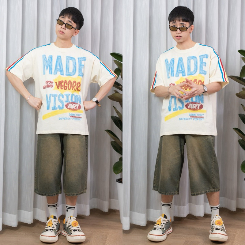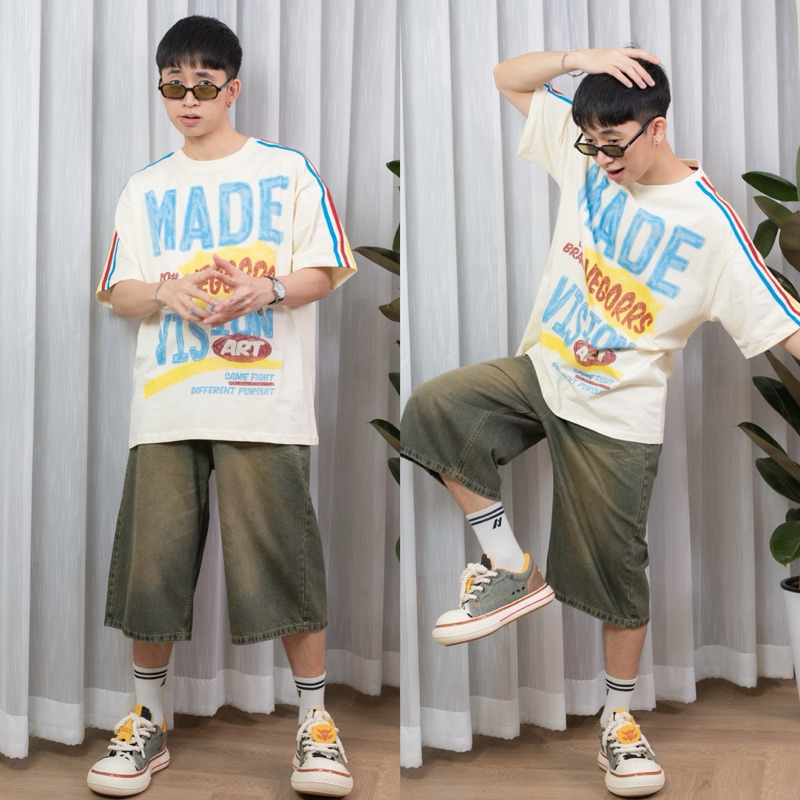 เสื้อยืดแขนสั้นทรงโอเวอร์ไซส์ รุ่นนี้เป็นผ้าคอตตอนโพลี แต่งลายแถบไหล่ สกรีนลายด้านหน้า สีสันน่ารักแต่ชิคเท่