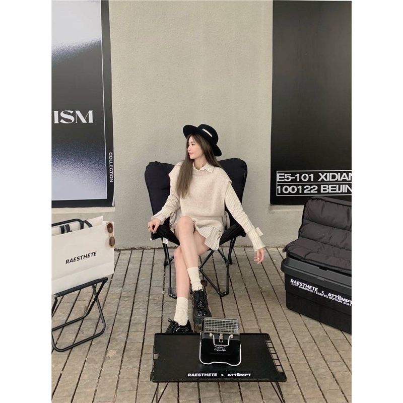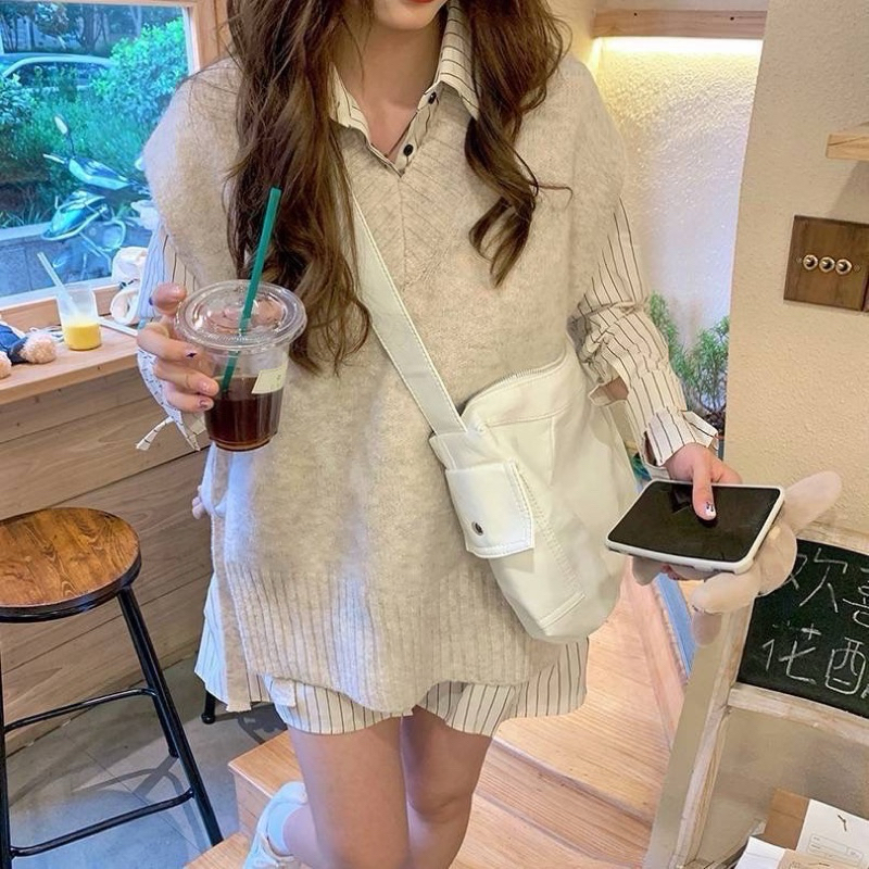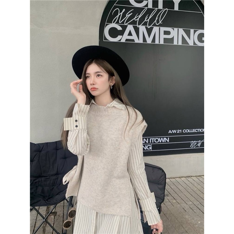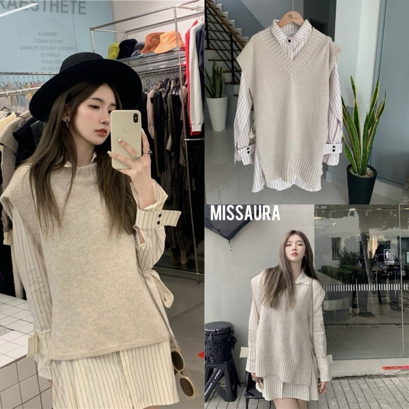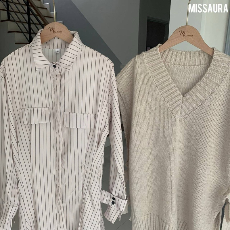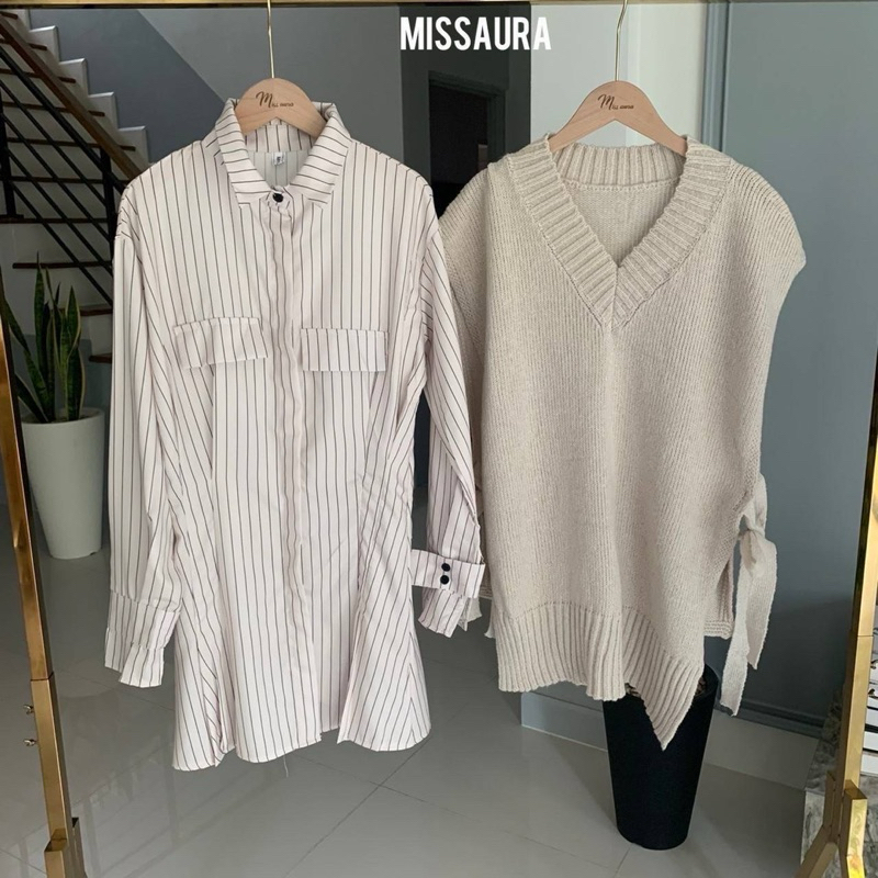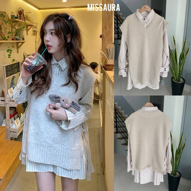 Detail : Set 2 ชิ้น เดรสเชิ๊ตลายริ้วกระดุมหน้ามาพร้อมเดรสกั๊กไหมพรมโทนสีครีมละมุนมาก