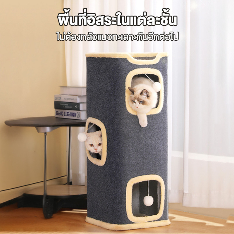 ใช้การออกแบบรูปทรงกระบอก มีโครงสร้างที่มั่นคง และใช้พื้นที่ได้มาก การออกแบบสามชั้นช่วยให้แมวมีพื้นที่กิจกรรมที่กว้างขวาง ตอบสนองความต้องการของแมวหลากหลายข