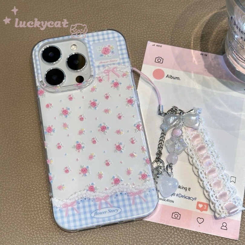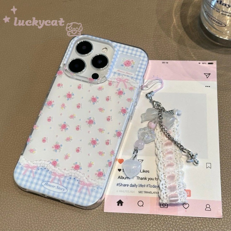 Iphone 16 15 14 13 12 11 Pro Max X Xr Xs Max 7 8 Plus SE2020 เคสโทรศัพท์ Ins Blue Checkered สีชมพู Rose Bow รูปแบบ Clear Soft + Lanyard ฝาหลัง