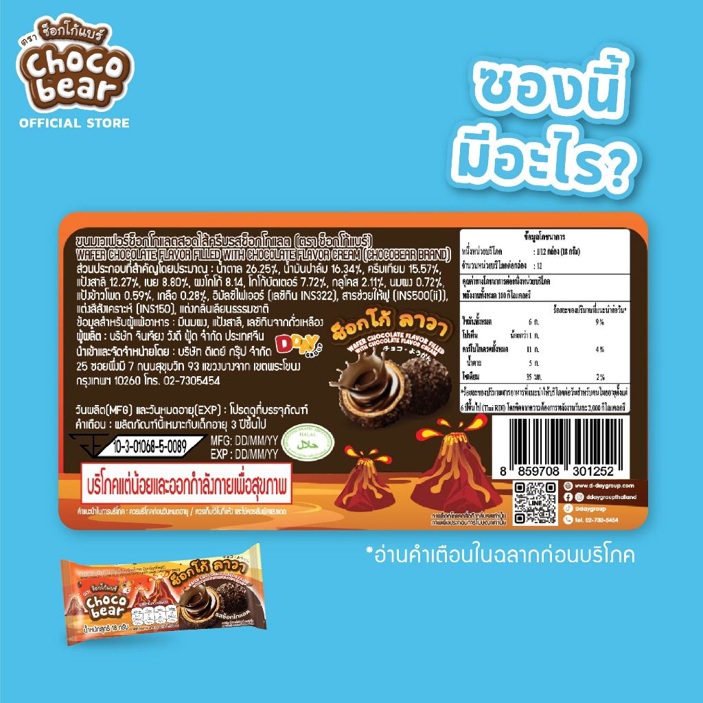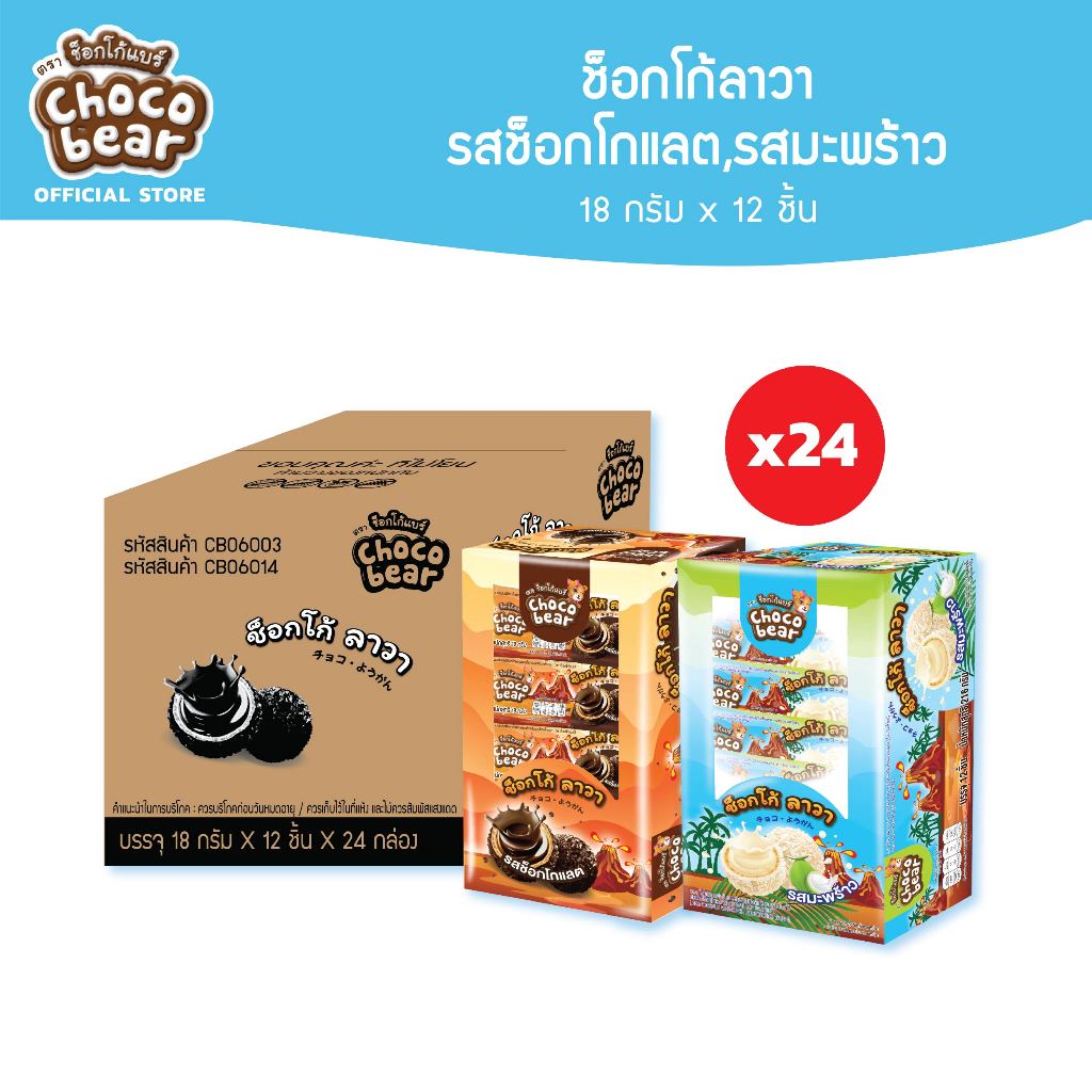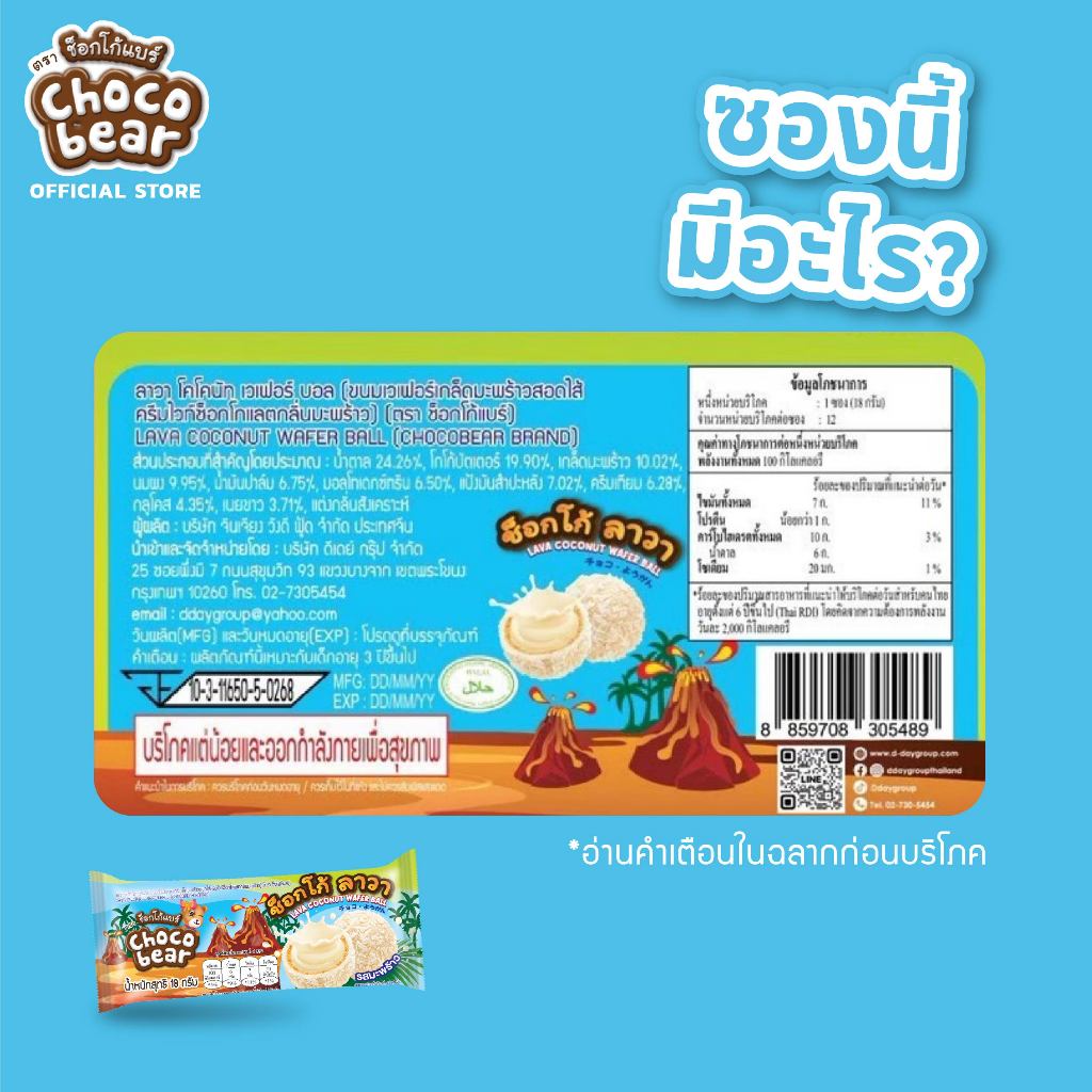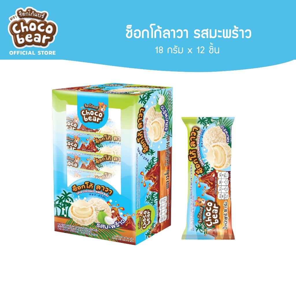 ลาวา ช้อคโกแลต เวเฟอร์ บอล (ตรา ช็อกโก้แบร์) เวเฟอร์ กรุบกรอบ เป็นวงกลม คล้ายลูกบอล เคลือบช็อกโกแลต สอดไส้ครีมช็อกโกแลตเข้มข้นแบบอัดเต็ม คัดสรรจากวัตถุดิบชั้นดี รสชาติกลมกล่อม กรอบนอก ครีมล้น หอมหวานมัน อร่อยถูกใจ 18g x 12 pcs x 24 boxes เลขที่ อย.10-3-01
