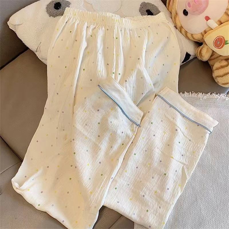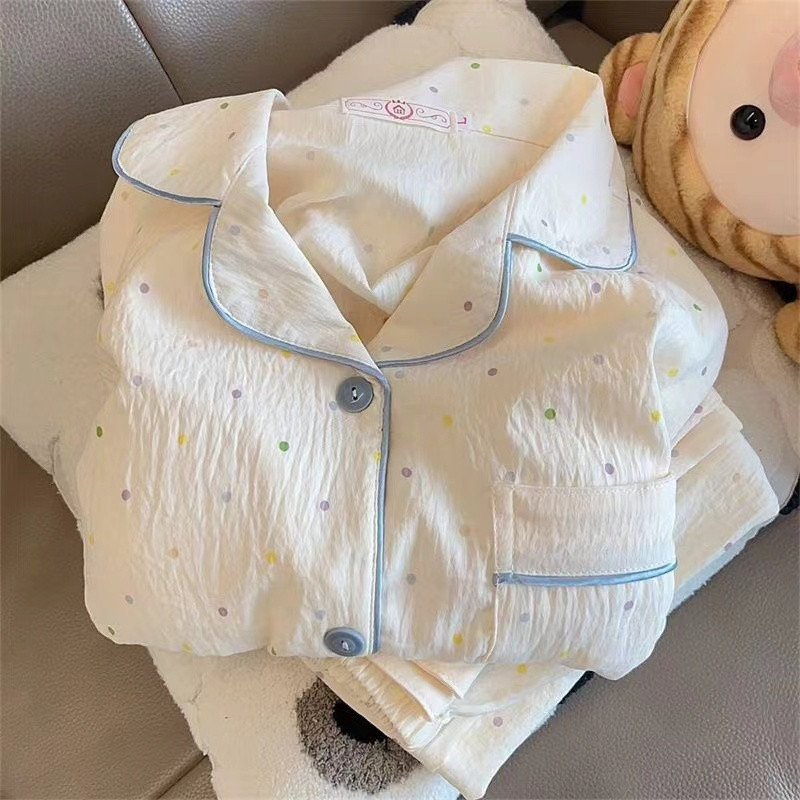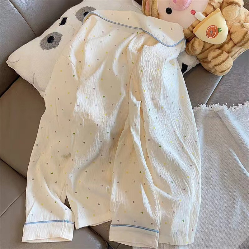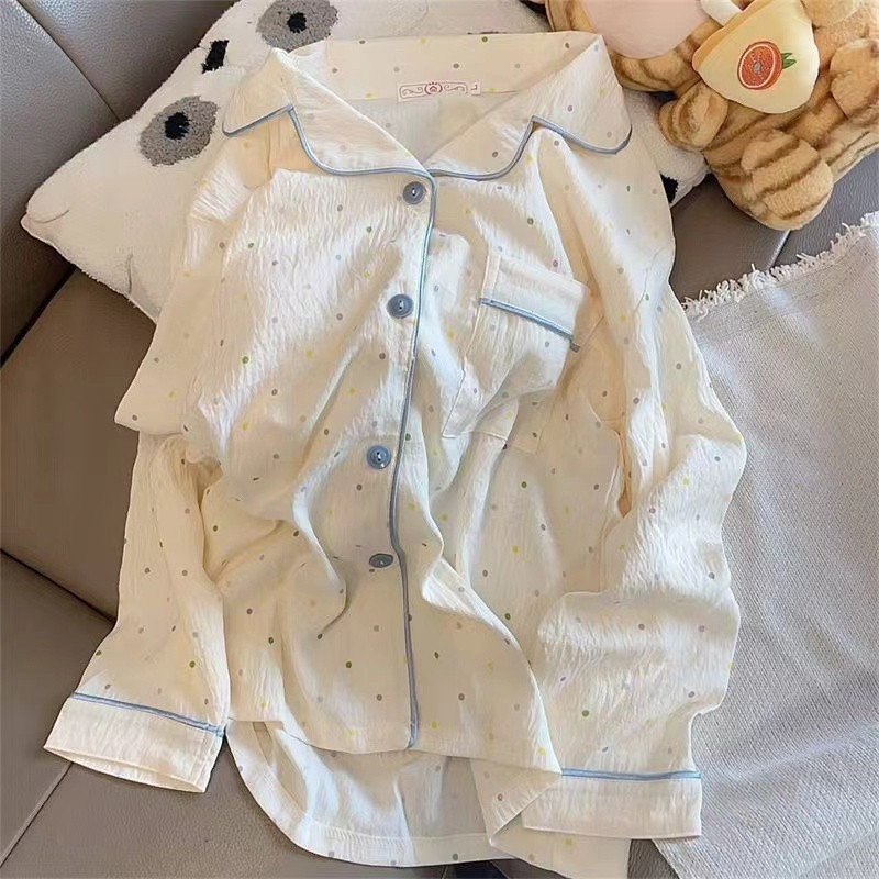 FDS Yunduo ชุดนอนผ้าฝ้ายผู้หญิงกางเกงขายาวคาร์ดิแกนแอปริคอทลายจุดหวานฤดูใบไม้ร่วงนักเรียนชุดบริการที่บ้าน