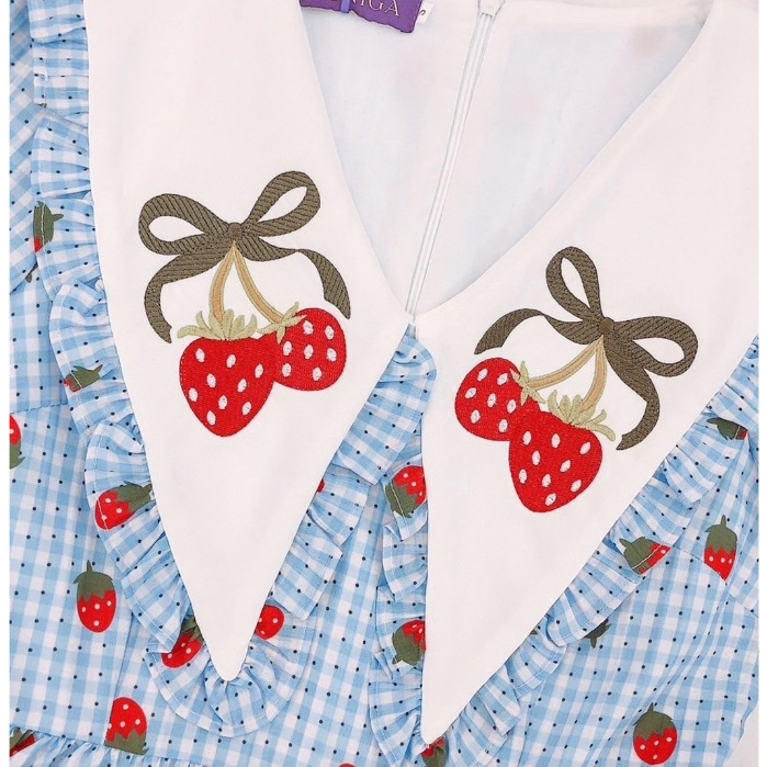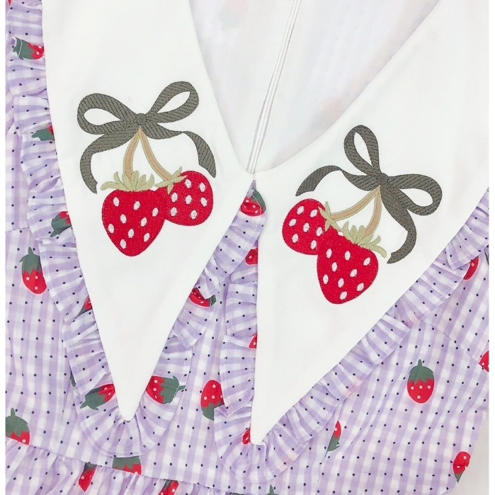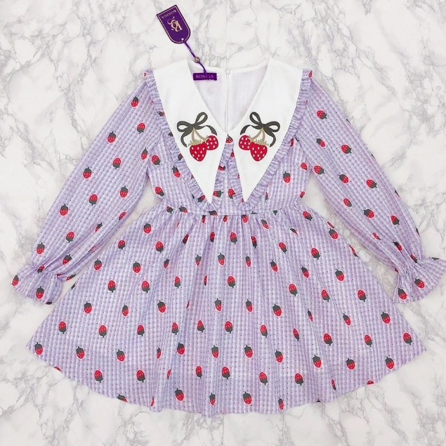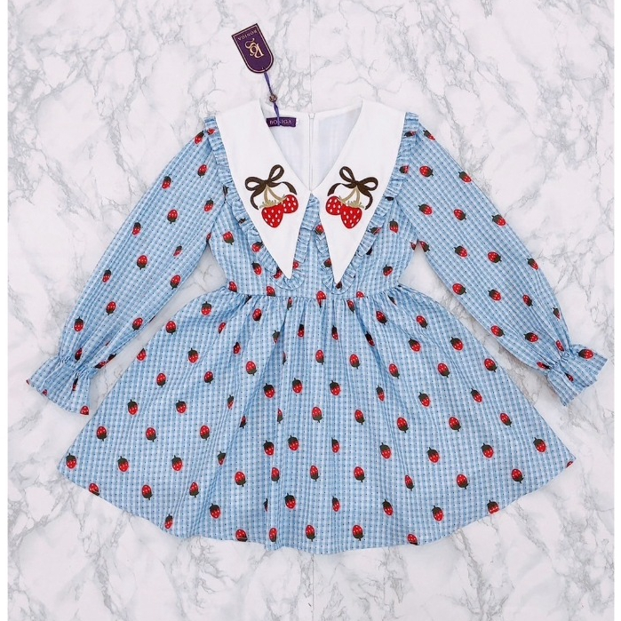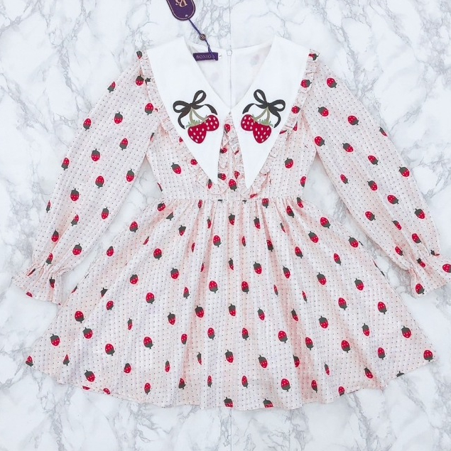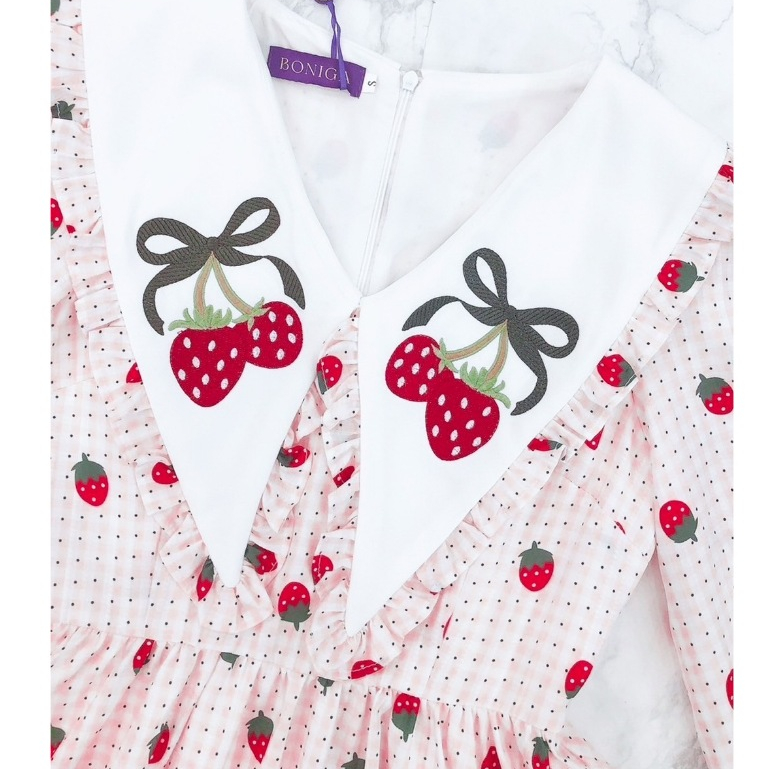 (มี3XL) Boniga มี 3 สี Chippy Berry Dress เดรสผ้าคอตตอนลายสตอเบอร์รี่ปกงานปัก แขนยาวปลายสม็อคแต่งระบาย ซิปหลัง มีซับใน